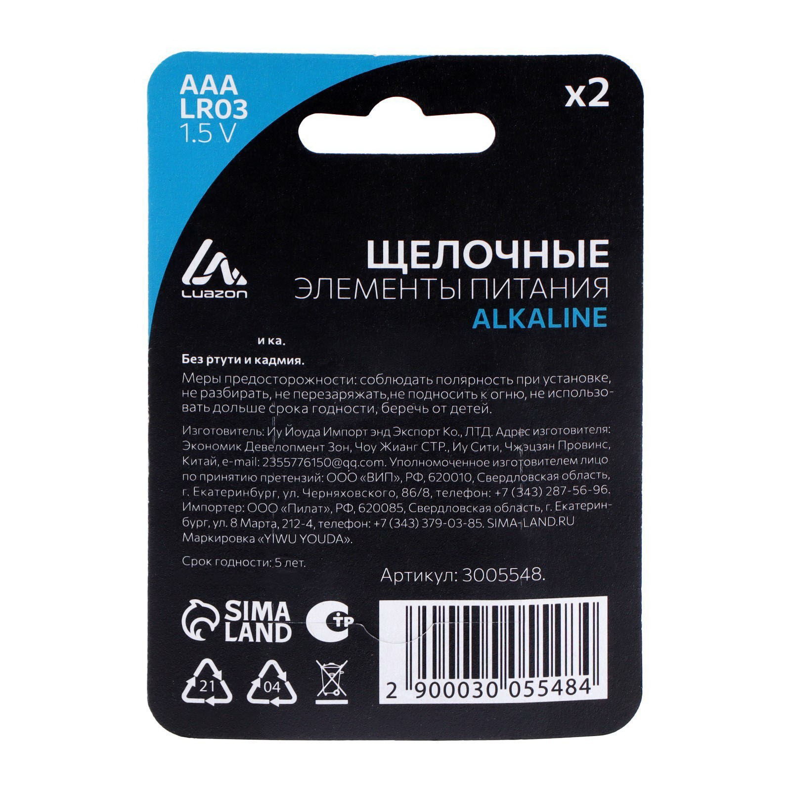 Батарейка алкалиновая, 1.4x1.4x5 см., Luazon Home, Китай