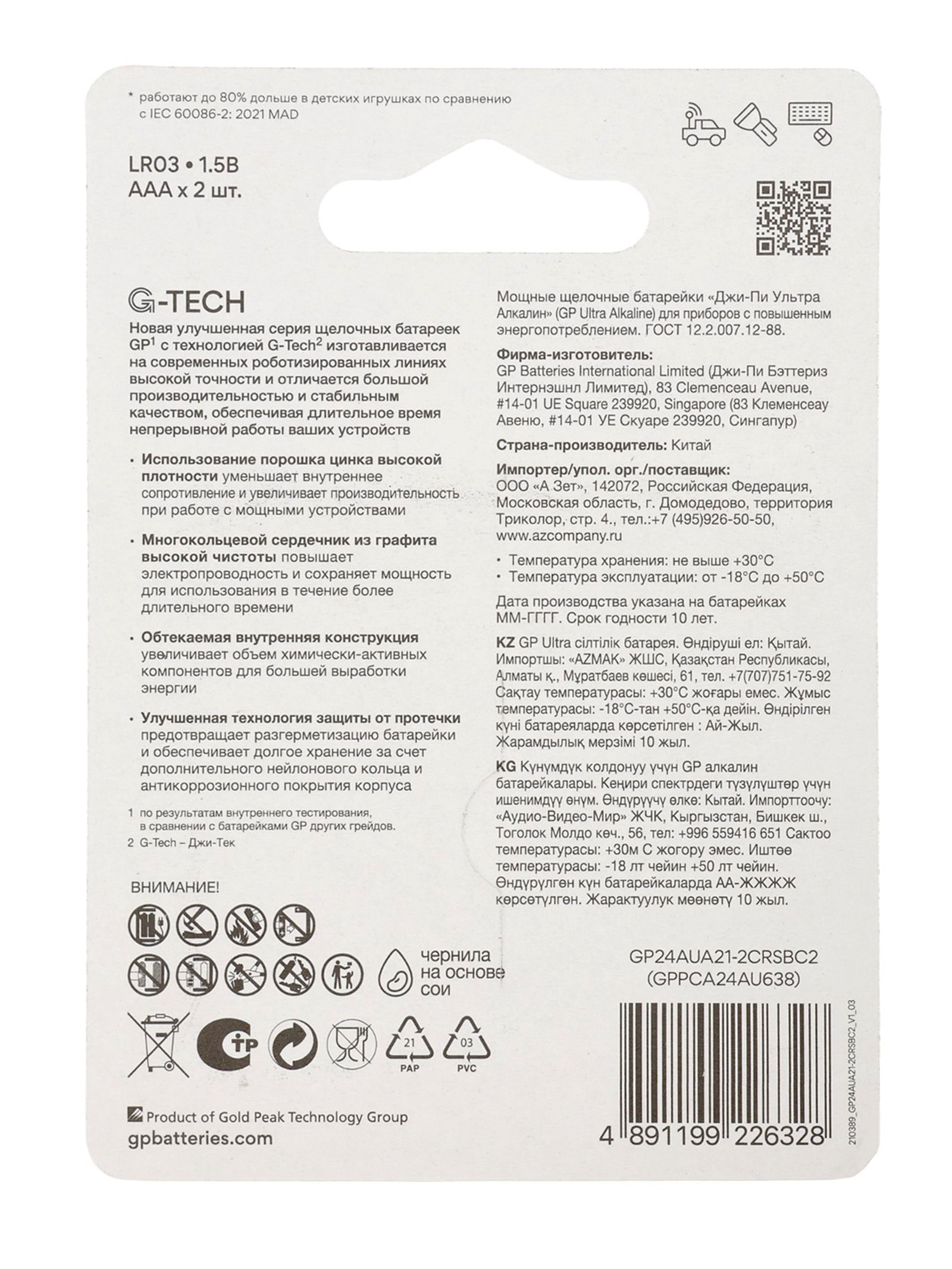 Размер упаковки: 8.5 x 1 x 12 см. Вид упаковки: Блистер Типоразмер батареек: AAA (LR03) Тип батарейки: Алкалиновая В упаковке, шт.: 2 Напряжение, В: 1.5 Напряжение, В: 1.5 tnved: 8506101000 Срок хранения, лет: 5 Температура эксплуатации, °C: От -10 до 50 °C Температура хранения и транспортировки: От 0 до +30 ℃ Гарантийный срок, мес.: 12 Батарейки типоразмера ААА широко используют в беспроводных электронных устройствах: аудиоплеерах, радиоприёмниках, фотоаппаратах. Помимо широкой сферы применения, такие элементы питания отличаются малыми габаритами: их удобно хранить дома с запасом, а также брать в походы и путешествия.Используйте щелочные батарейки с любыми устройствами: от тех, которые не создают долговременных и интенсивных нагрузок, до потребляющих значительный ток. Это могут быть как пульты дистанционного управления для ТВ, калькуляторы, часы, так и фотовспышки, радиоуправляемые модели. Срок хранения этих элементов питания составляет от 3 до 5 лет. | ||