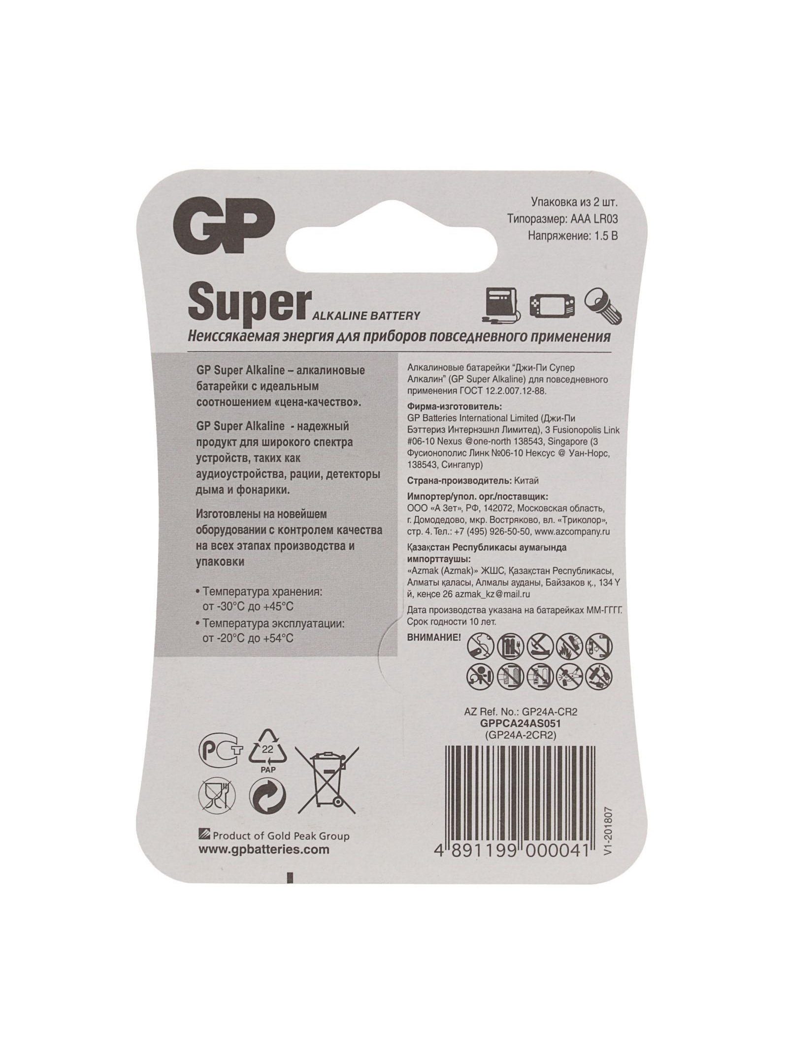 Батарейка алкалиновая Super, AAA, LR03-2BL, 1.5В, блистер, 2 шт., 1x1x4.3 см., GP, Китай