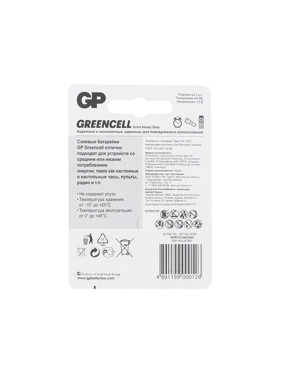 Батарейка солевая Greencell Extra Heavy Duty, AA, R6-2BL, 1.5 В, блистер, 2 шт., 4x5x1 см., GP, Китай