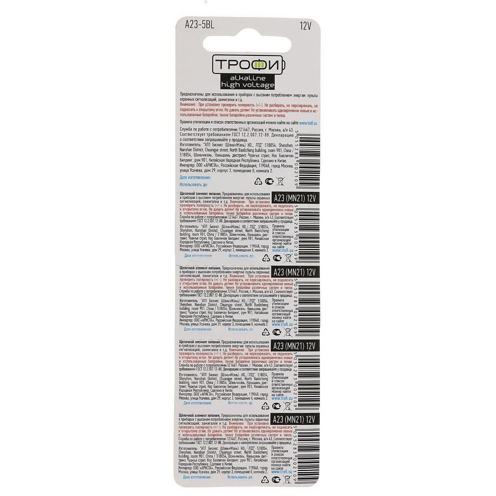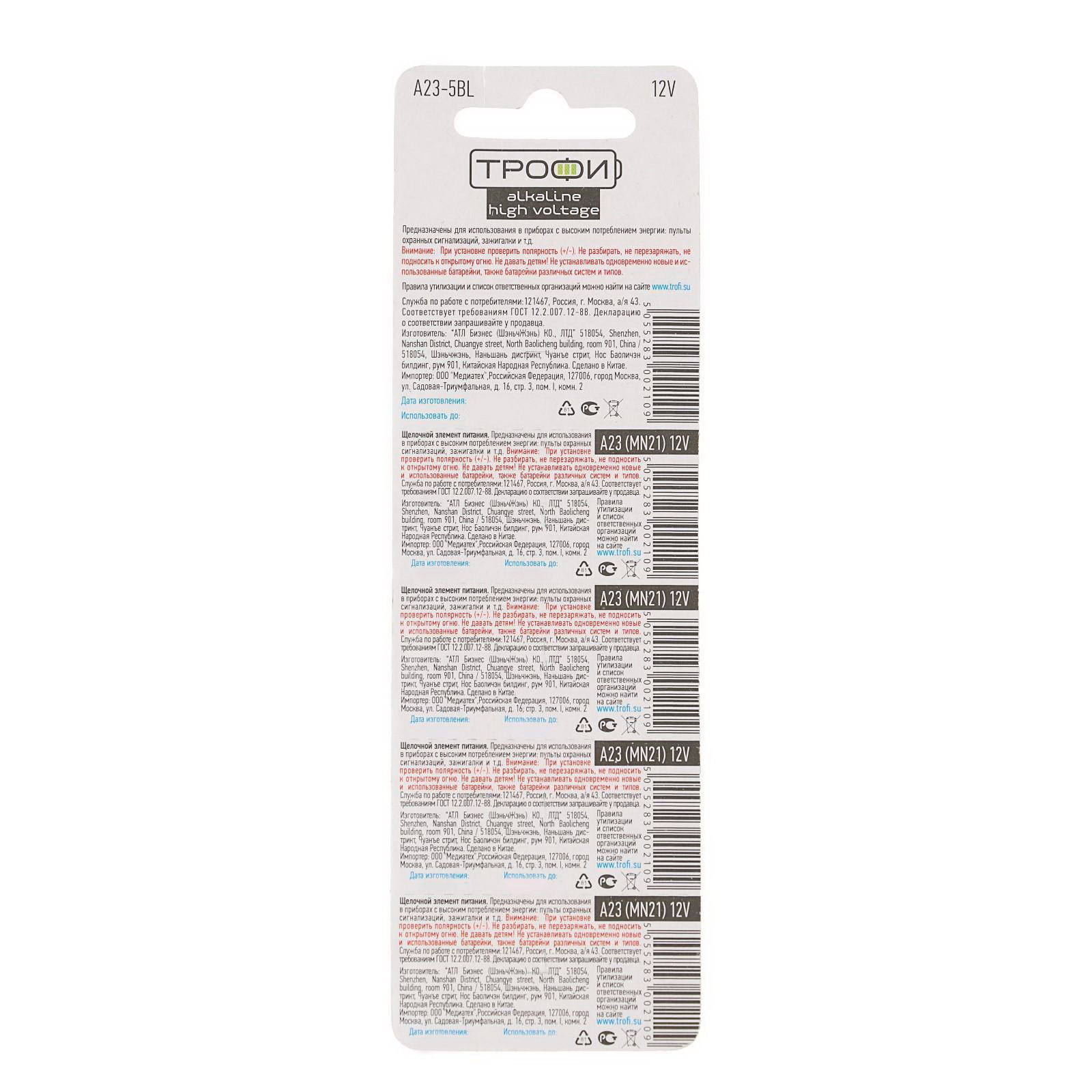 Батарейка алкалиновая Alkaline, А23, 1x18x3 см., Трофи, Китай