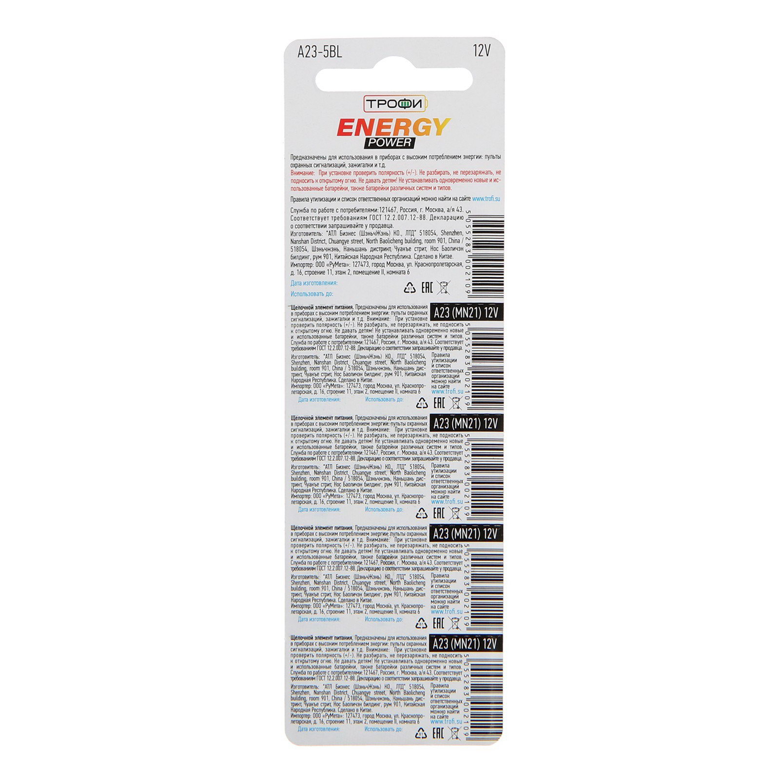 Размер упаковки: 5 x 1 x 16 см. Типоразмер батареек: MN21 (A23, K23A, LRV08, LRV8) Вид упаковки: Блистер Тип батарейки: Алкалиновая В упаковке, шт.: 5 tnved: 8506101000 tnved: 8506101000 Напряжение, В: 12 Температура хранения и транспортировки: От +5 до +30 ℃ Температура эксплуатации, °C: От -10 до 60 °C Срок хранения, лет: 5 Батарейки типоразмера А23 используют в миниатюрных электронных девайсах, которые требуют напряжения питания 12 В. Это пульты дистанционного управления, брелоки автосигнализации, бесконтактные ключи, зажигалки. Элементы меньше батареек AAA: их применяют в самых компактных приборах. По типу электролита они являются щелочными, поэтому подходят для любых устройств: от тех, которые не создают долговременных и интенсивных нагрузок, до потребляющих значительный ток. Одна такая батарейка состоит из 8 кнопочных элементов (обычно LR932). Срок хранения составляет от 3 до 5 лет. | ||