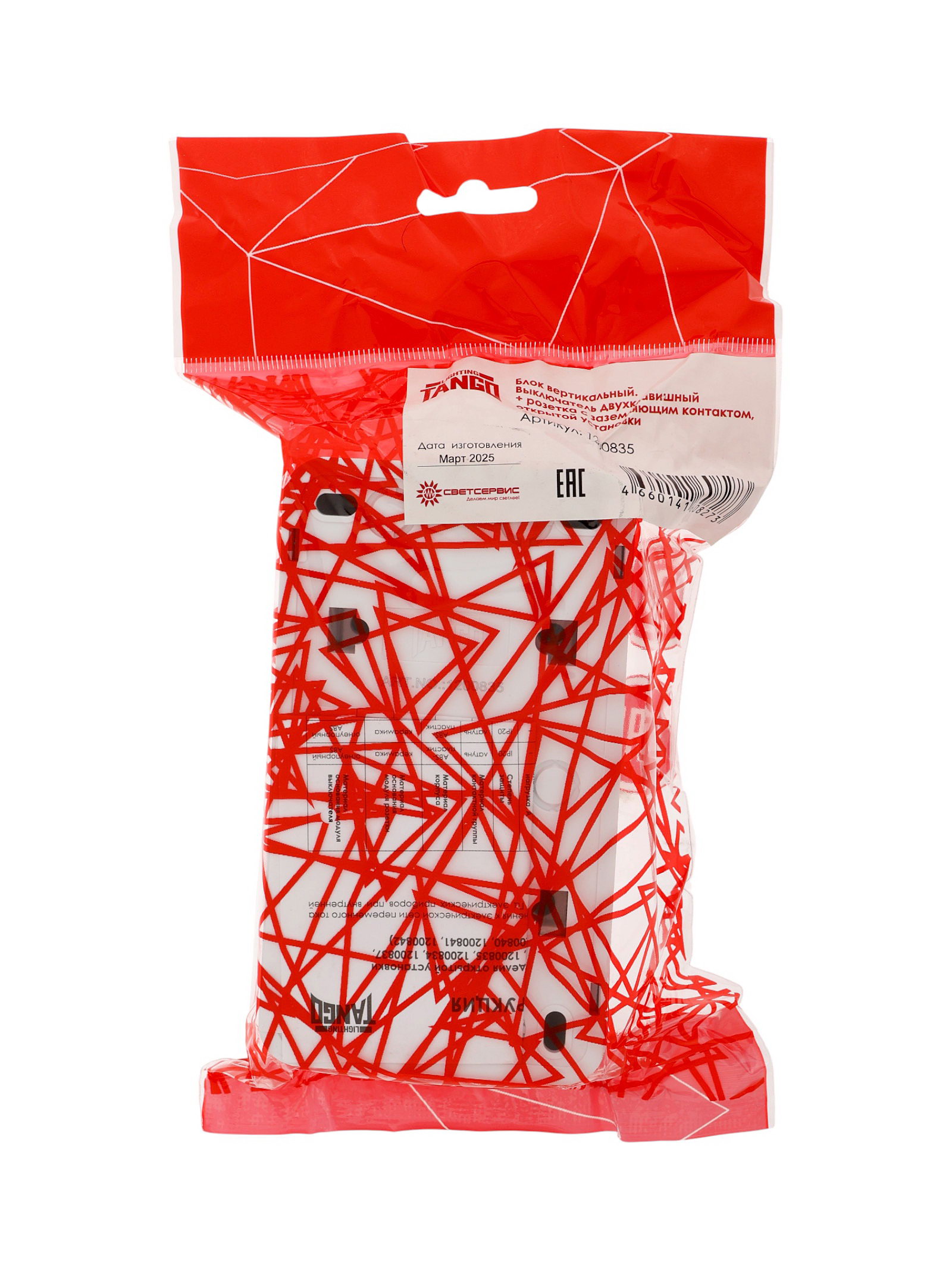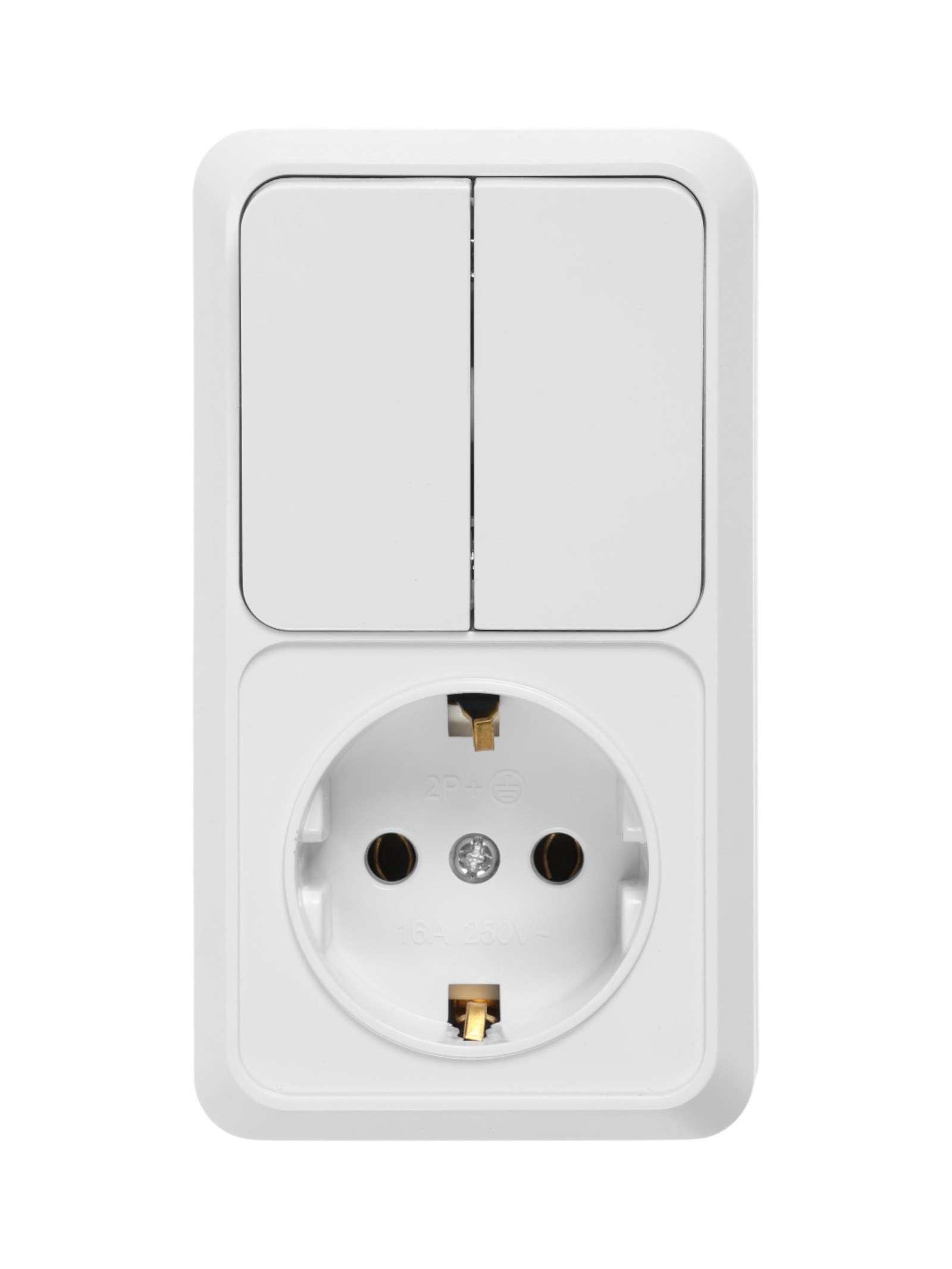 Выключатель двухклавишный с розеткой 16 А, IP20, вертикальный, с заземлением, белый, Tango, Китай