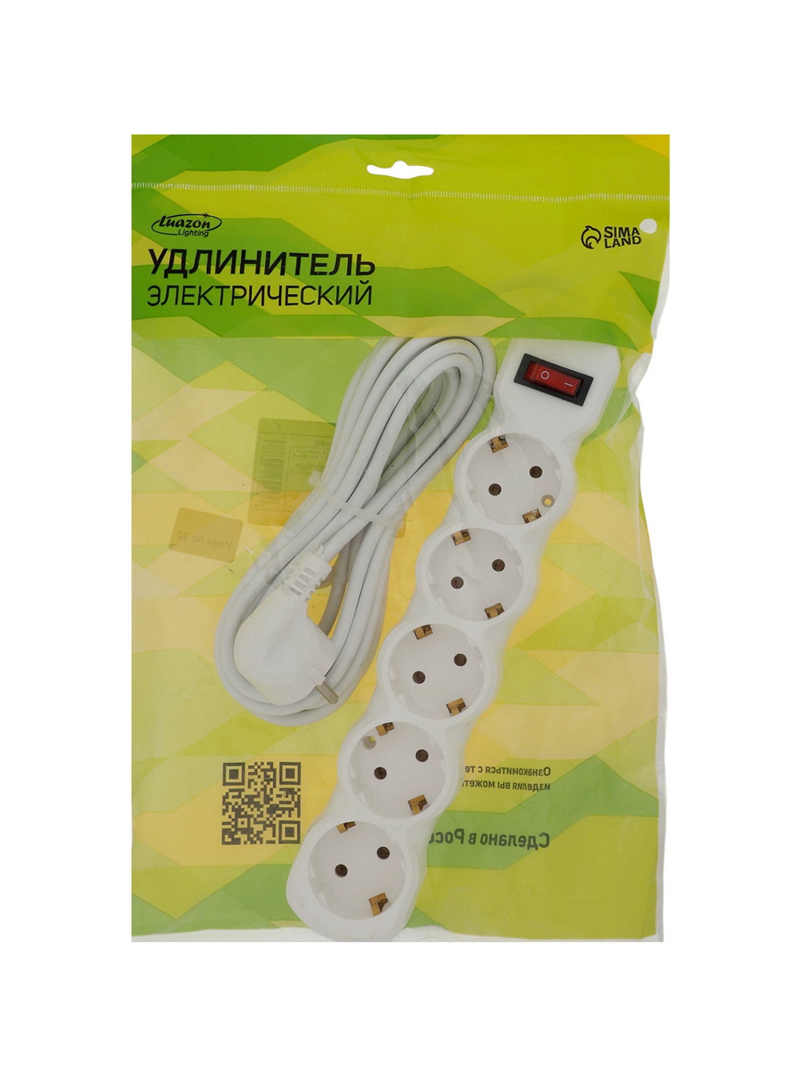 Удлинитель ECO, 5 розеток, 5 м, 10 А, 2200 Вт, ПВС 3x0.75 мм2, с заземлением, белый, Luazon Lighting, Россия