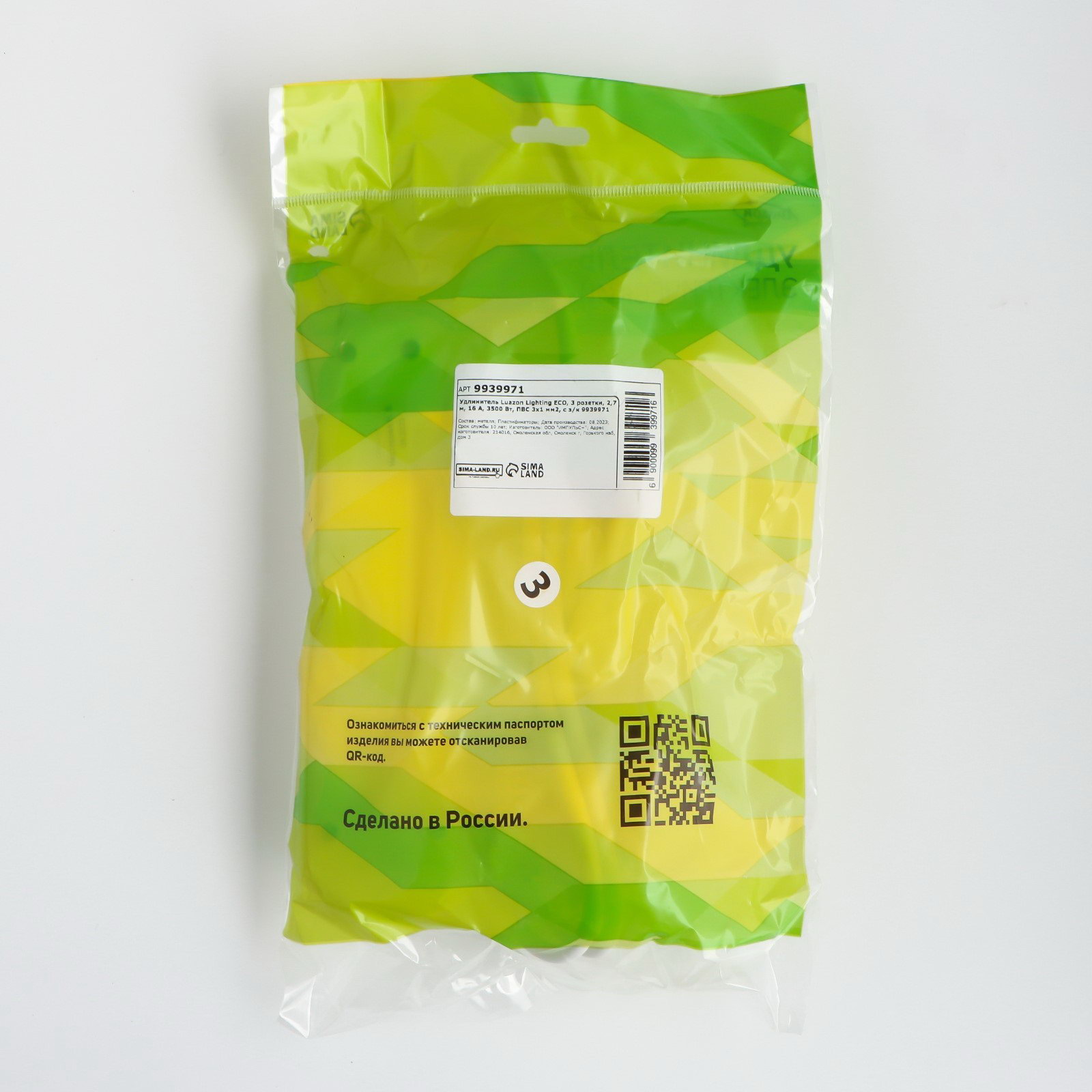 Удлинитель ECO, 3 розетки, 2.7 м, 16 А, 3500 Вт, ПВС 3x1 мм2, с заземлением, Luazon Lighting, Россия