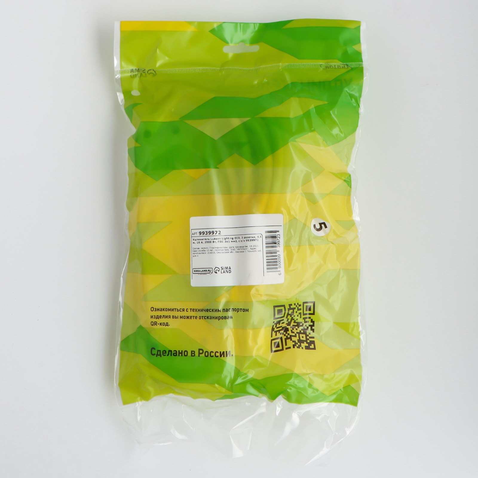 Удлинитель ECO, 3 розетки, 4.5 м, 16 А, 3500 Вт, ПВС 3х1 мм2, с з/к, Luazon Lighting, Россия