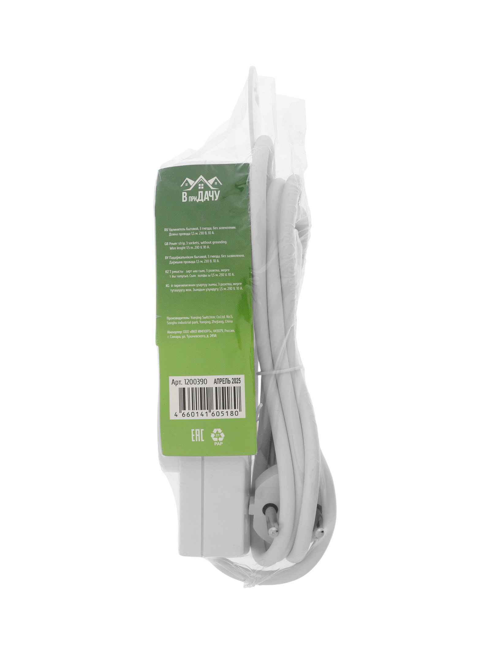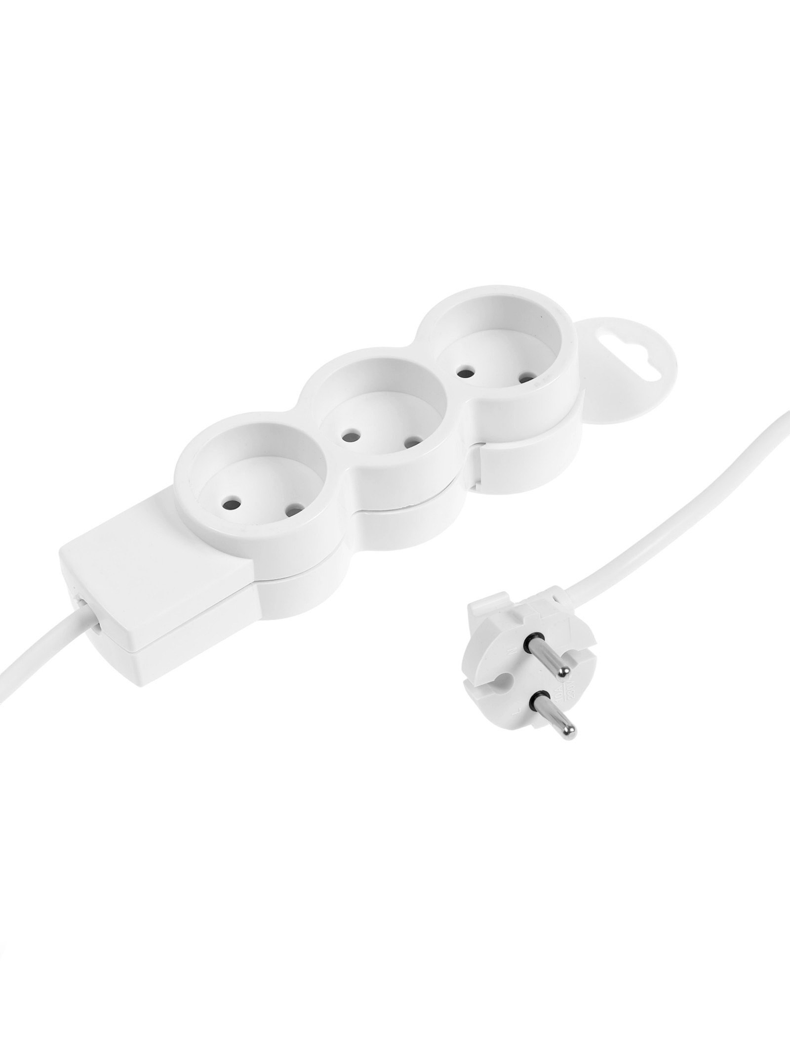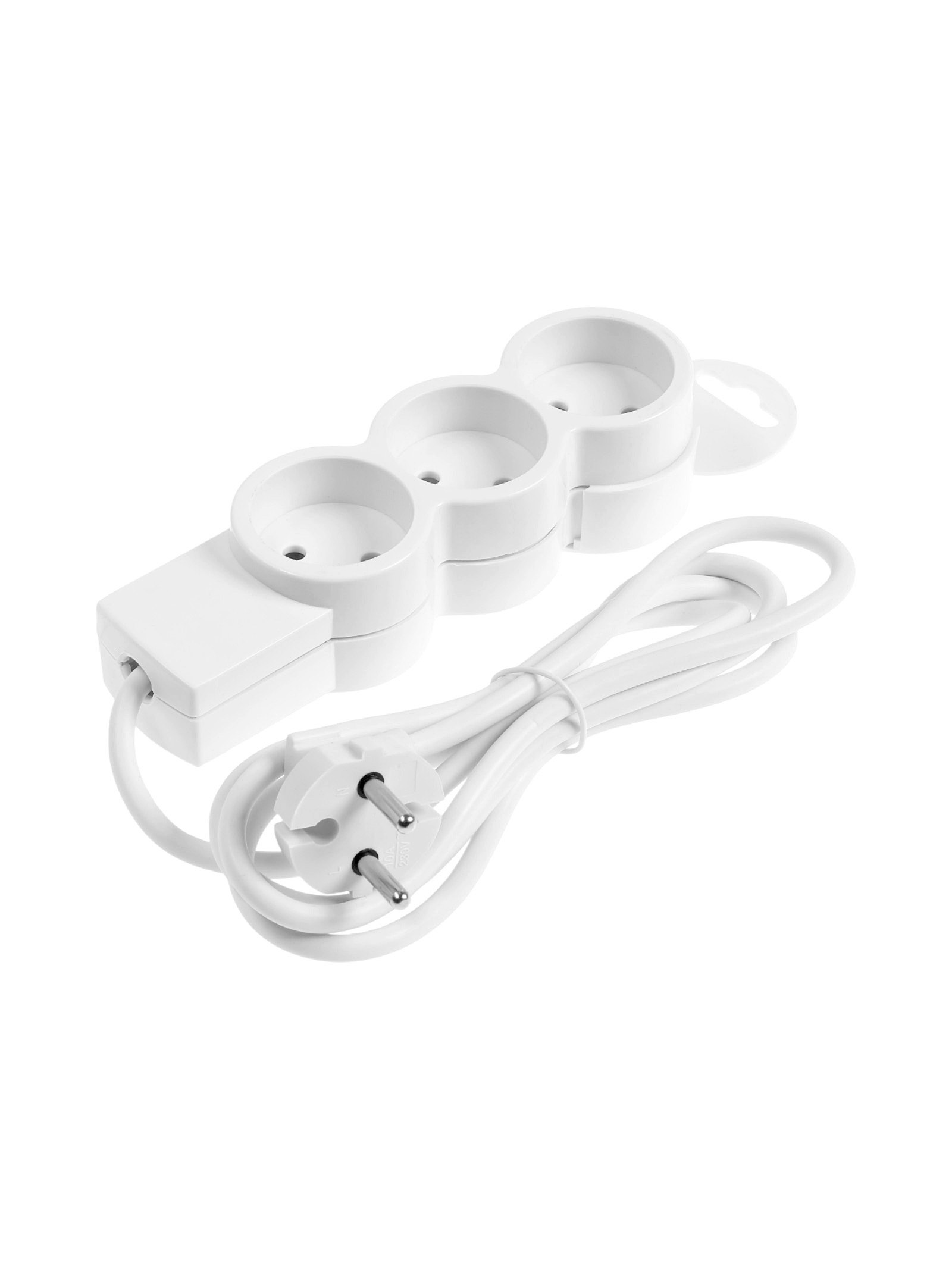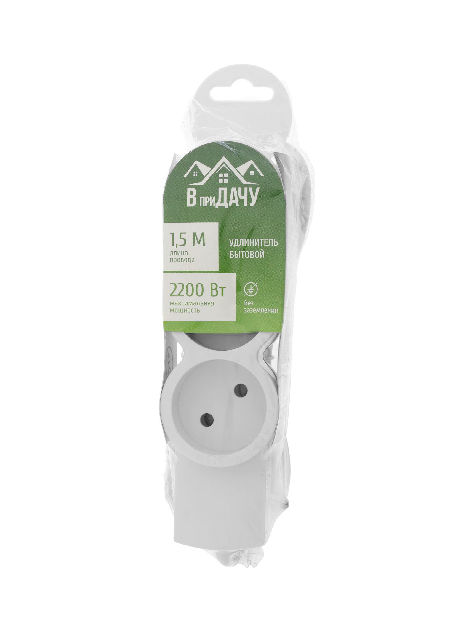 Удлинитель бытовой, 3 розетки, 1.5 м, 10 А, 2200 Вт, ПВС 2x0.75 м?2, без заземления, белый, ВприДачу, Китай