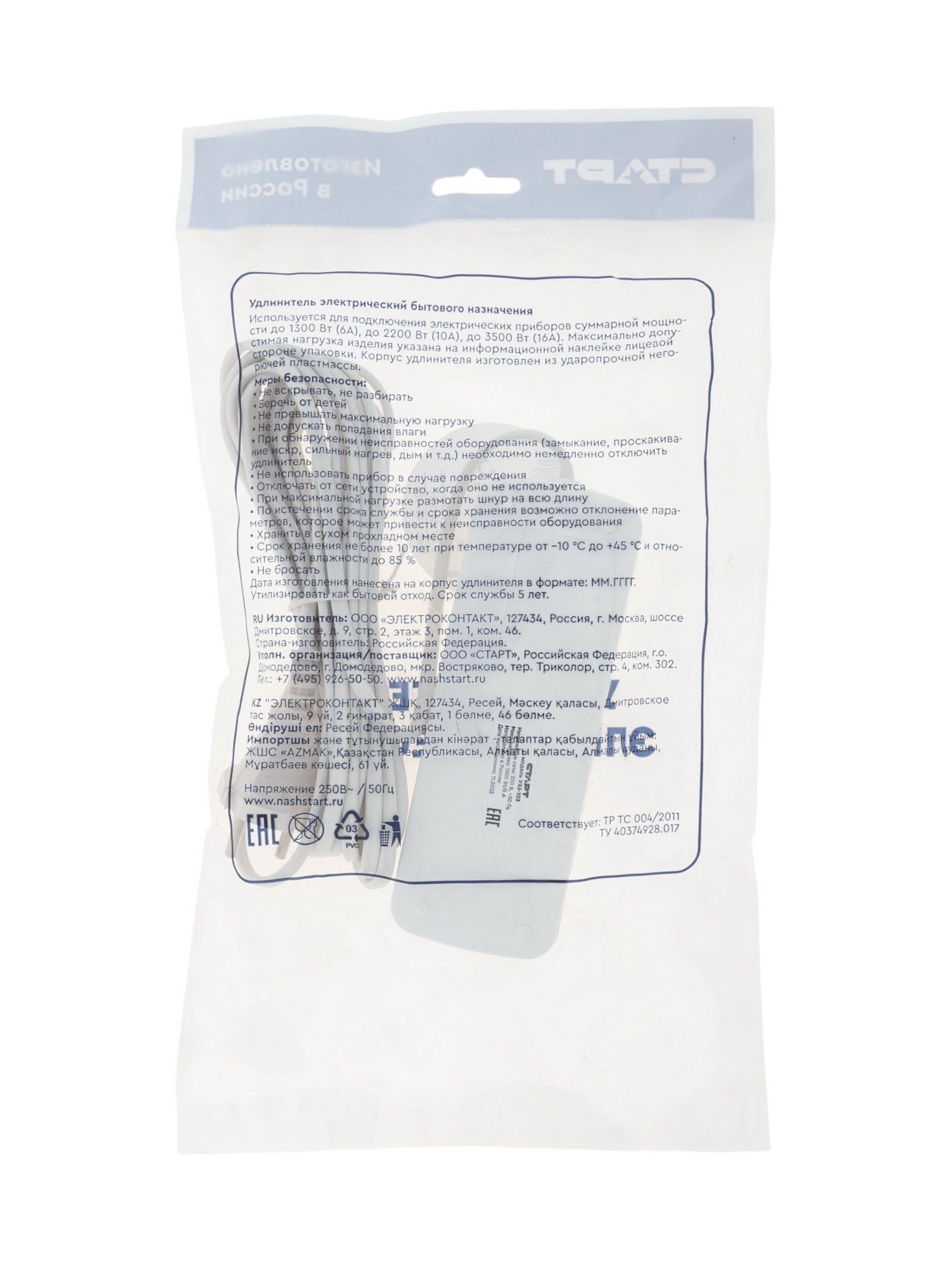 Удлинитель УХ6-103, 3 розетки, 5 м, 6 А, ШВВП, с заземлением, белый, СТАРТ, Россия