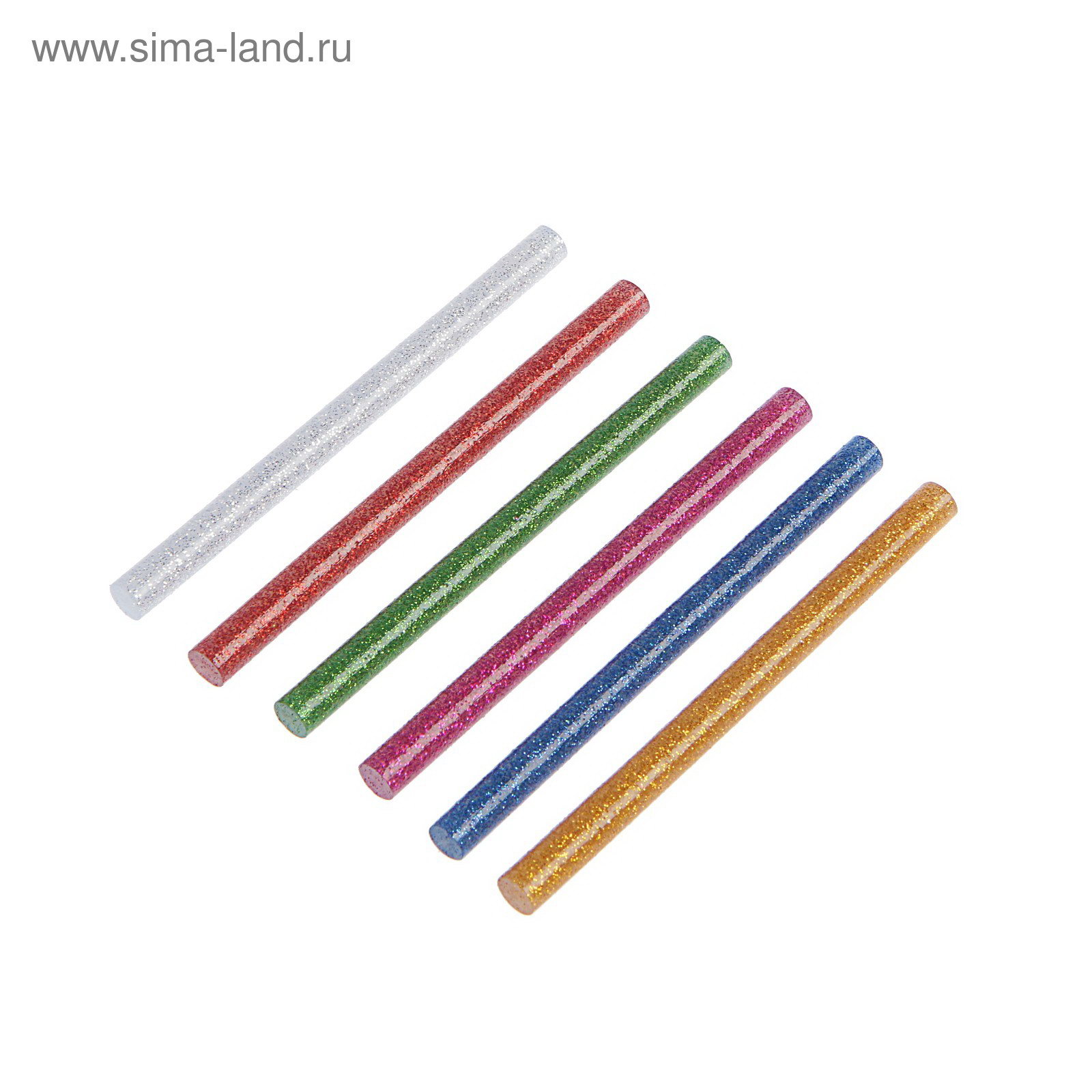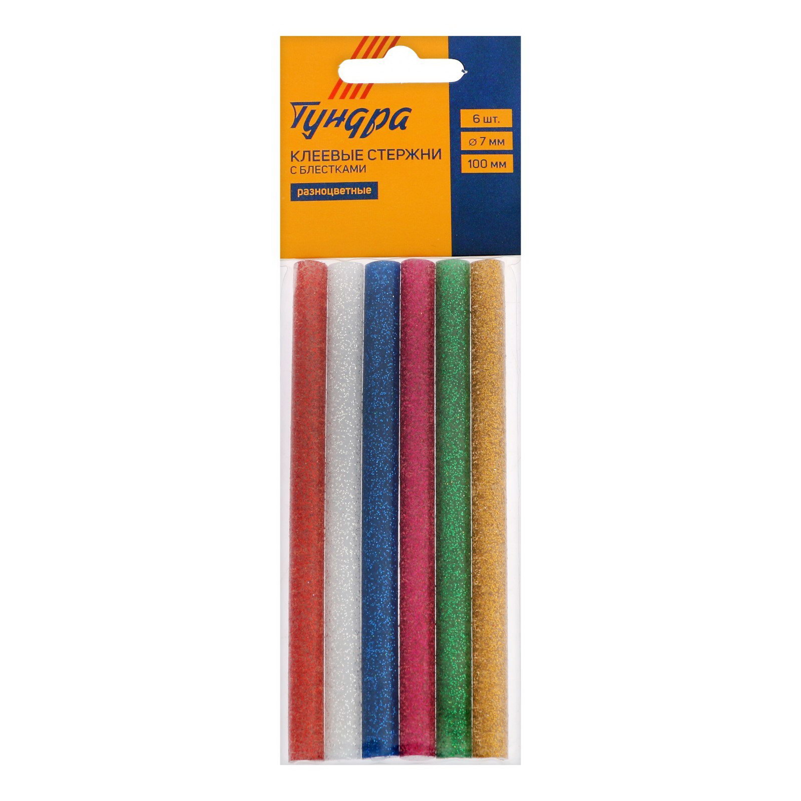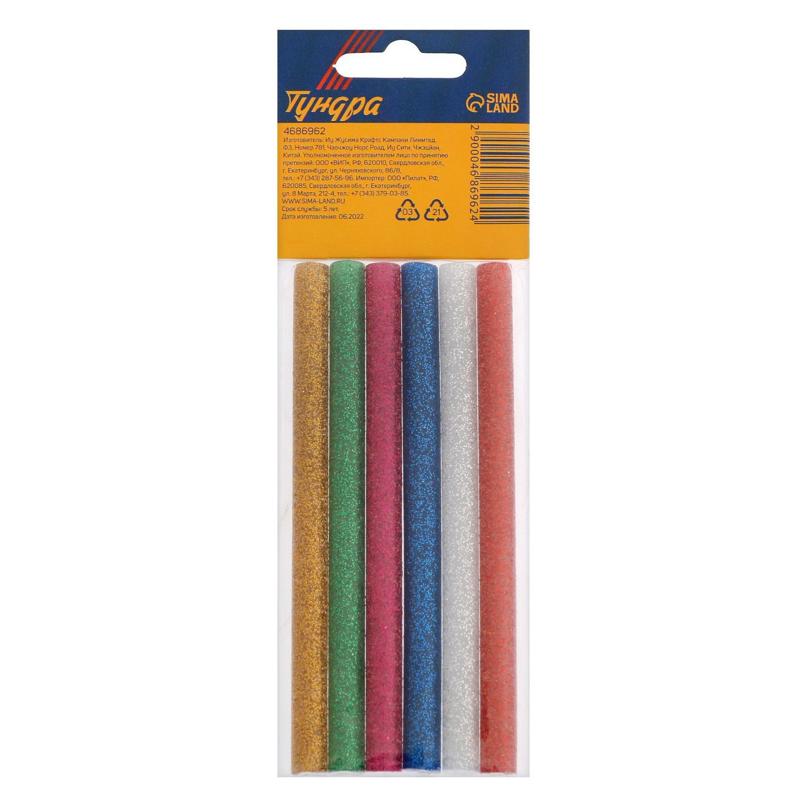 Клеевые стержни 7x100 мм, разноцветные с блестками, 6 шт., 70 см., ТУНДРА, Китай