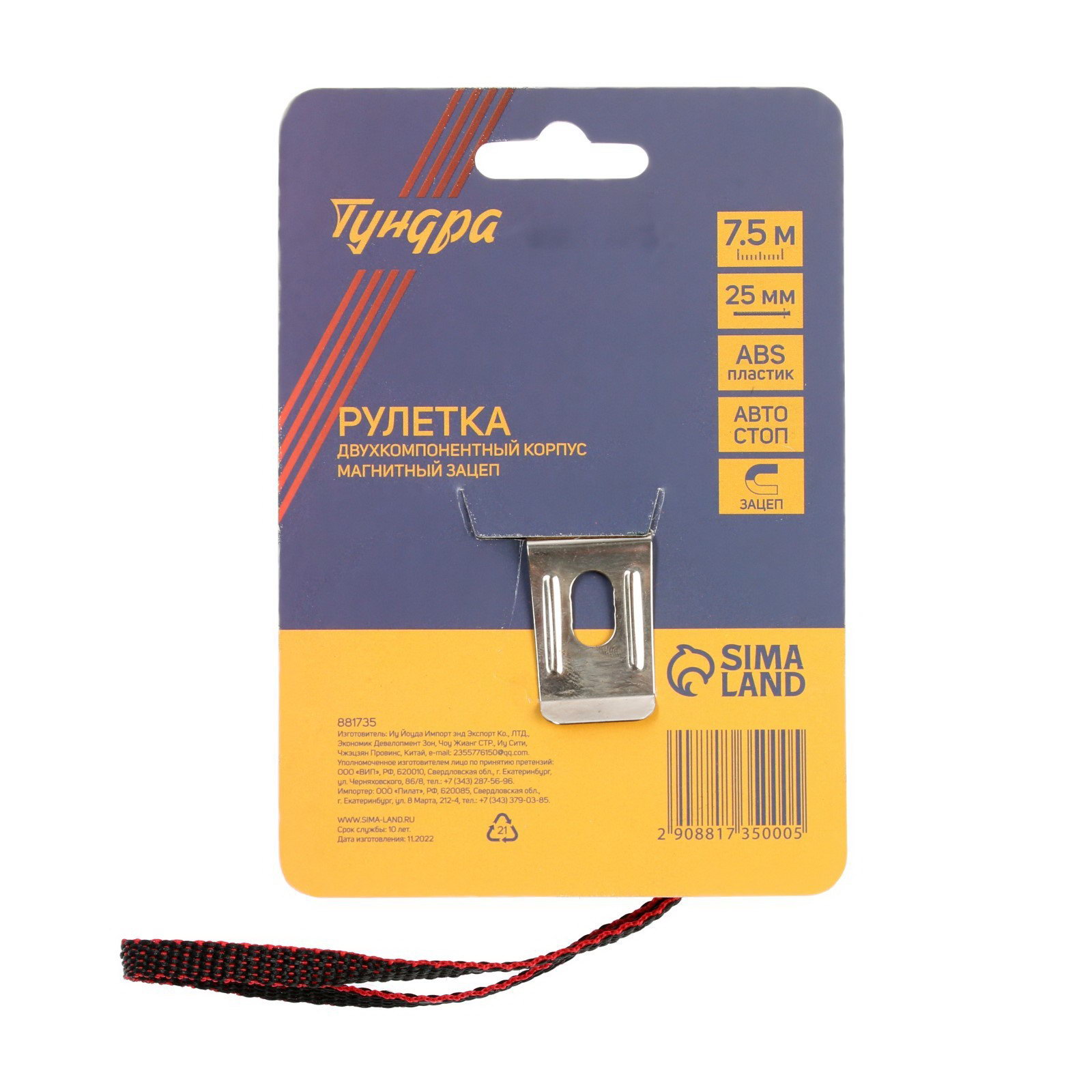 Рулетка двухкомпонентный корпус, автостоп, магнитный зацеп, 7.5 м x 25 мм, 9x9x4 см., ТУНДРА, Китай