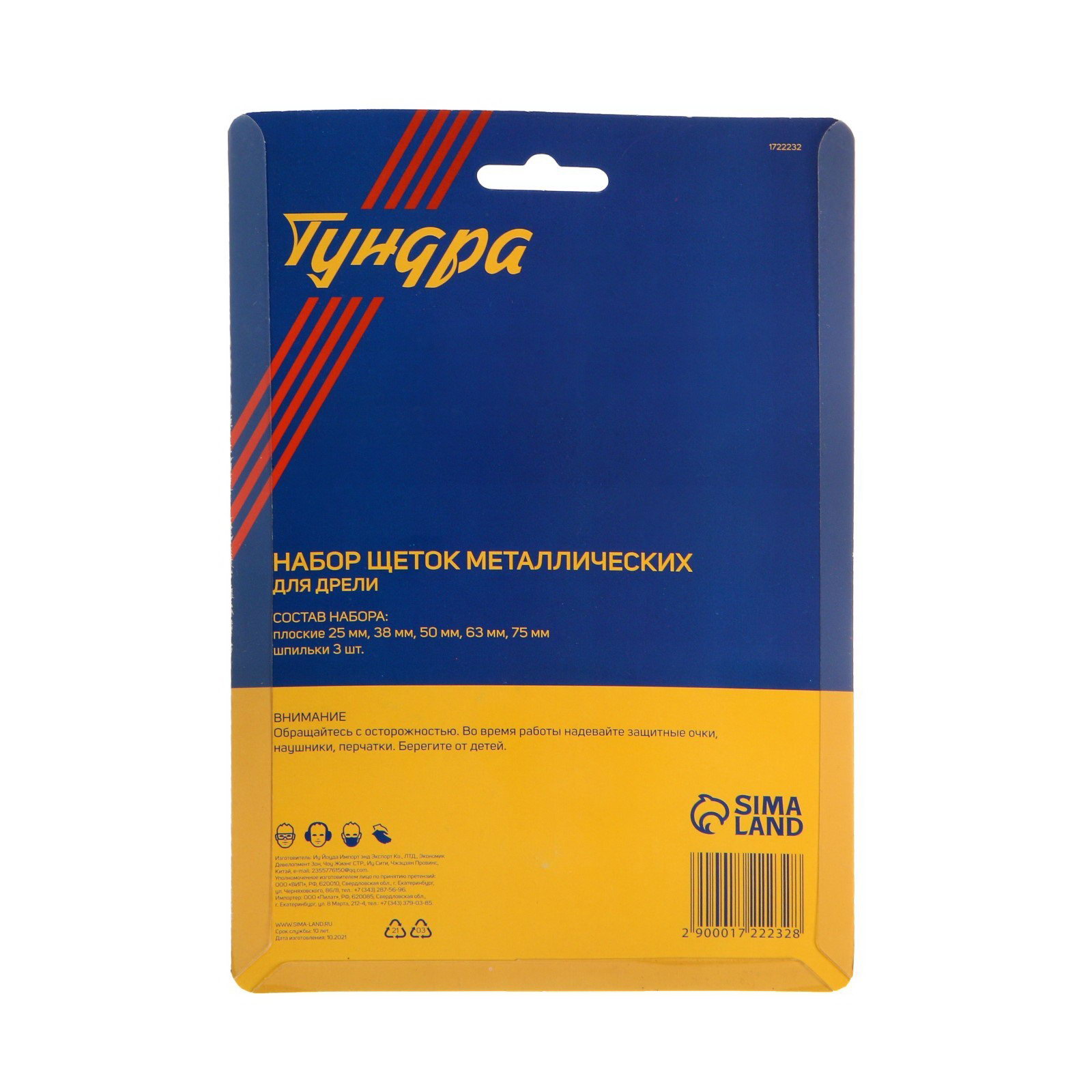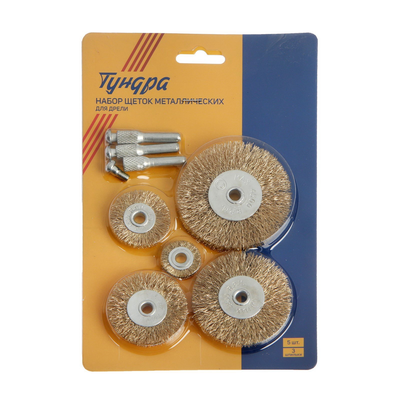 Набор щеток металлических для дрели плоские 25-38-50-63-75 мм, 5 шт. + 3 шпильки, ТУНДРА, Китай