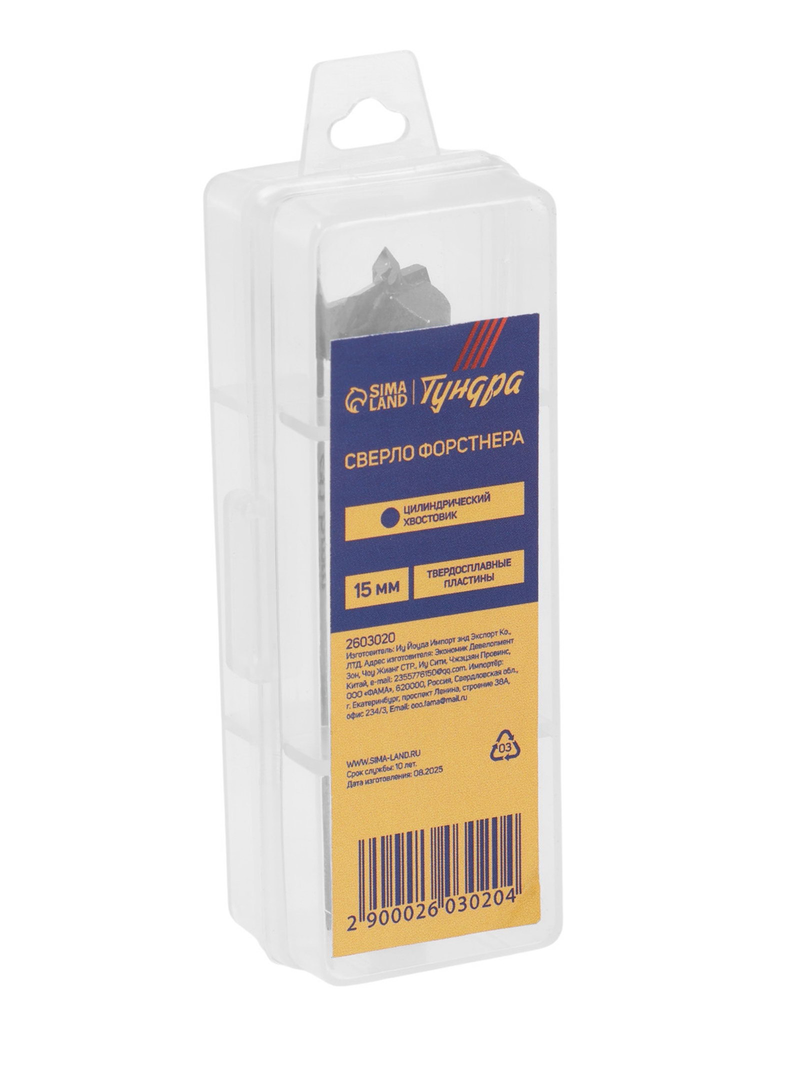 Сверло Форстнера твердосплавные пластины, цилиндрический хвостовик, 15 мм, 150 см., ТУНДРА, Китай