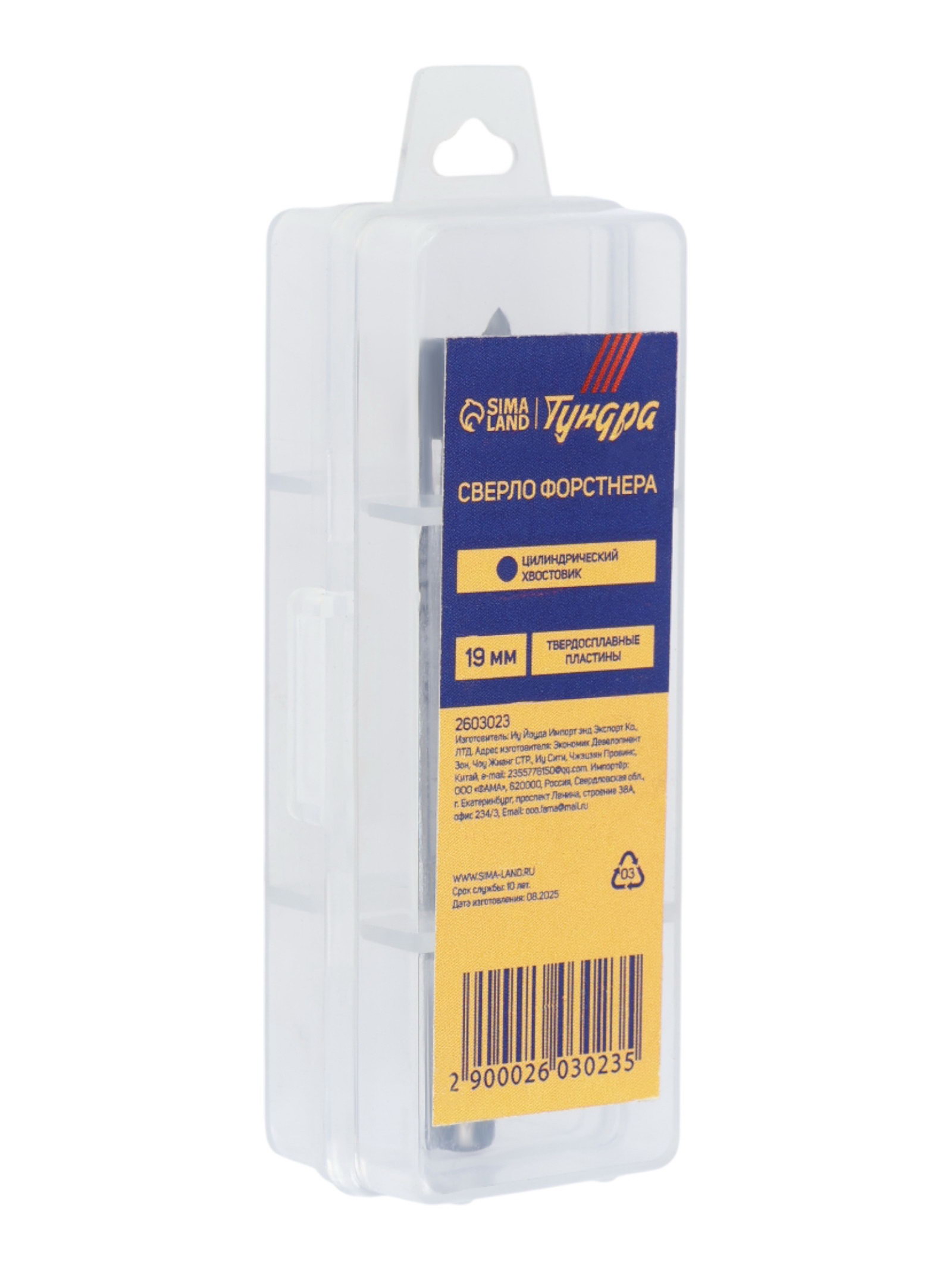 Сверло Форстнера твердосплавные пластины, цилиндрический хвостовик, 19 мм, 190 см., ТУНДРА, Китай