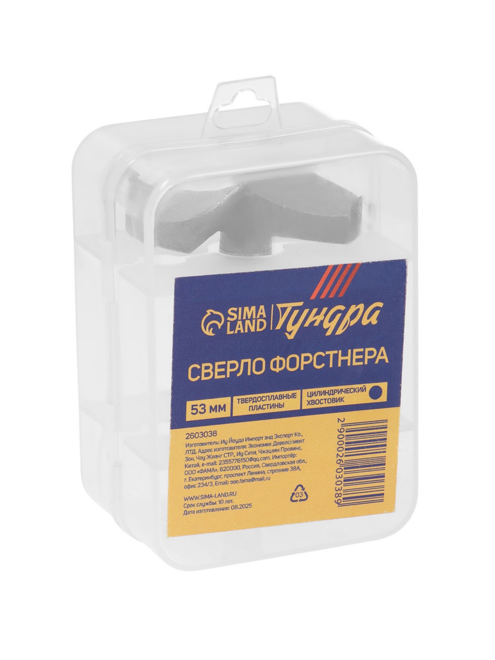 Сверло Форстнера твердосплавные пластины, цилиндрический хвостовик, 53 мм, 530 см., ТУНДРА, Китай