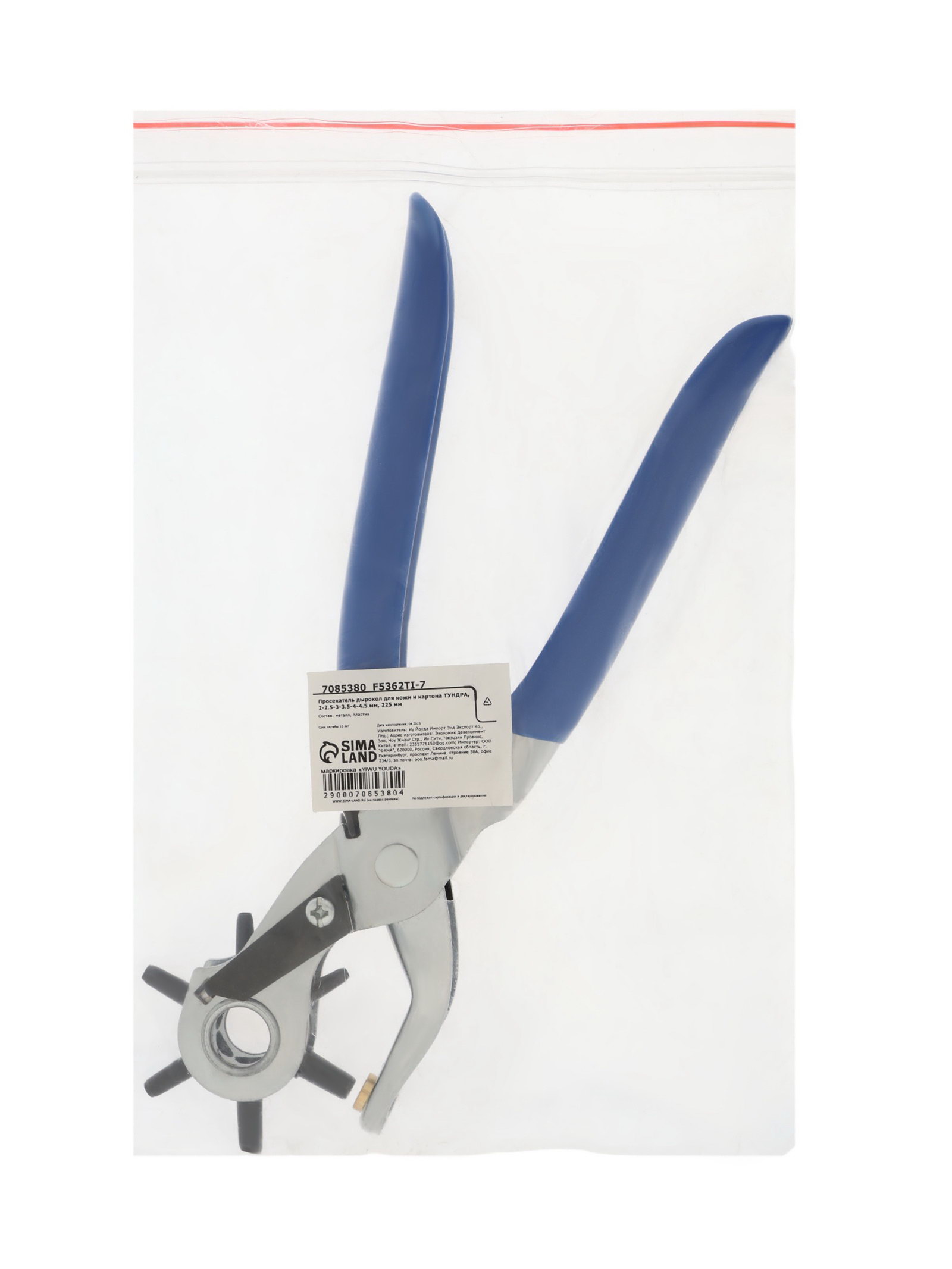 Дырокол просекатель для кожи и картона 2-2.5-3-3.5-4-4.5 мм, 225 мм, ТУНДРА, Китай