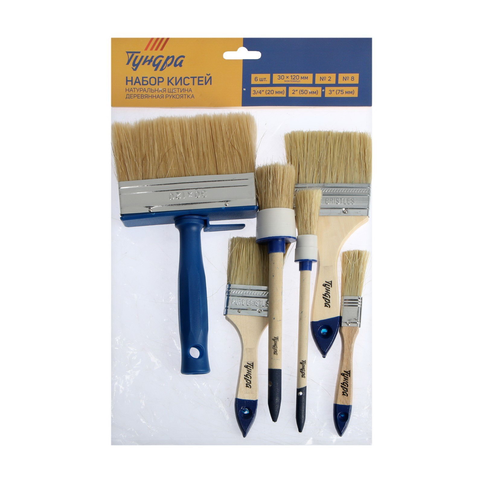 Набор кистей плоские 3/4", 2", 3", круглые №2, №8, макловица 30x120 мм, 6 шт., ТУНДРА, Китай