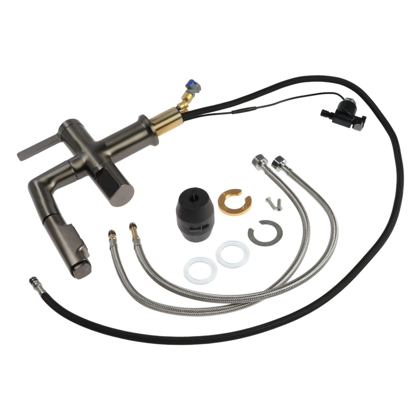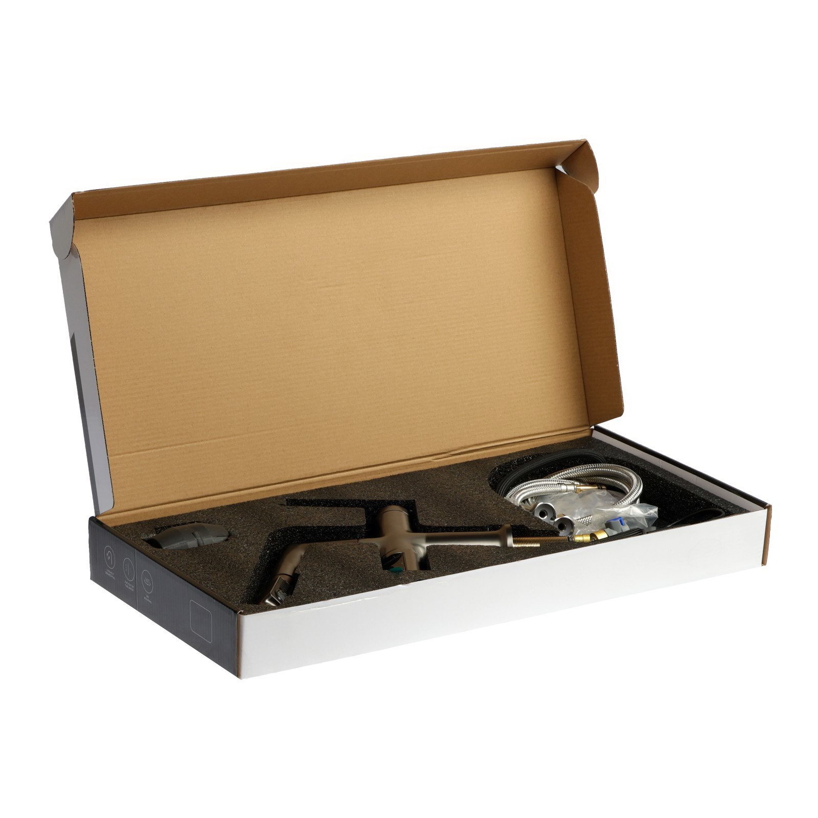 Тип управления: Рычажный, Термостатический Тип излива: Выдвижной, Короткий, Поворотный излив Размер упаковки: 27 x 6.5 x 57 см. Цвет: Сатин Интерьерный: Нет Фильтрация воды: Нет Вид установки: На раковину и столешницу Материал корпуса: Цинк Длина излива, мм: 140 Диаметр картриджа: 35 Диаметр картриджа: 35 tnved: 8481801000 Гарантийный срок, мес.: 12 Смеситель для кухни ZEIN предназначен для установки на горизонтальной поверхности кухонной мойке или столешнице. Вытяжной излив добавит функциональности смесителю - можно вымыть объемную посуду, дотянуться до труднодоступных мест и любого содержимого мойки. Аэратор может вытягиваться и имеет два режима подачи воды, что делает его более удобным и многофункциональным. На корпусе присутствует цифровой экран, по которому можно контролировать температуру воды. Сетка фильтрации очищает воду от нежелательных примесей и загрязнений. Удобное переключение горячей/холодной воды рычагом позволяет регулировать температуру воды до наиболее комфортных значений одной рукой. | ||