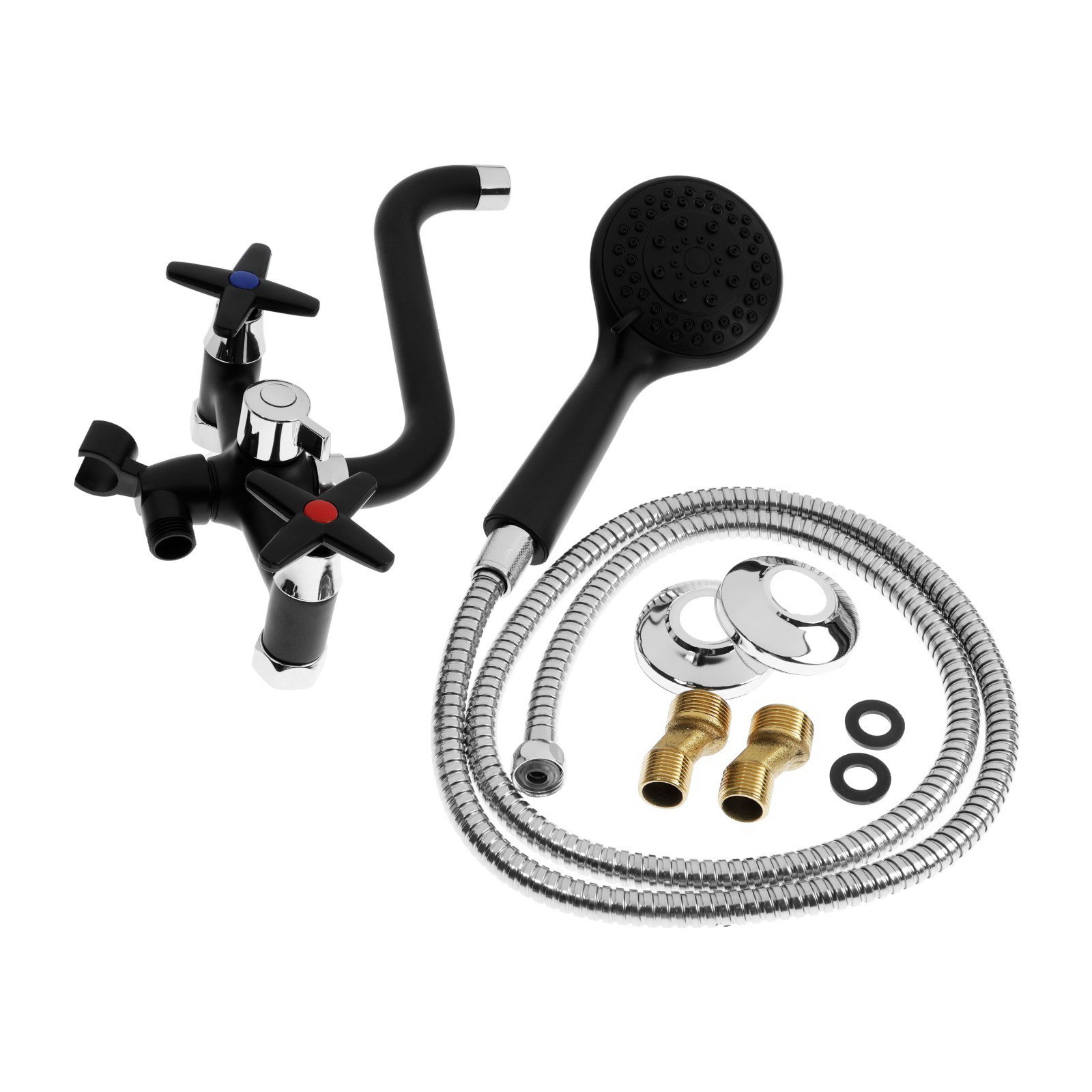 Тип излива: S-образный, Поворотный излив Цвет: Хромированный, Чёрный Размер упаковки: 14 x 8.5 x 38 см. tnved: 8481801000 Гарантийный срок, мес.: 12 Интерьерный: Да С тропическим душем: Нет С душевым набором: Да Вид установки: Настенный Длина излива, мм: 200 Тип управления: Вентильный Материал корпуса: Цинк Настенный двухвентильный смеситель для ванны с душевым набором, излив 200 мм, кран-буксы 1/2, цвет черный/хром модель для установки на стену над ванной. Два вентиля с кран-буксами регулируют напор горячей и холодной воды. В комплект входит душевая лейка, шланг и настенный держатель. Поворотный S-образный излив длиной 200 мм направляет воду в ванну. Двухцветное исполнение сочетает черный корпус и хромированные элементы.