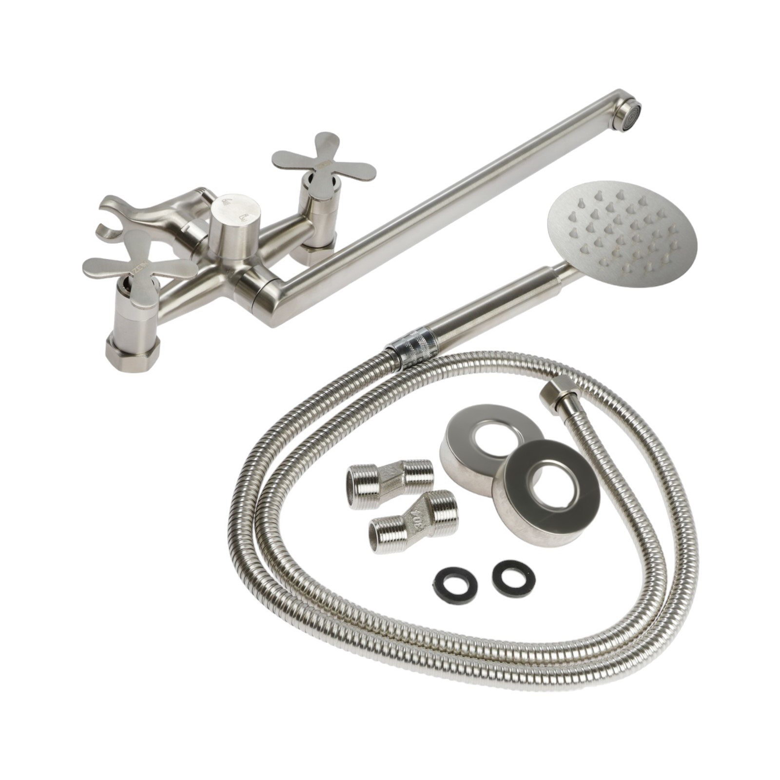 Смеситель для ванны Z3731, двухвентильный, излив 33 см, лейка, шланг, сатин, 11x35x12 см., ZEIN, Китай
