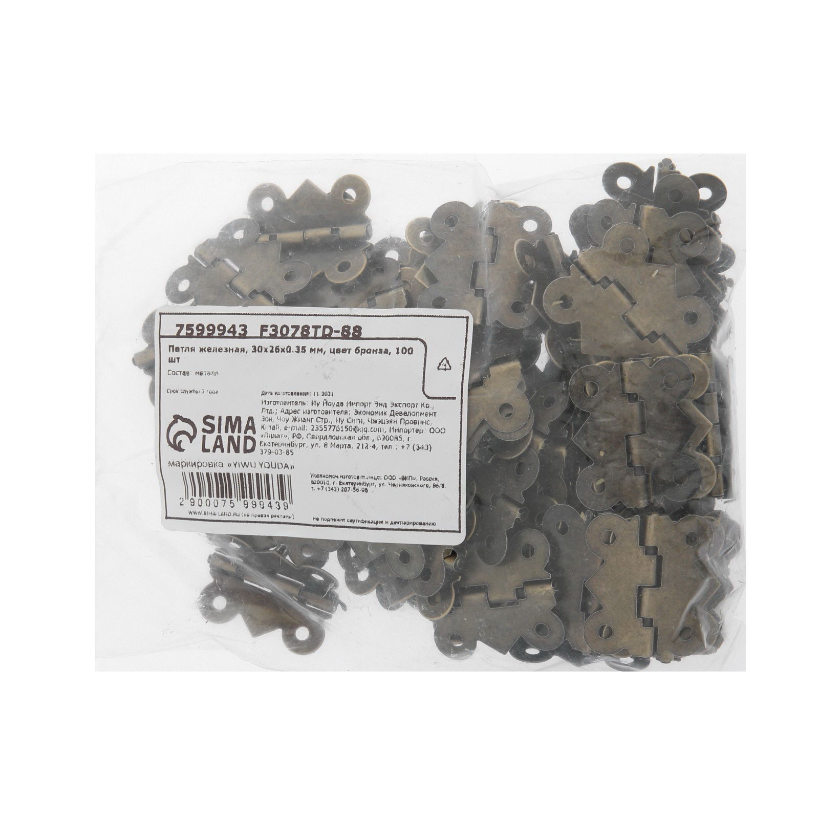 Петля железная, 30x26x0.35 мм, цвет бронза, 100 шт., 2.6x3x0.3 см., ТУНДРА, Китай
