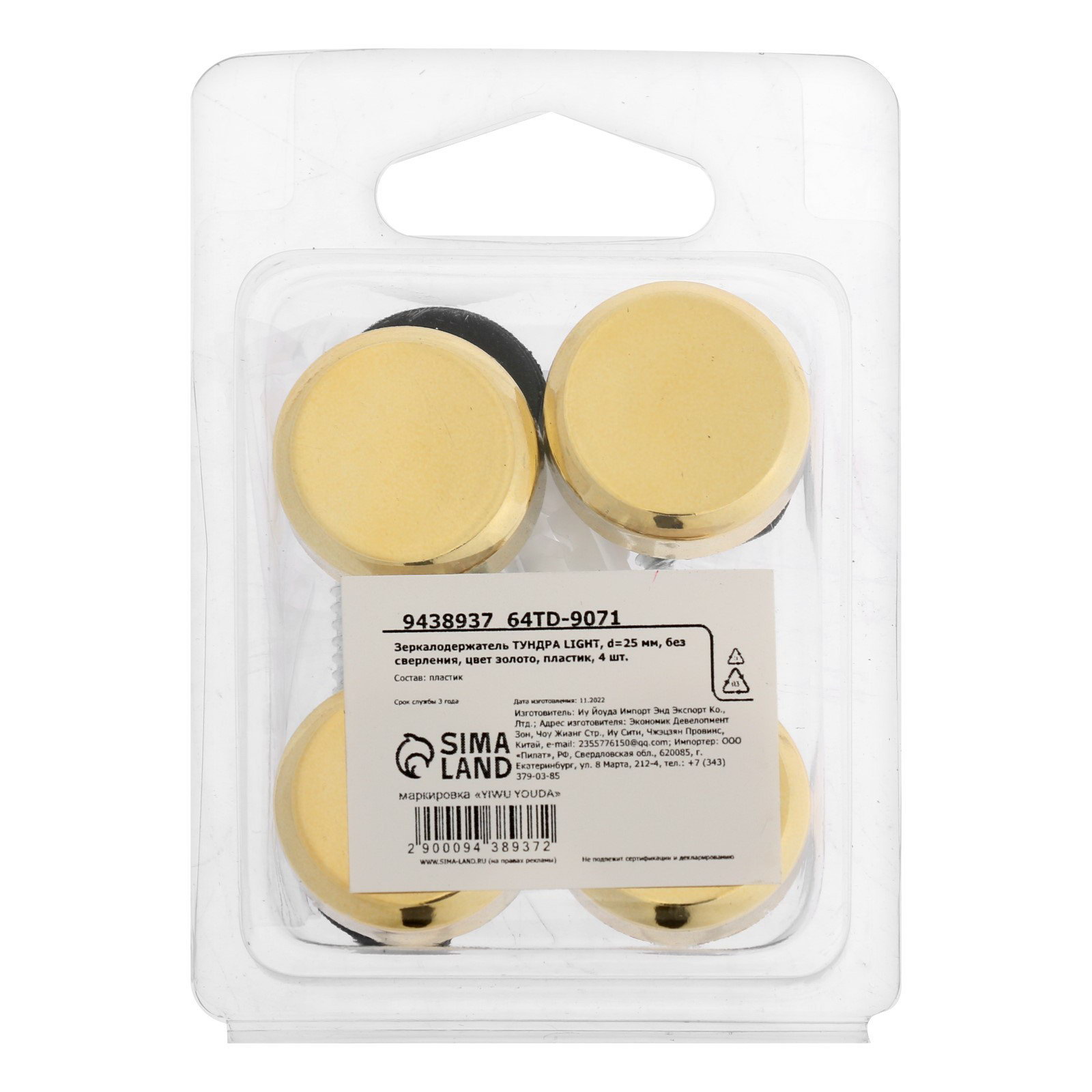 Зеркалодержатель d=25 мм, без сверления, цвет золото, пластик, 4 шт., 250х250х2 см., ТУНДРА, Китай