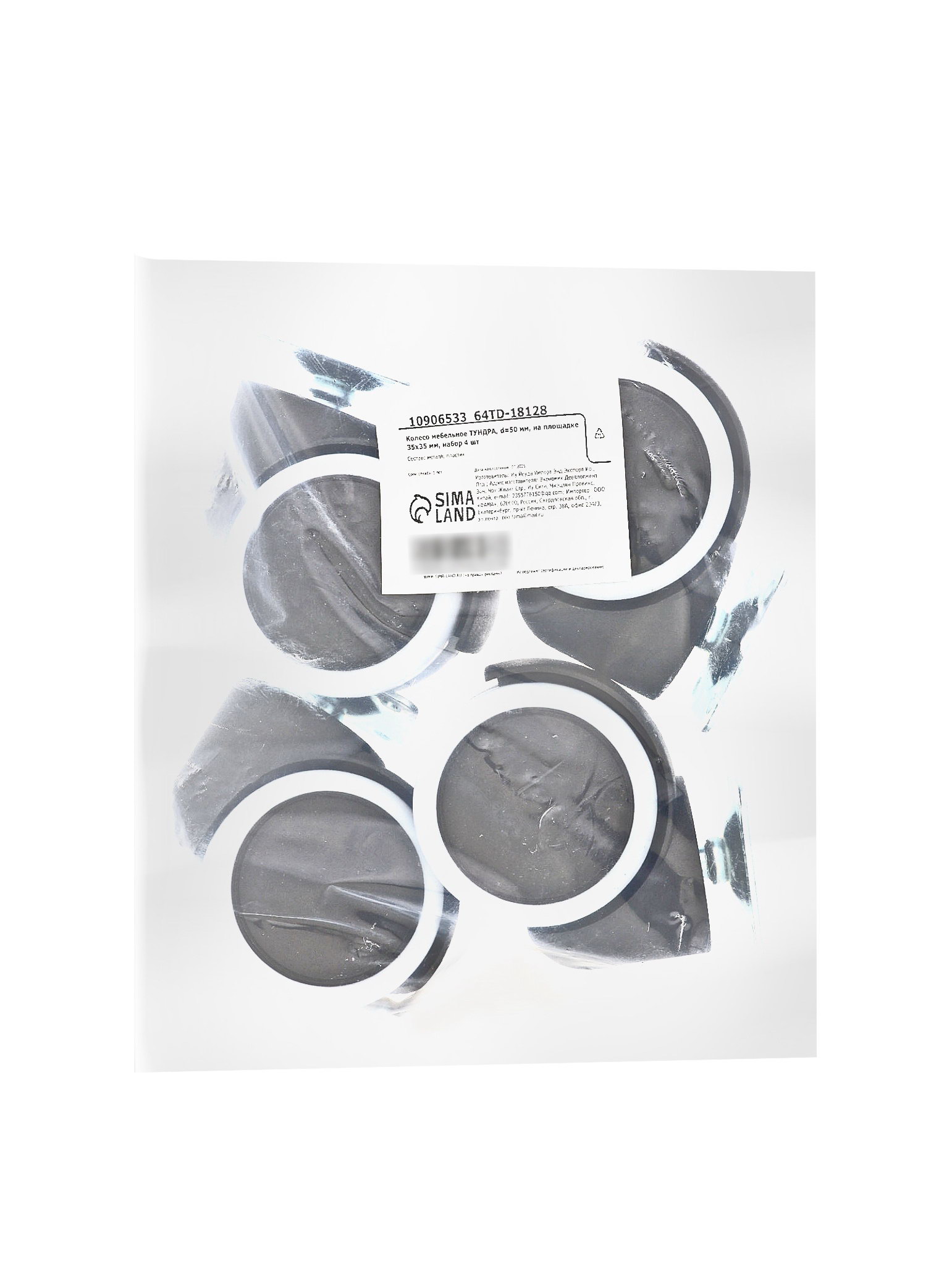 Колесо мебельное d=50 мм, на площадке 35x35 мм, набор 4 шт., 6.8x6.8x5.4 см., ТУНДРА, Китай
