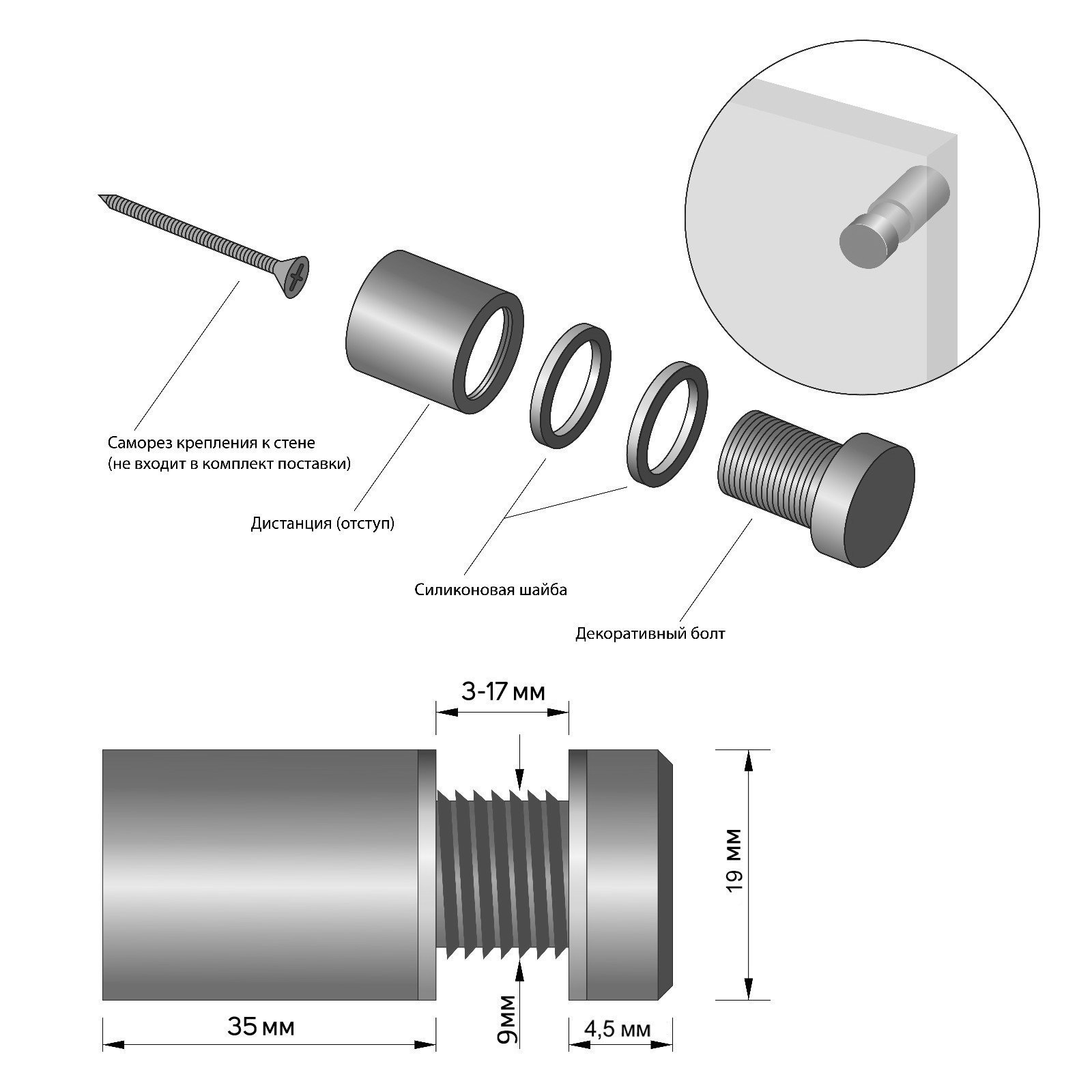 Дистанционный держатель для табличек, 19x40 мм, черный, набор 6 шт., 1.9x4x1.9 см., ТУНДРА, Китай