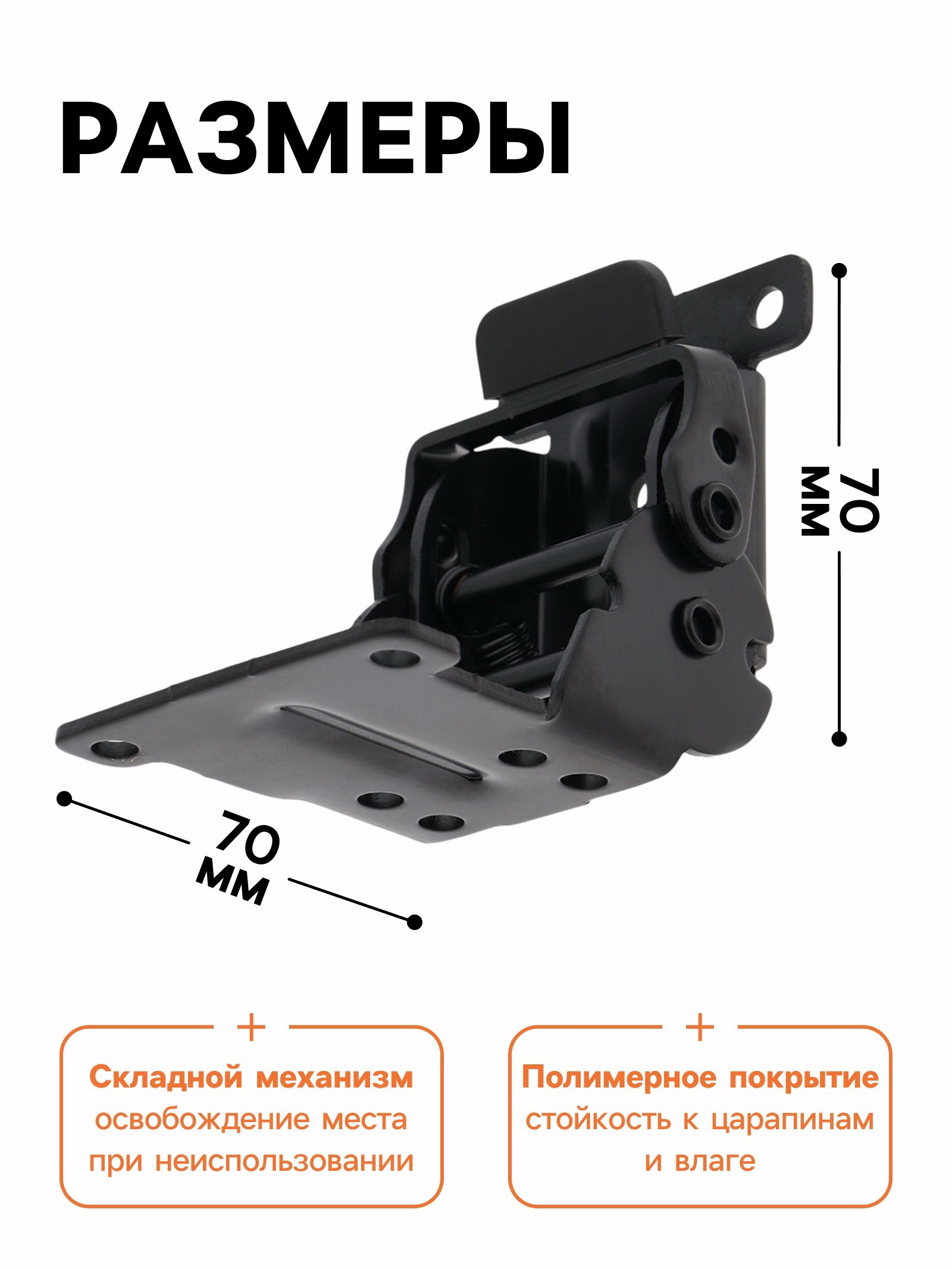 Размер упаковки: 7 x 5.5 x 7 см. Гарантийный срок, мес.: 6 tnved: 8302500000 Применение: Для столов Складной: Да Цвет: Чёрный Размер, мм: 70 x 70 Складные кронштейны "Тундра" черного цвета набор из двух компактных опор для откидных столов. Черное полимерное покрытие, размер 70x70 мм