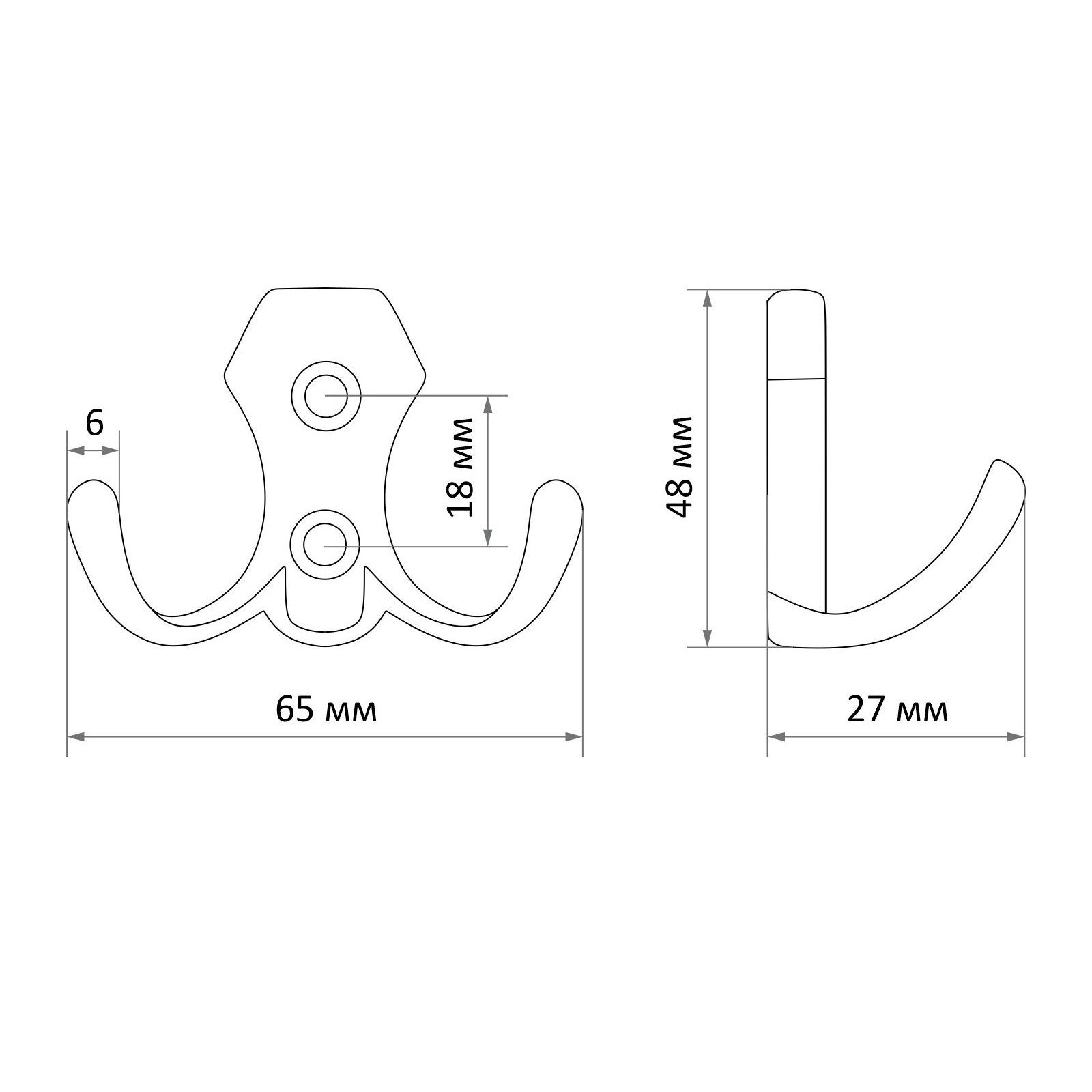 Крючок мебельный TKd=007, двухрожковый, бронза, 6.5x3x2.9 см., ТУНДРА, Китай
