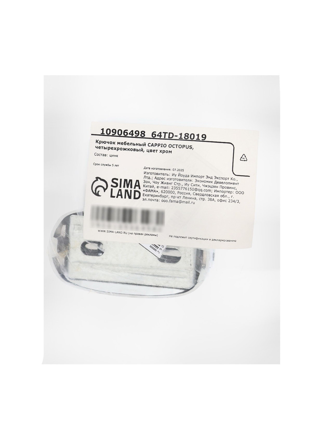 Крючок мебельный OCTOPUS, четырехрожковый, цвет хром, 6.6x6.4x2 см., CAPPIO, Китай