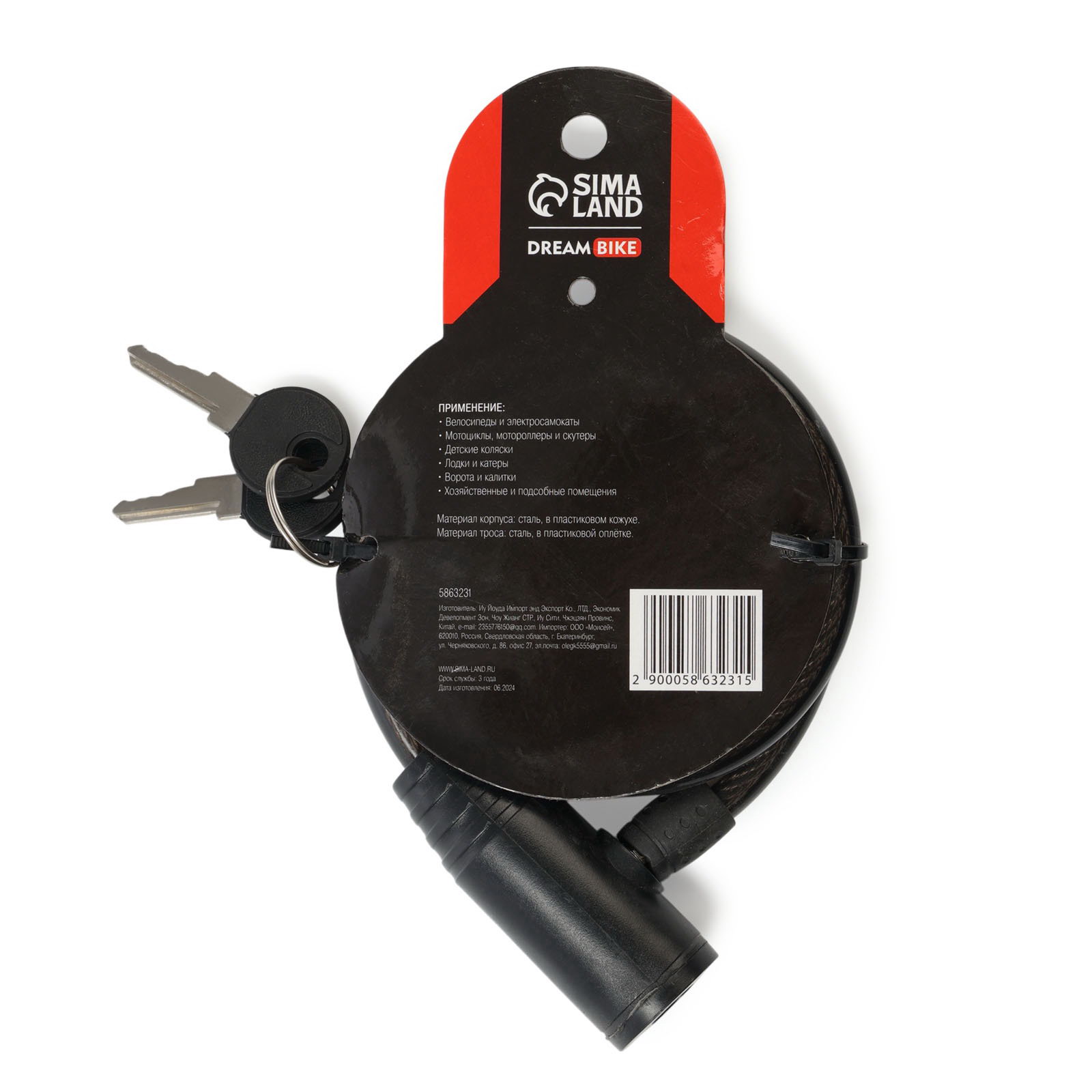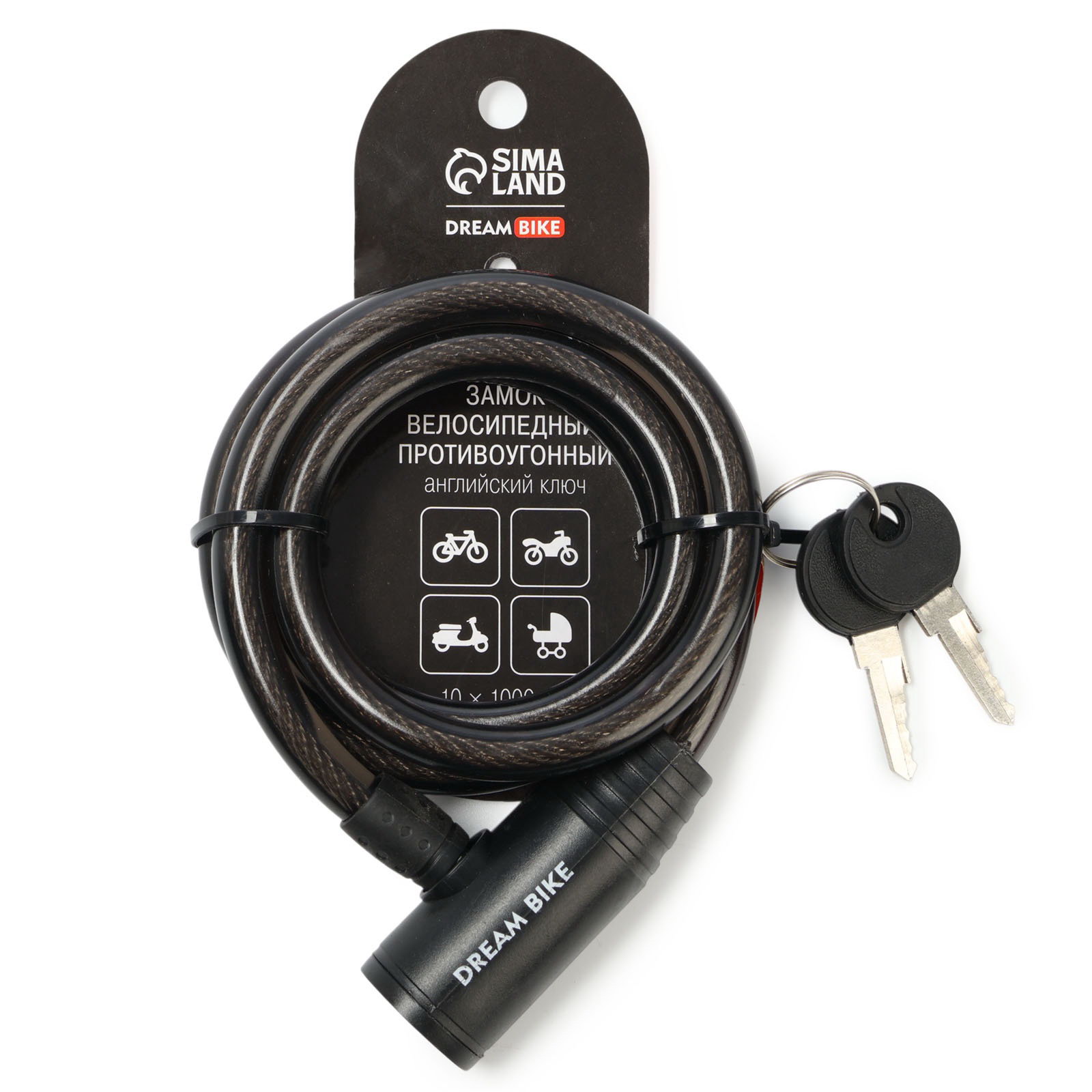 Замок навесной велосипедный 10x1000 мм, английский ключ с пластиковой ручкой, 100х100х1 см., Dream Bike, КИТАЙ