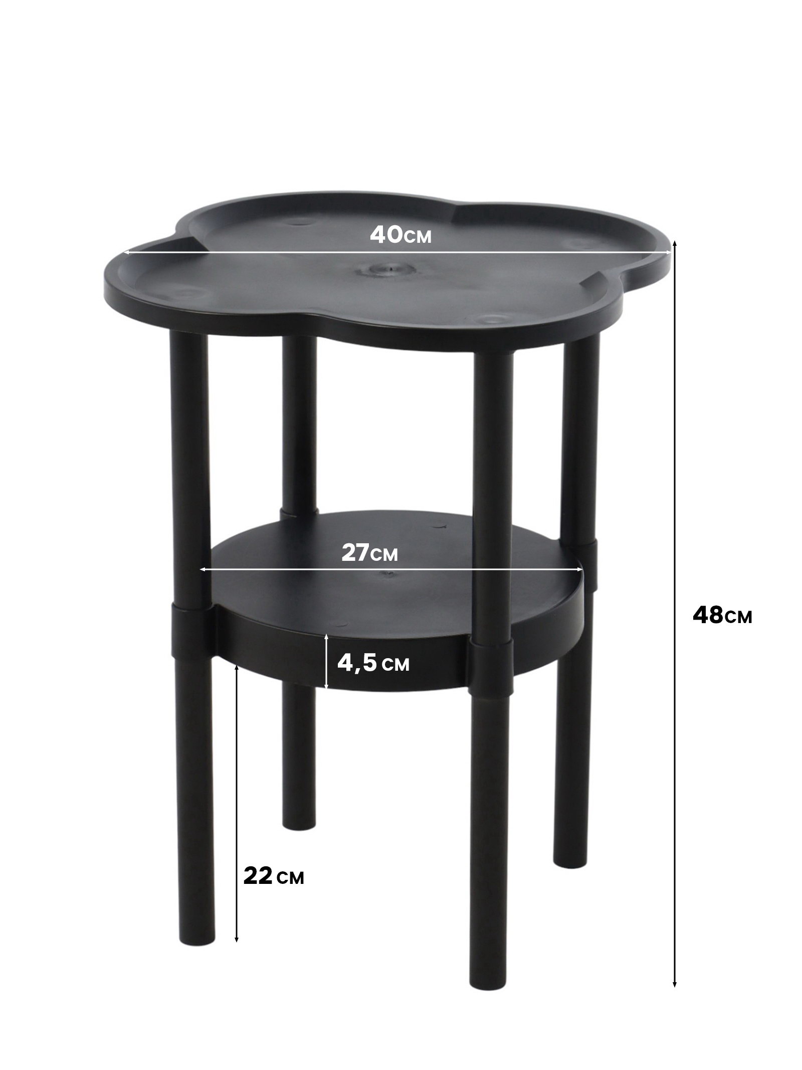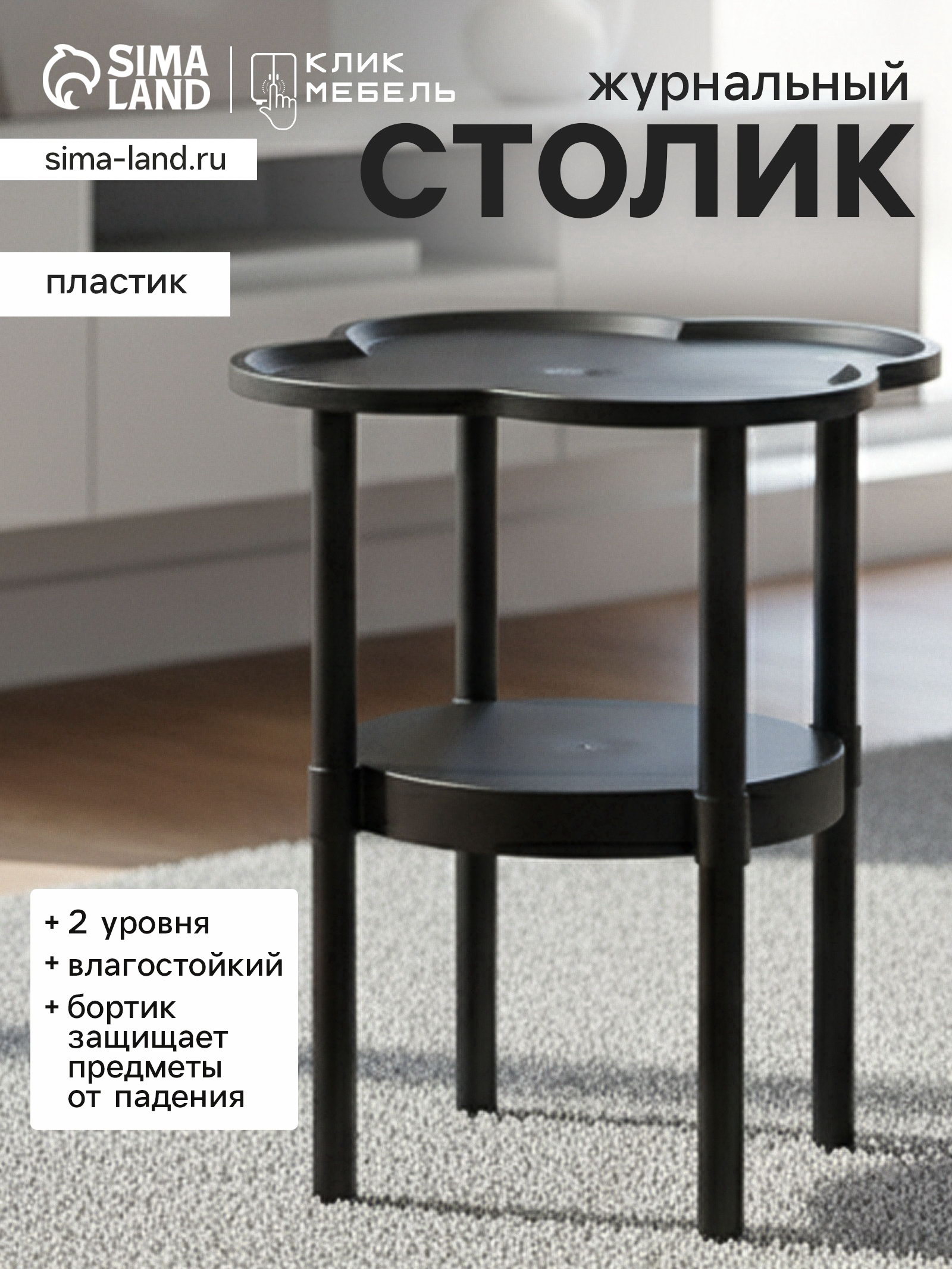Форма: Круглая, Лепесток Размер упаковки: 34 x 5 x 35 см. tnved: 9403700000 На колёсиках: Нет Оттенок: Чёрный Цвет: Чёрный Поставляется в разобранном виде: Да Трансформируется: Нет Раскладная мебель: Нет Вид: Столы Ширина, мм: 400 Высота, мм: 480 Глубина, мм: 400 Журнальный столик "Клик Мебель": практичное решение Предмет мебели, сочетающий компактность и функциональность. Столик имеет два яруса для удобного хранения книг, журналов, пультов и других мелочей. Верхняя поверхность оборудована бортиком, предотвращающим падение предметов. Особенности столика "Клик Мебель"