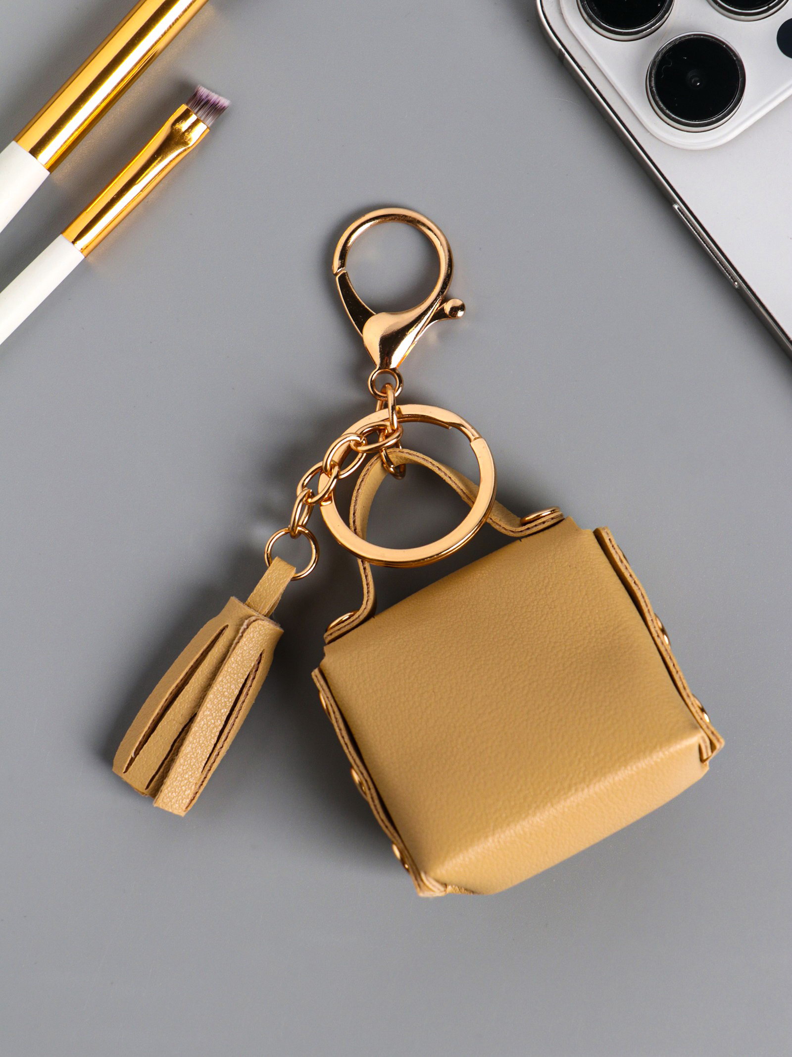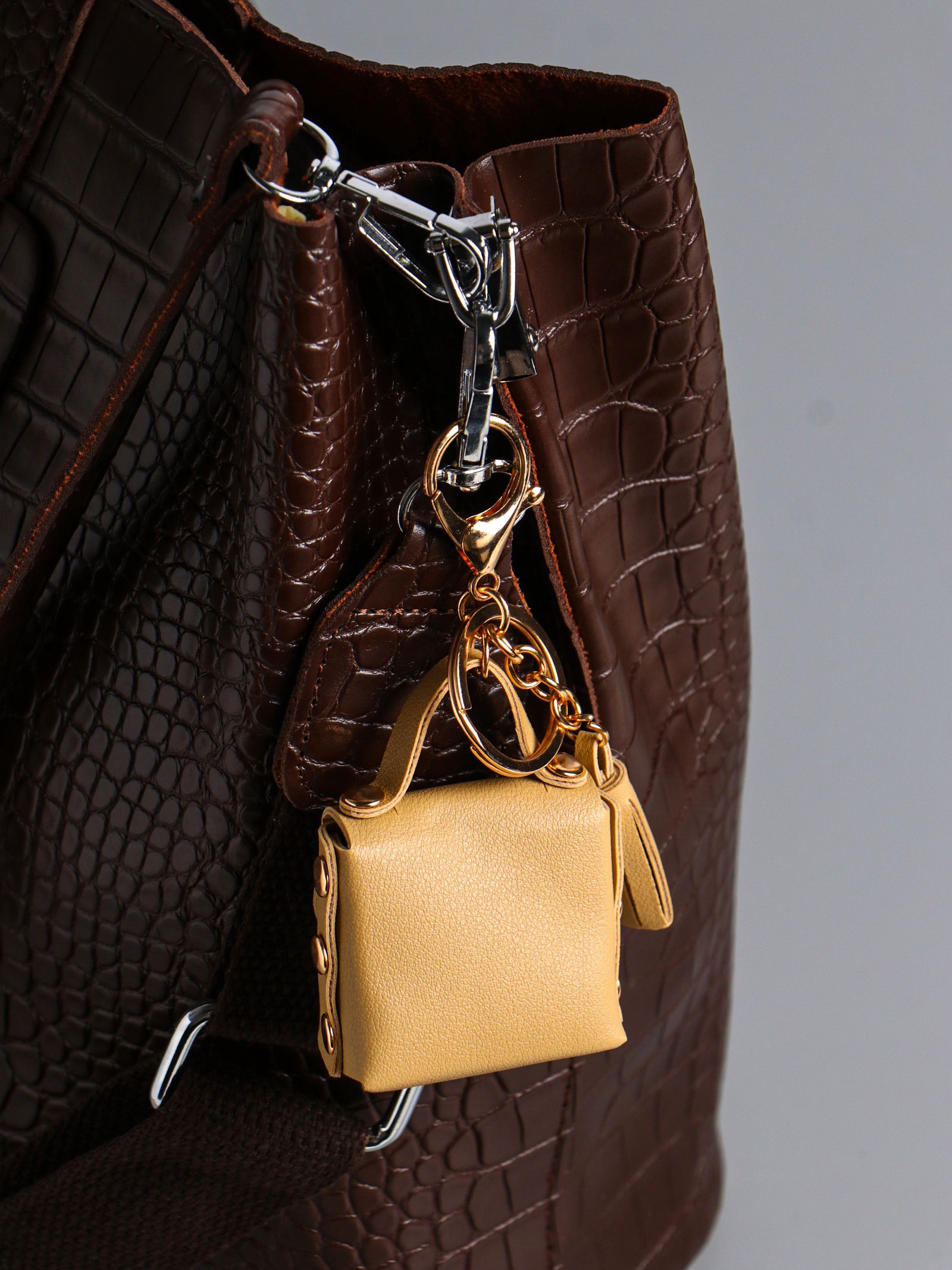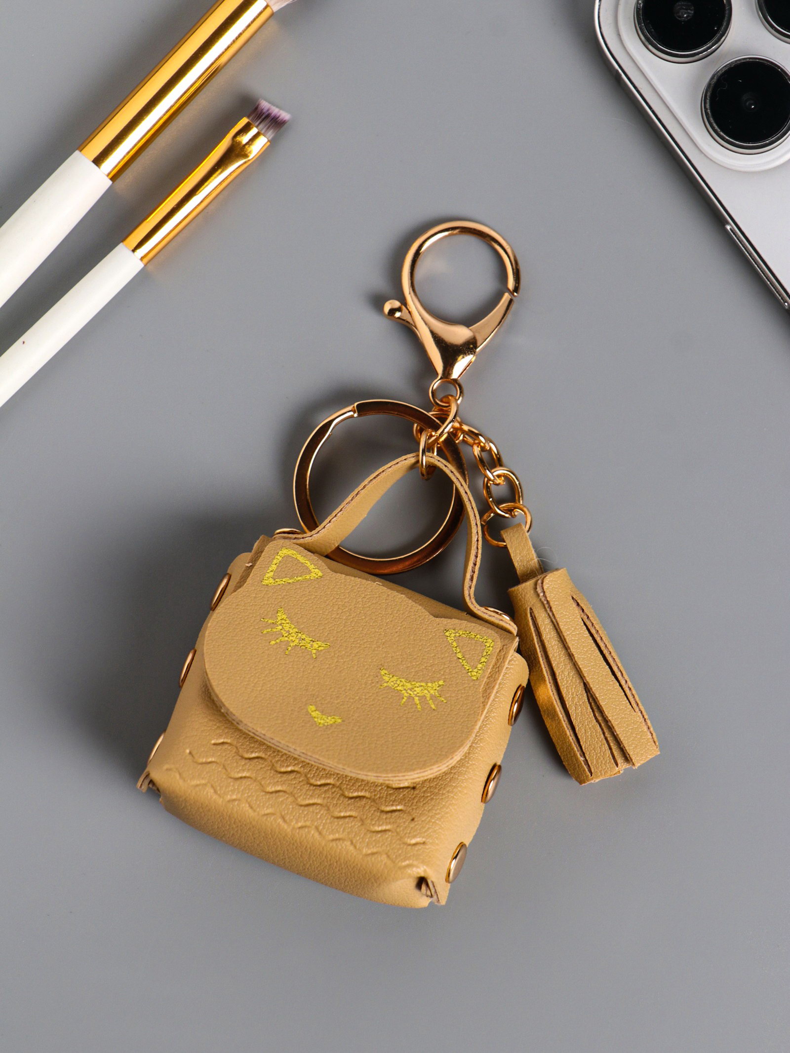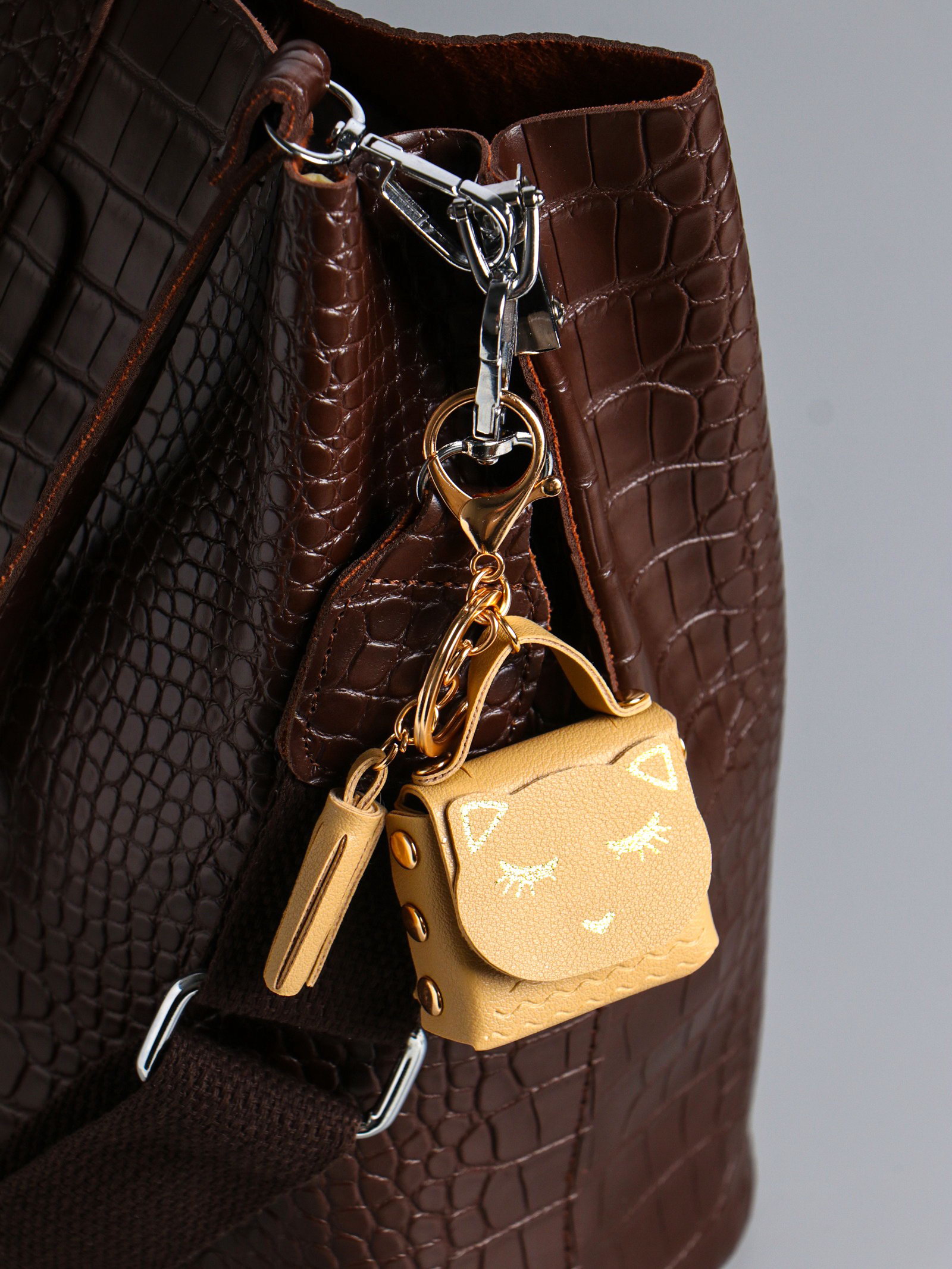 Брелок для ключей с карабином, с кистью "Сумочка. Котик", на сумку, рюкзак, сливочный, 5x2.5x6 см, 2.5x5x6 см., Китай