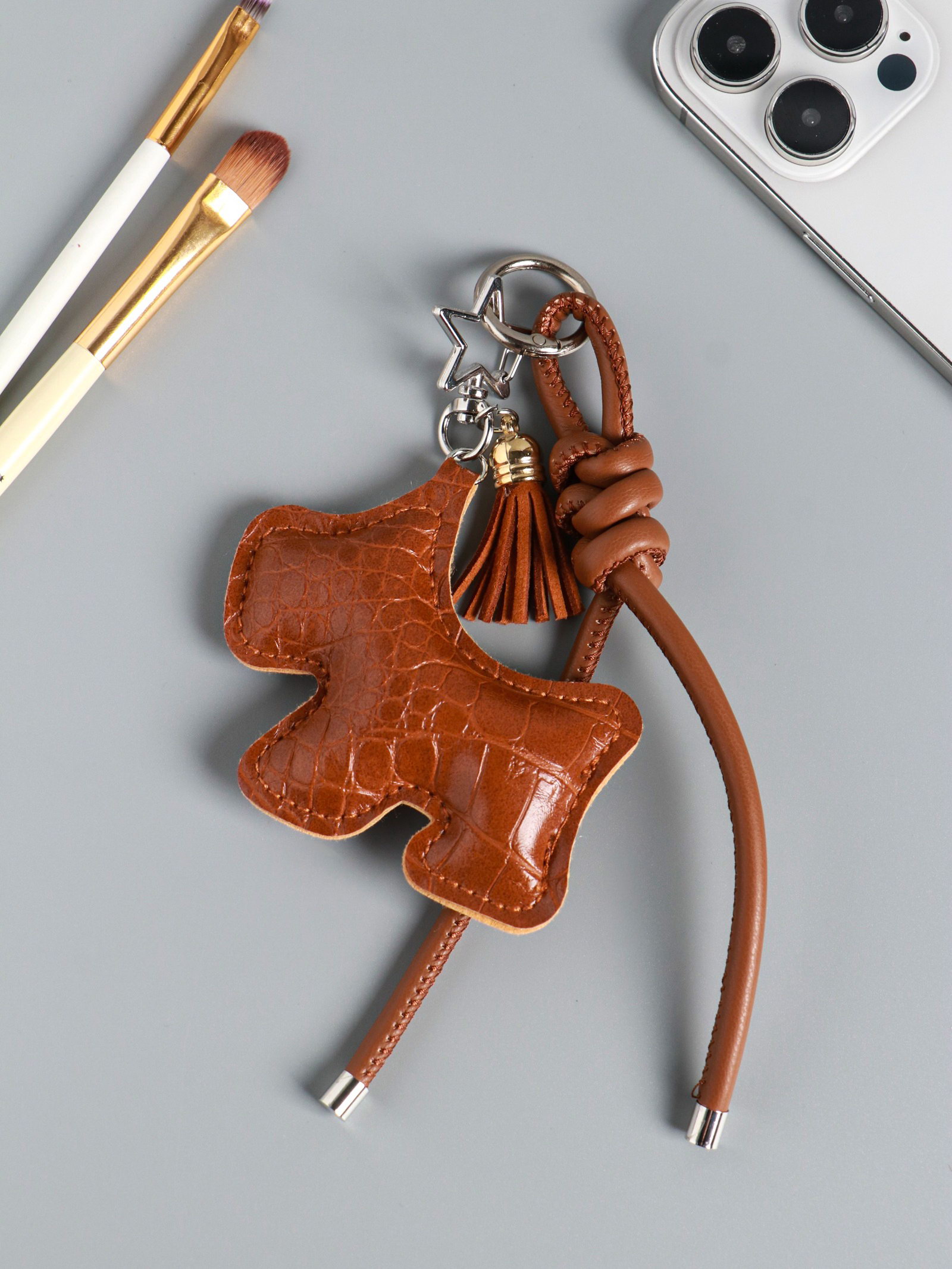 Брелок для ключей на карабине кожзам "Терьер", с узлом, шоколад, на сумку, рюкзак, 14x8x1.2 см, 8x14x1.2 см., Китай