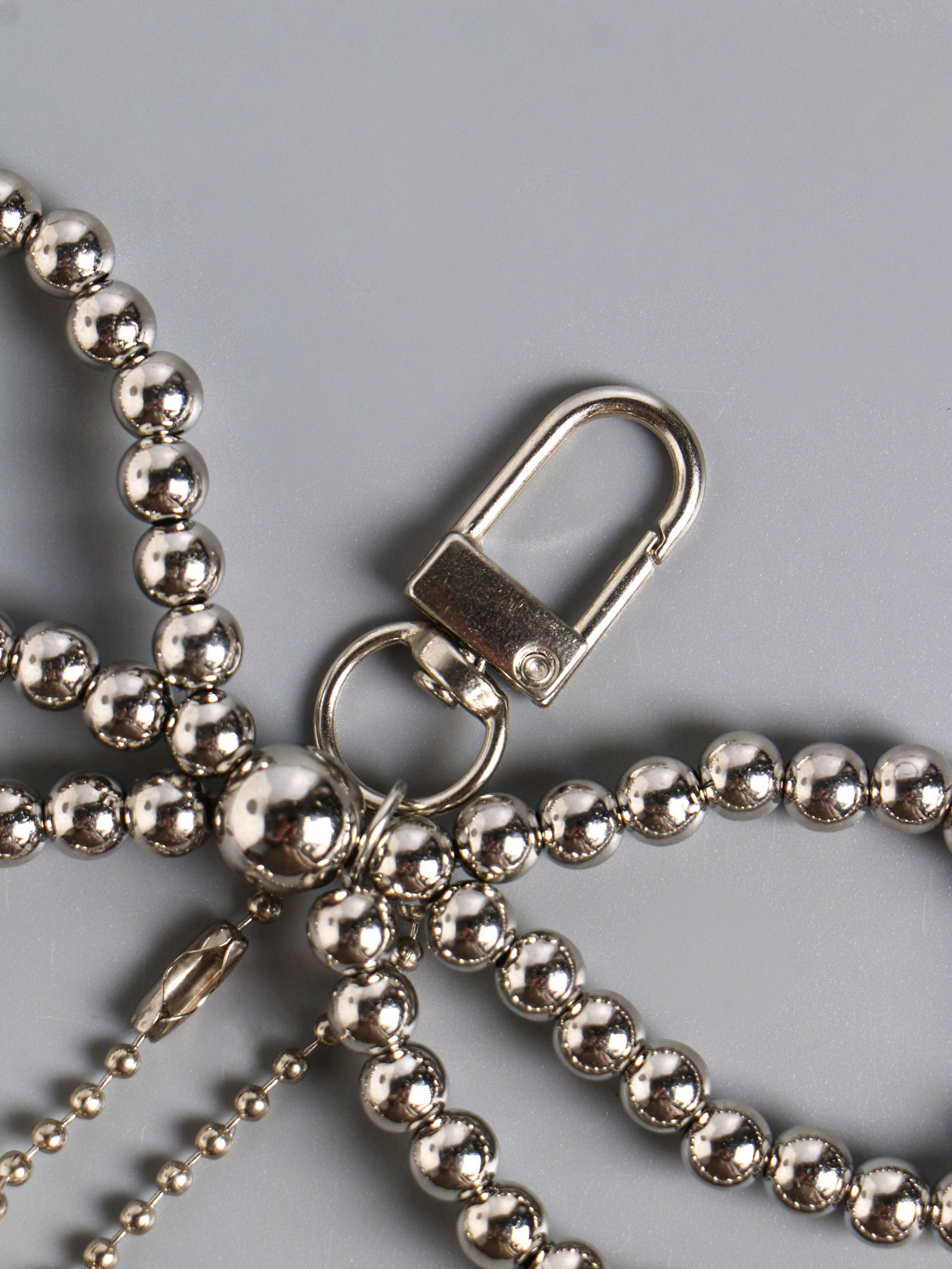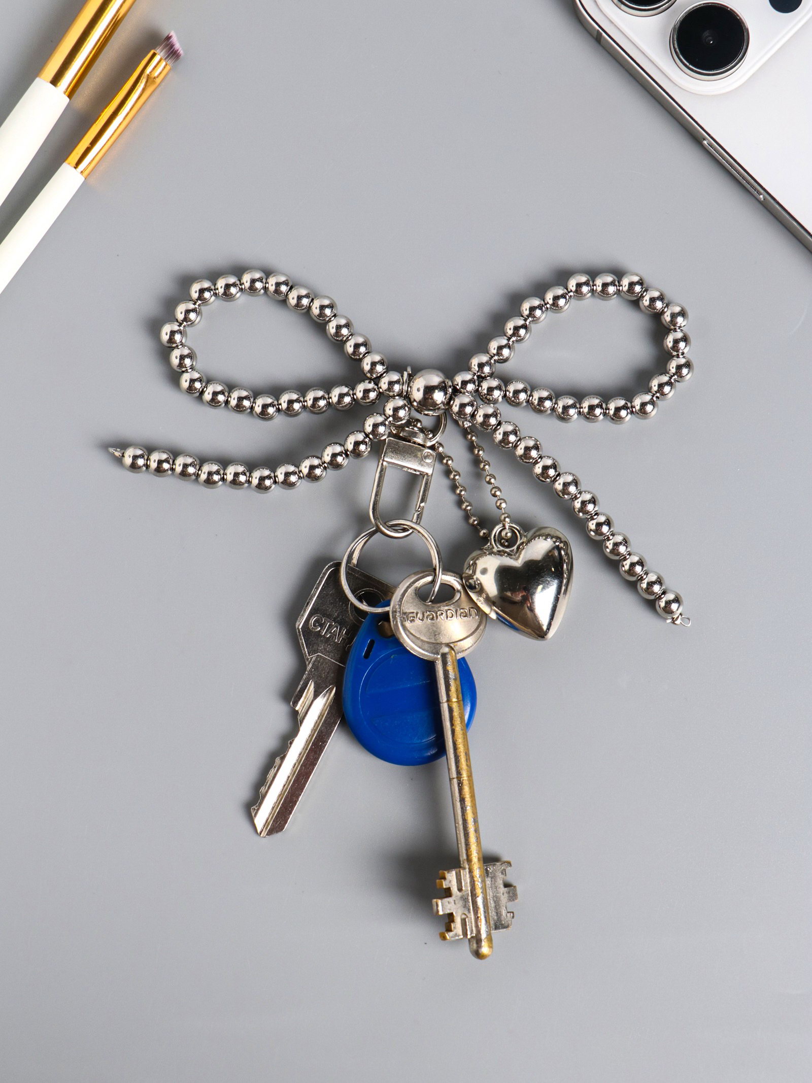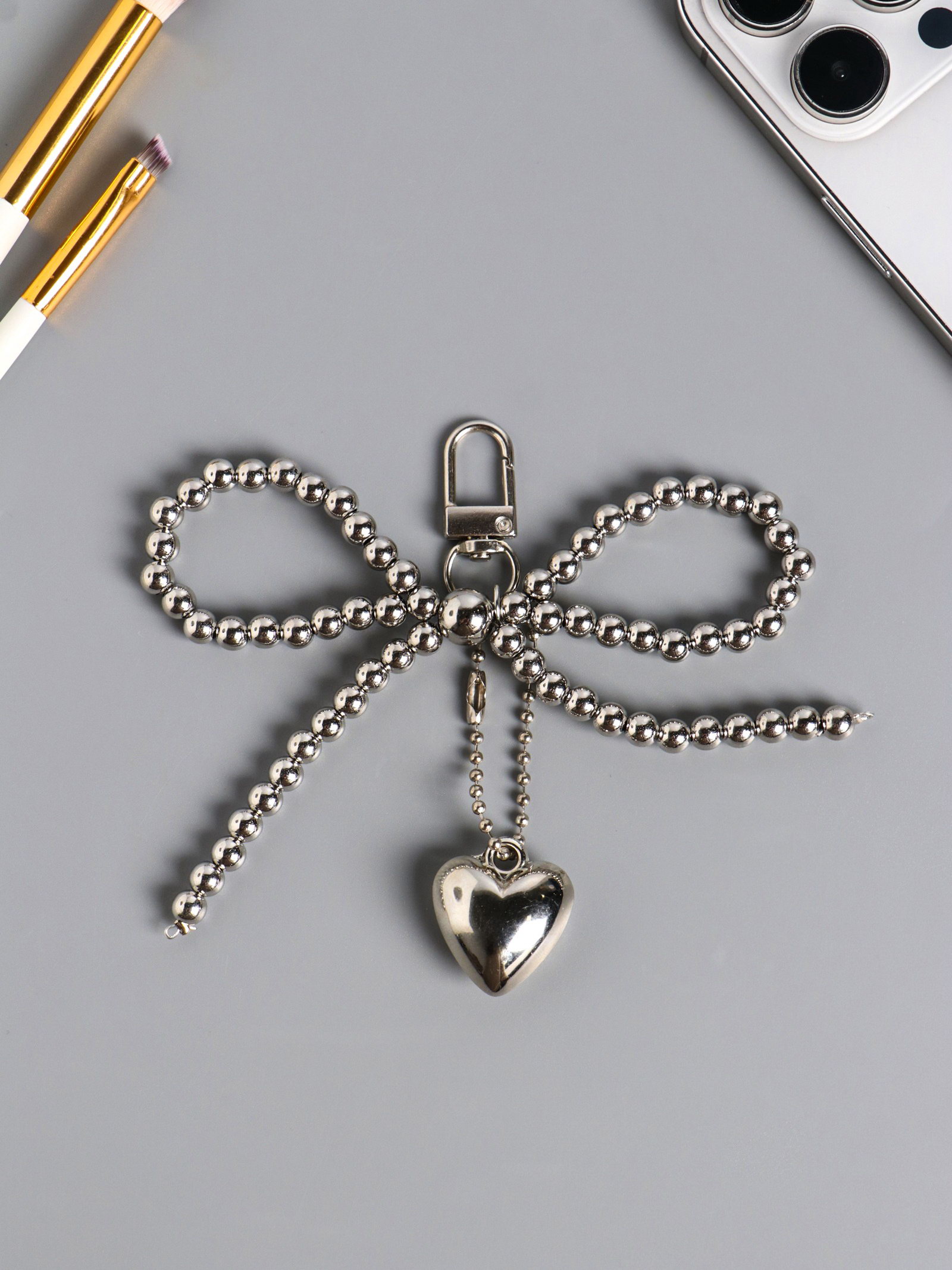 Брелок для ключей на карабине "Бант и сердце", на сумку, рюкзак, под серебро, бусины d=0.5 см сердце 2.7x3x1.5 12x12x1.5 см, 12x12x1.5 см., Китай
