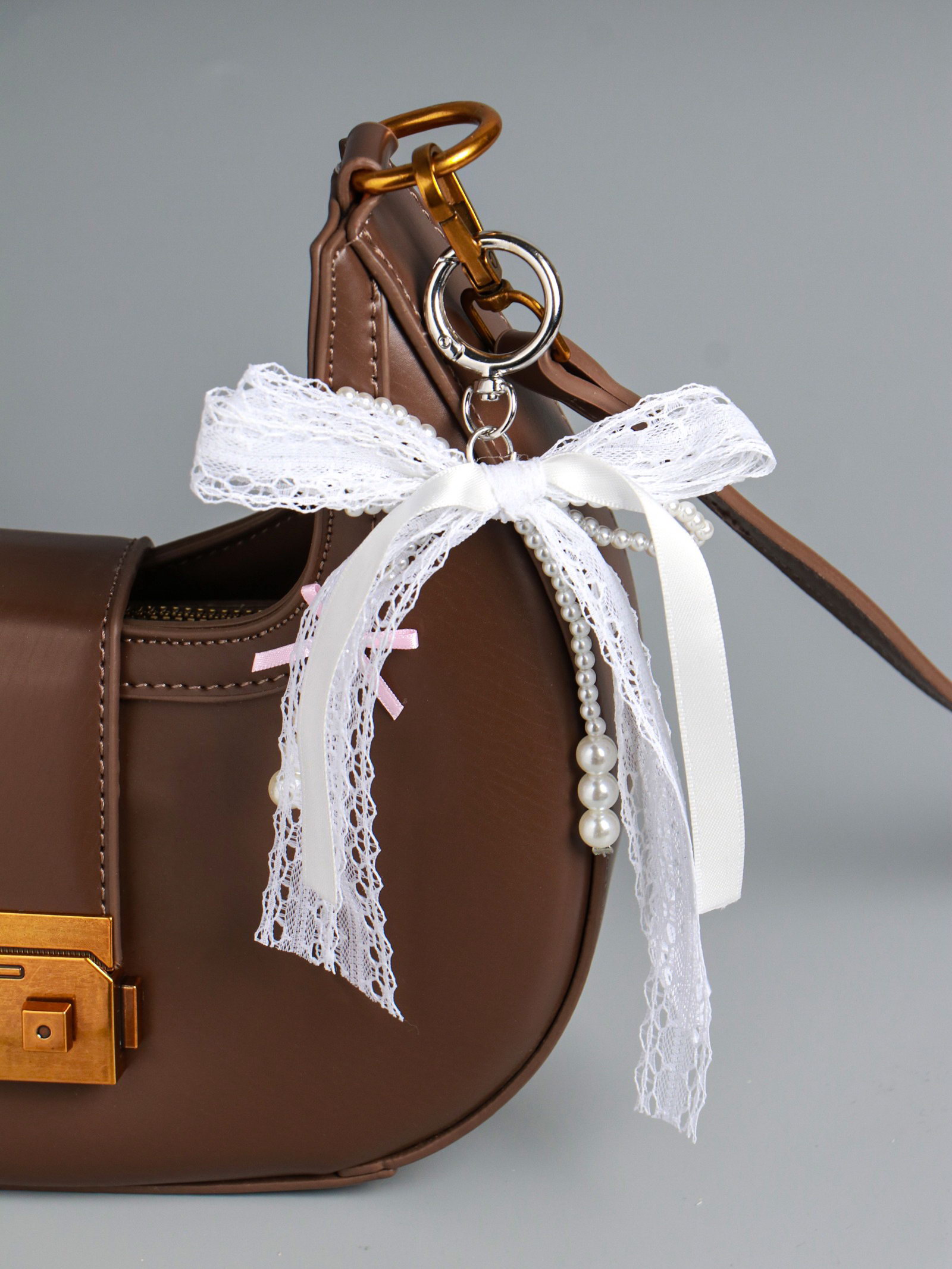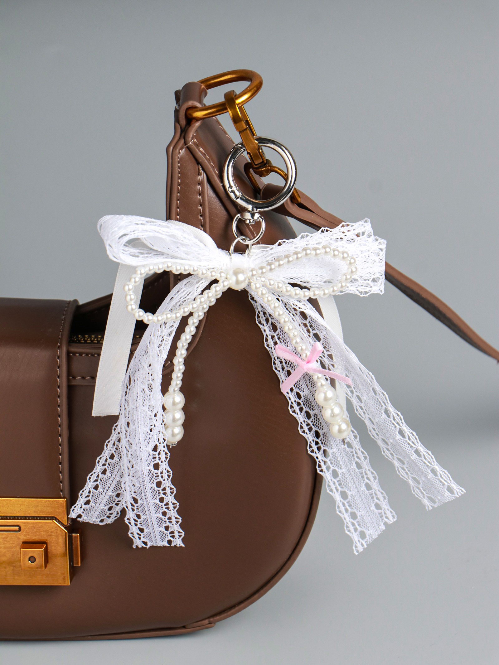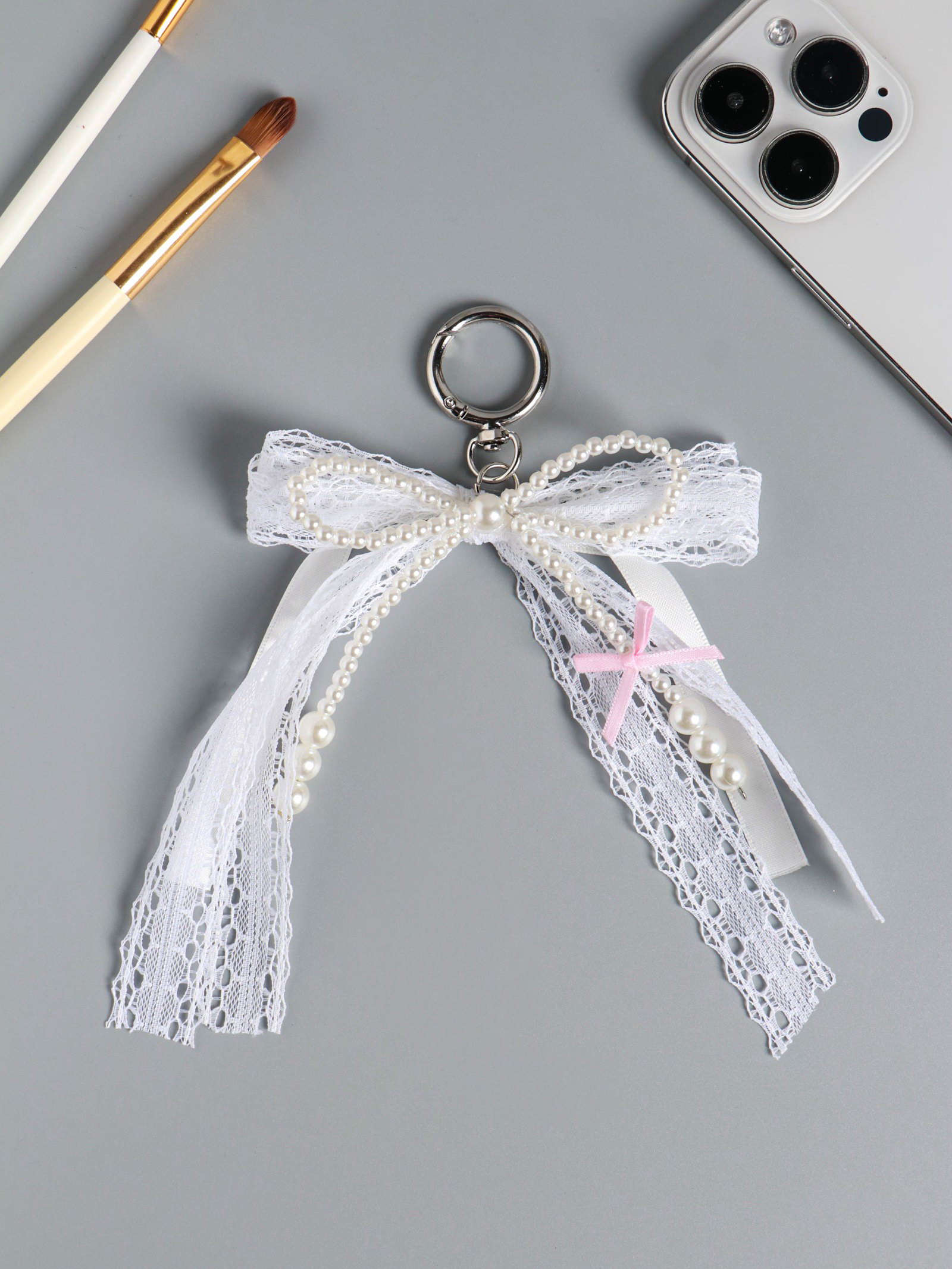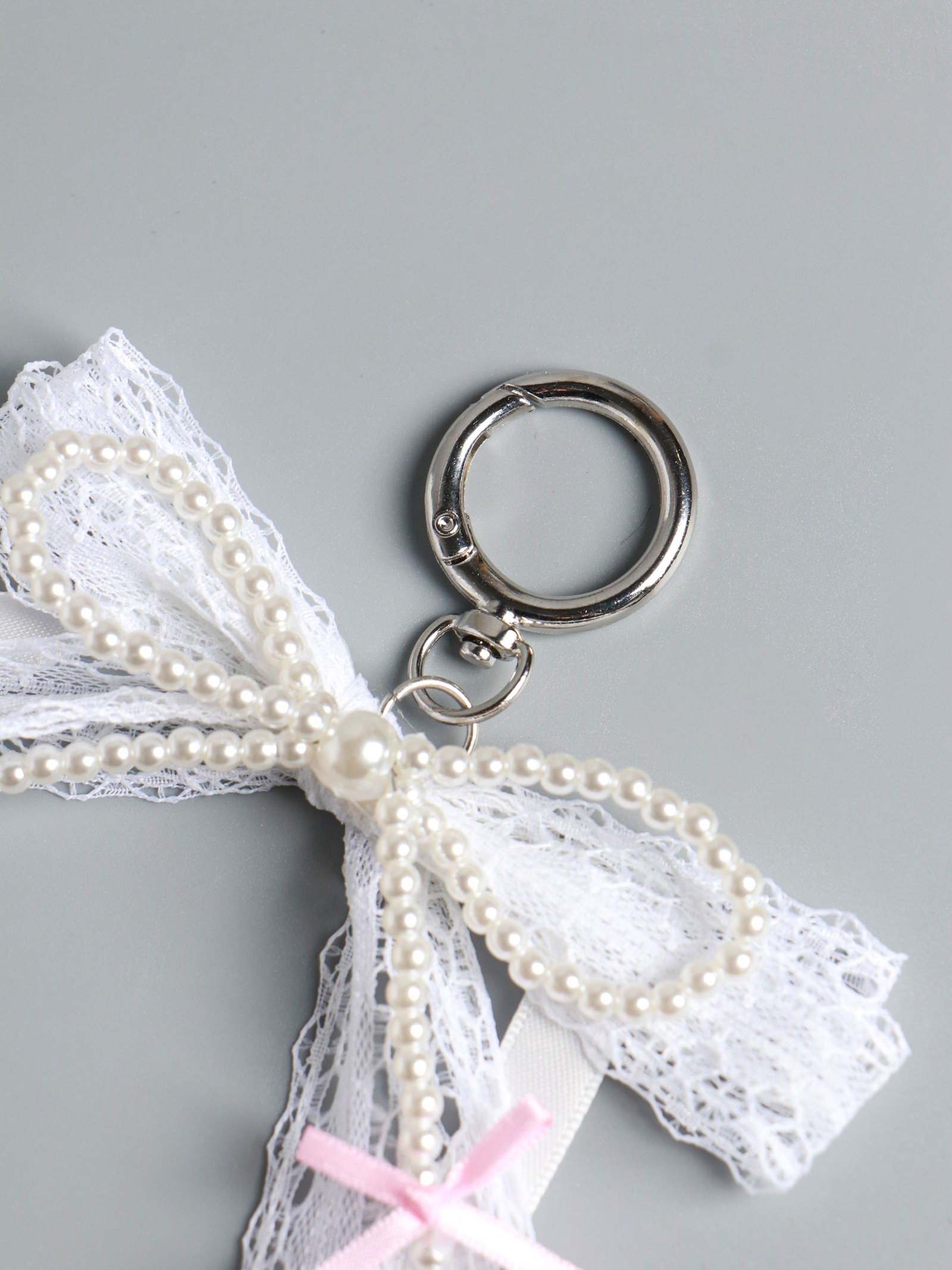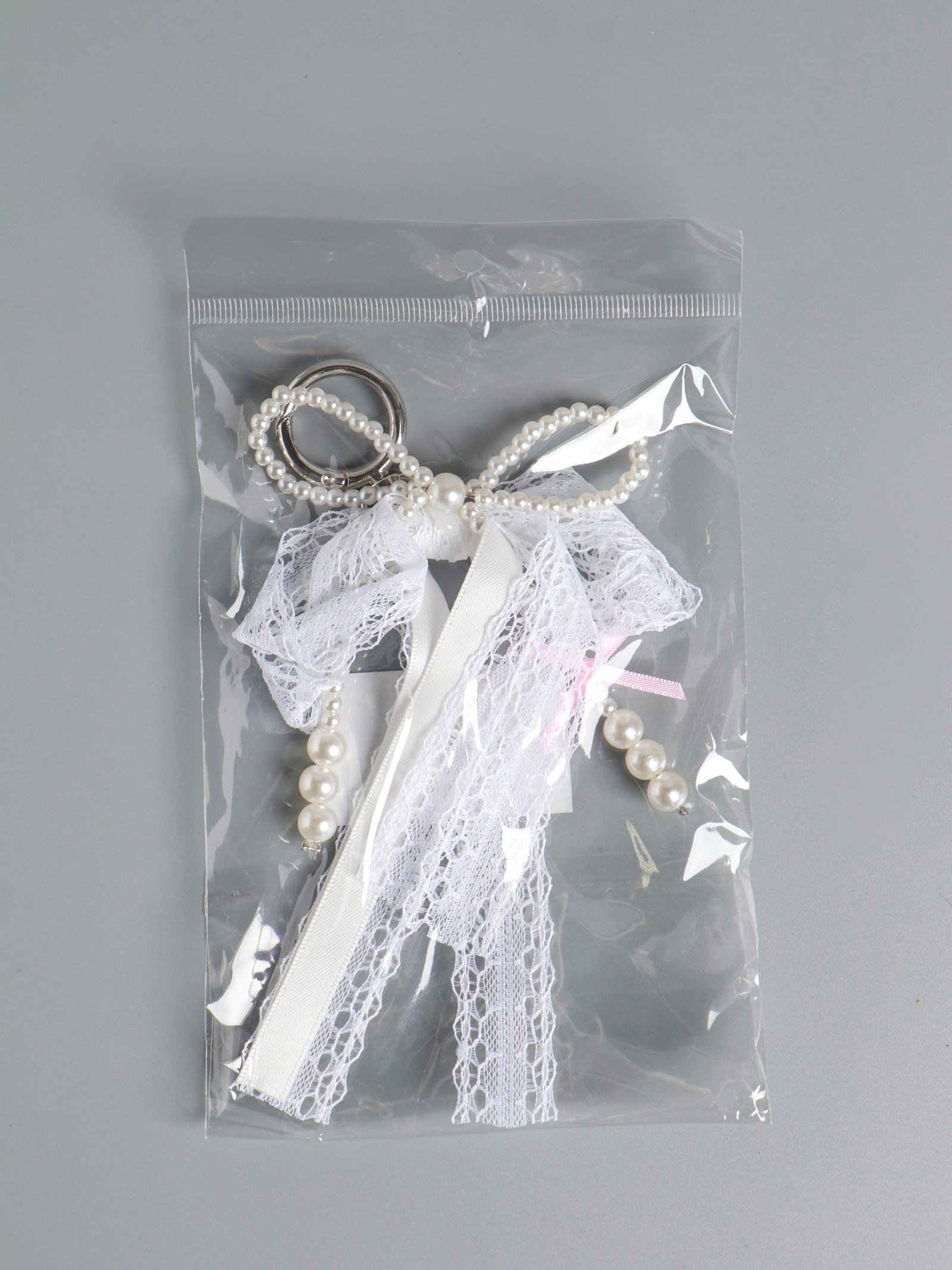 Брелок для ключей на карабине "Жемчужный бант с кружевной тесьмой", бусины d=0.4 и 0.8 см, на сумку, рюкзак, 16x9.5x1 см, 9.5x16x1 см., Китай