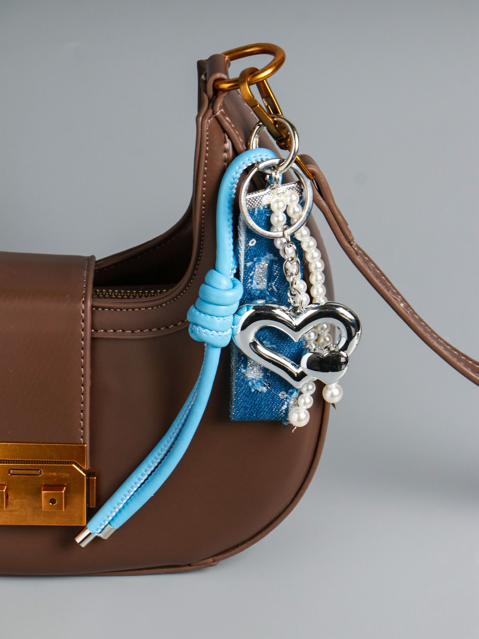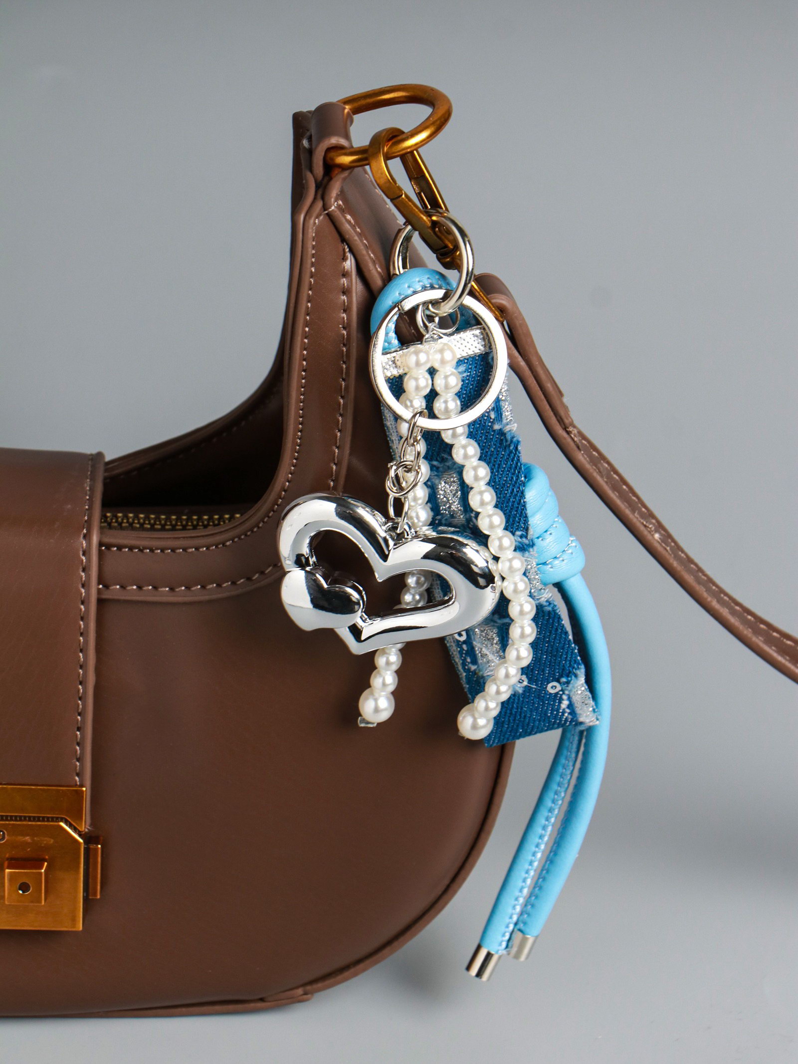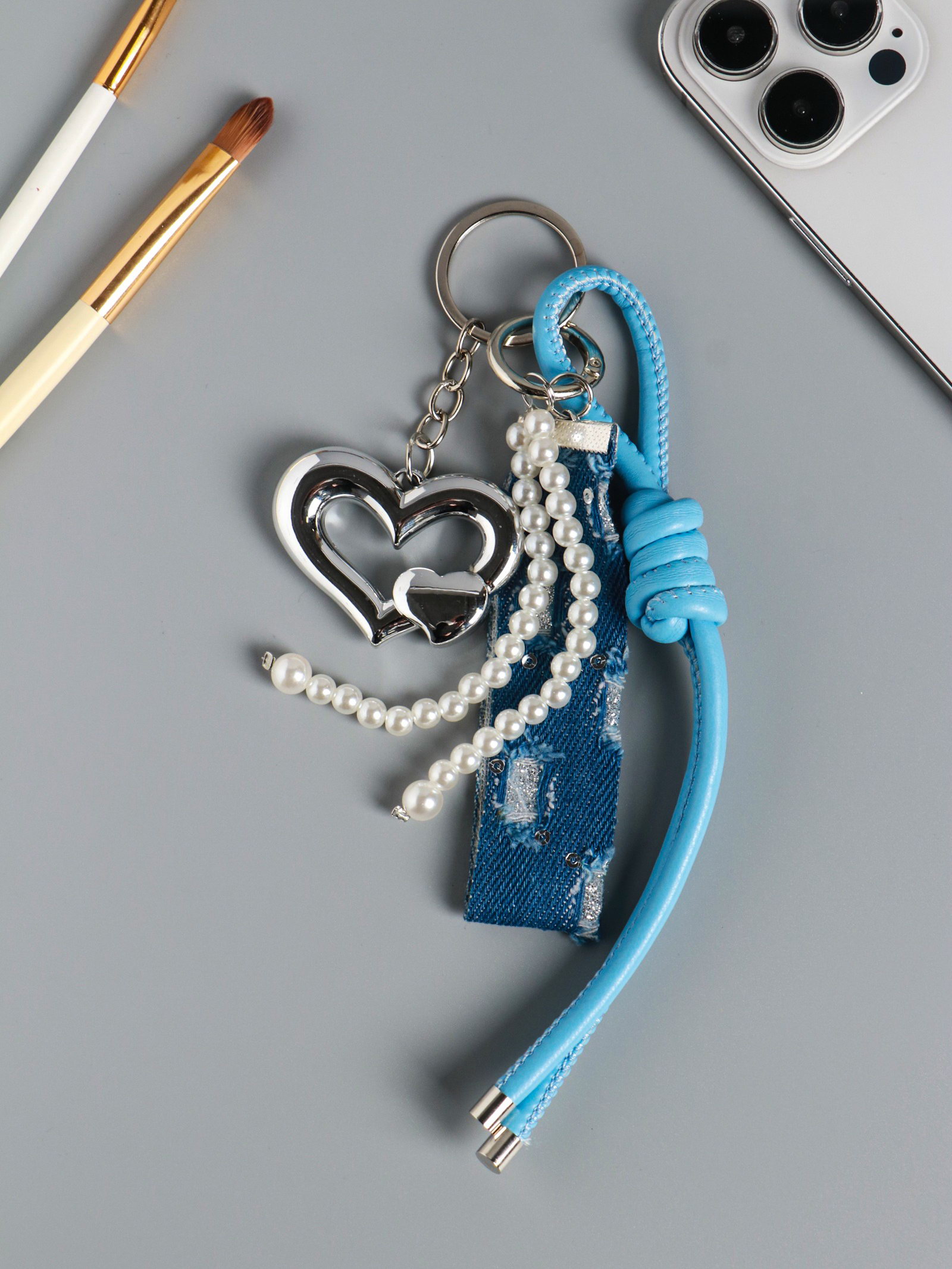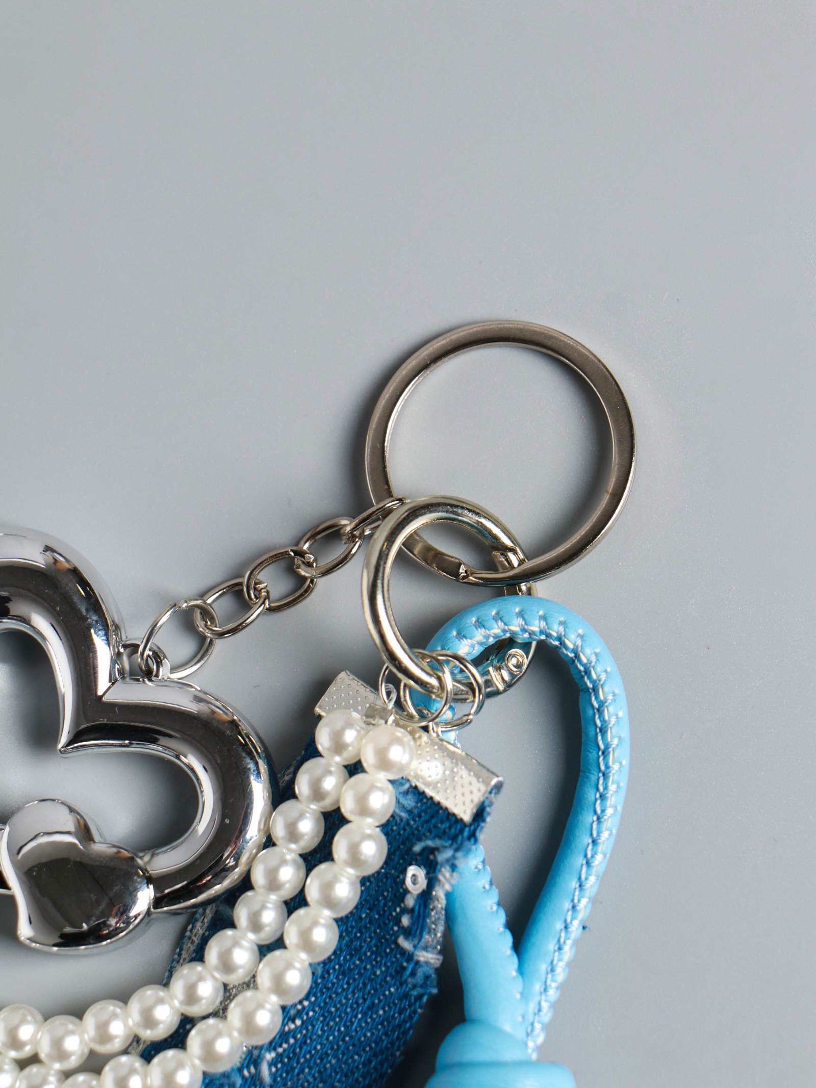 Брелок для ключей на карабине с джинсовым ремешком "Сердце и нить жемчуга", бусины d=0.5 см, на сумку, рюкзак, 18x4.8x2 см, 4.8x18x2 см., Китай
