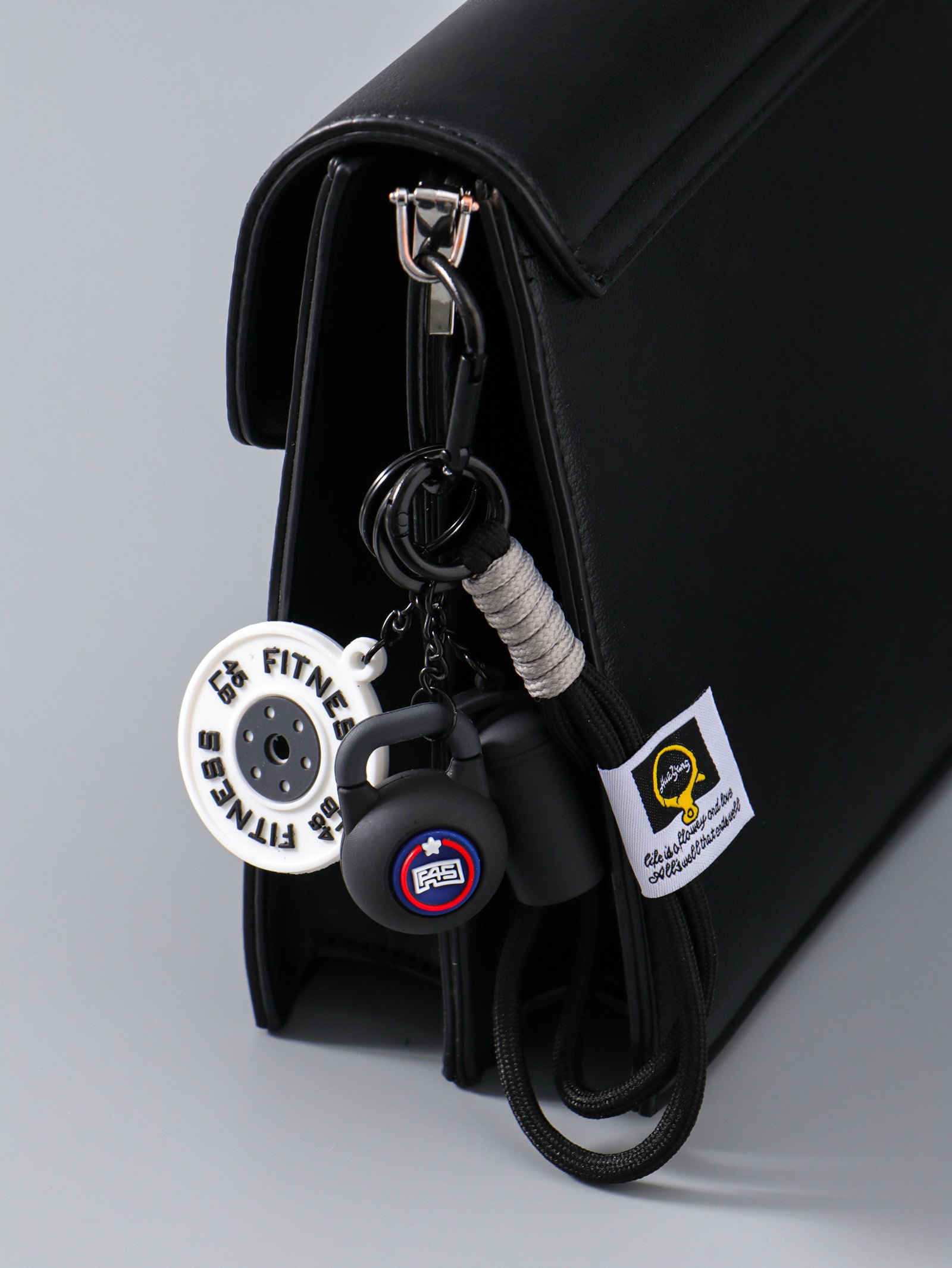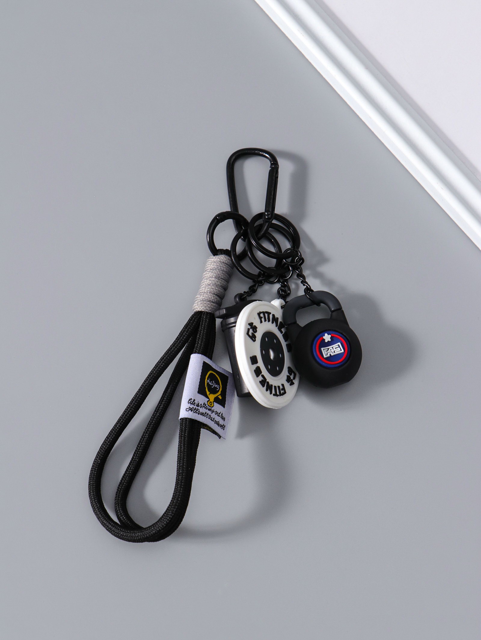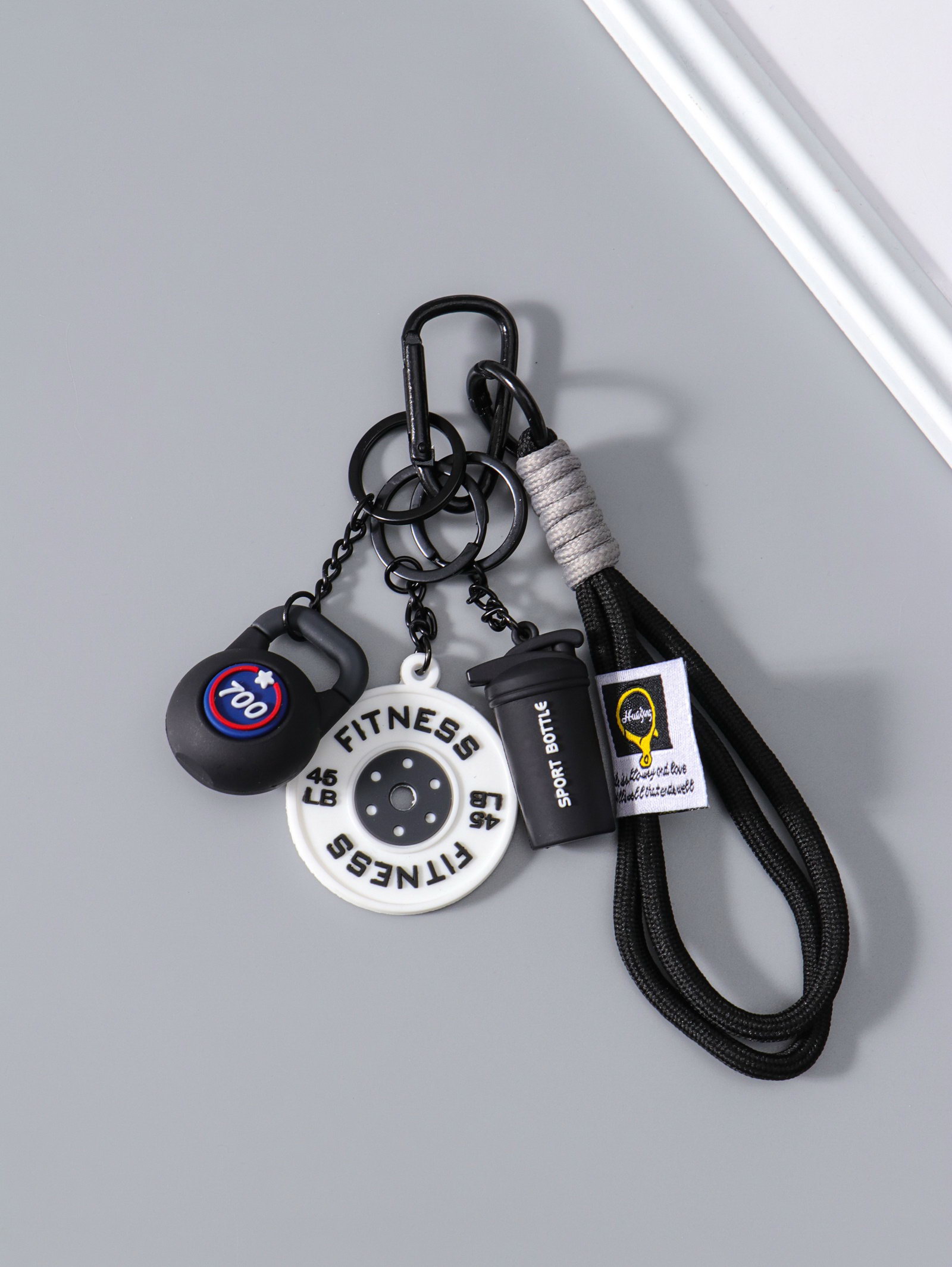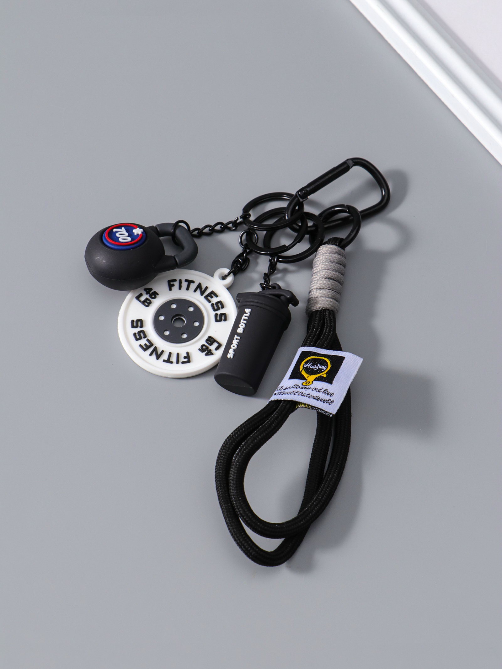 Брелок для ключей на кольце с карабином "Гиря, диск и бутылка", на рюкзак, сумку, чёрный, 13.5x4.5x2.2 см, 4.5x13.5x2.2 см., Китай