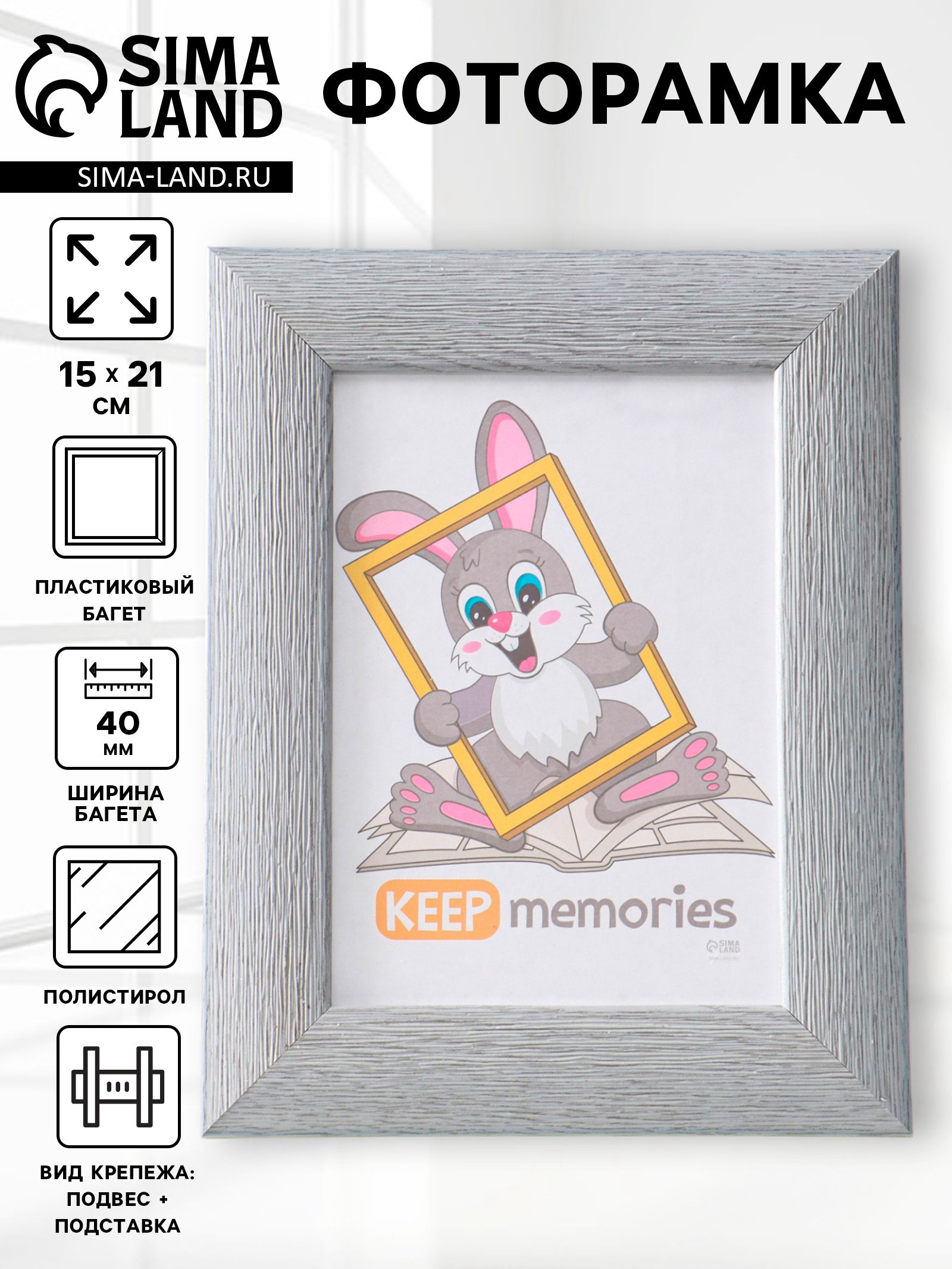 Размер упаковки: 28 x 1.3 x 22 см. tnved: 3926909700 Температурное ограничение: Нет Набор: Нет Вид крепежа: Подвес + Подставка Размер фото: 15 x 21 Цвет: Серый Ширина багета, мм: 40 Количество фотографий: 1 Паспарту: Нет Материал защитного экрана: Полистирол Материал багета: Пластик Эта фоторамка простой и надёжный способ сохранить особенный момент. Её сдержанный серо-голубой оттенок и строгий силуэт создают идеальный нейтральный фон, чтобы в центре внимания оставалось ваше фото размером 15x21 см Особенности
