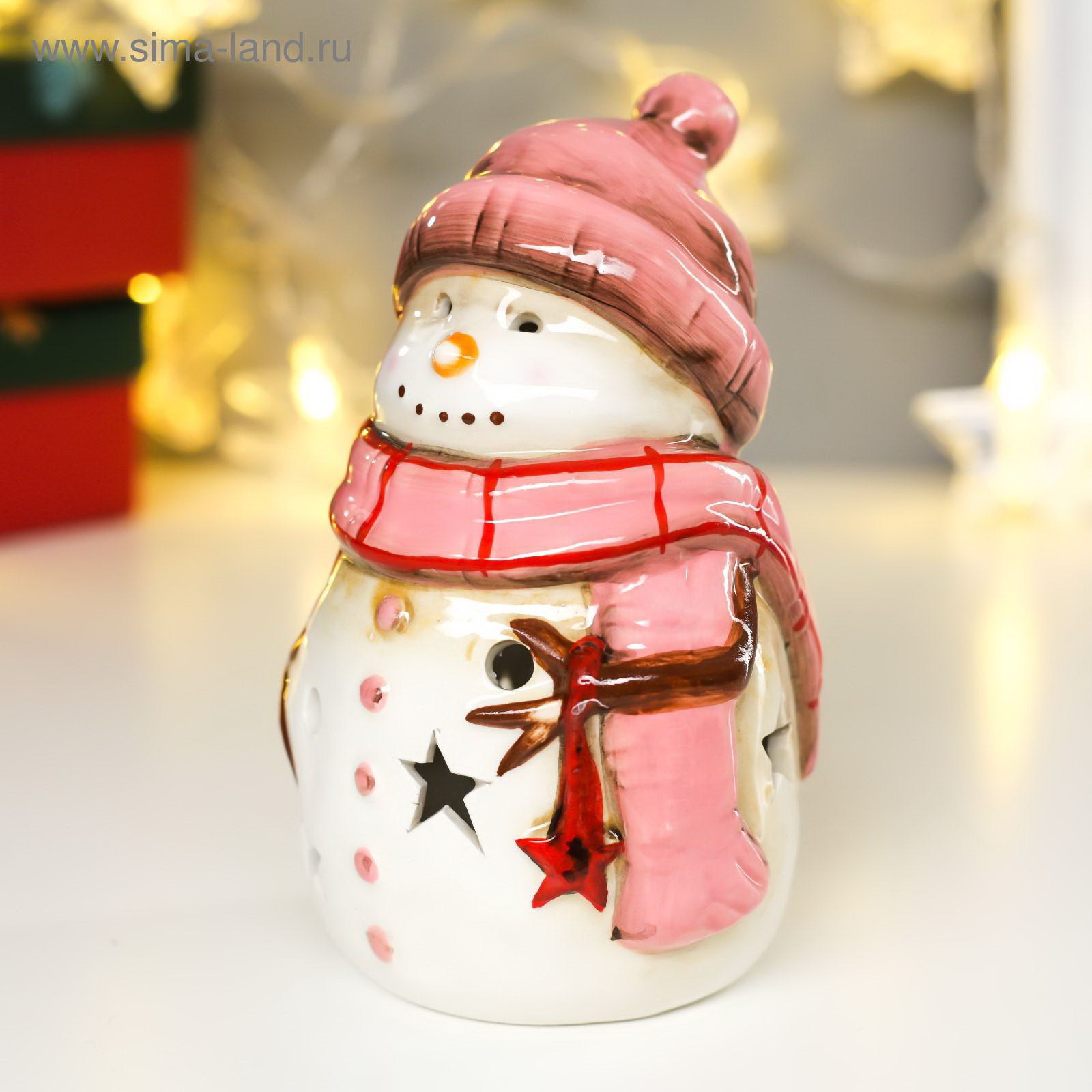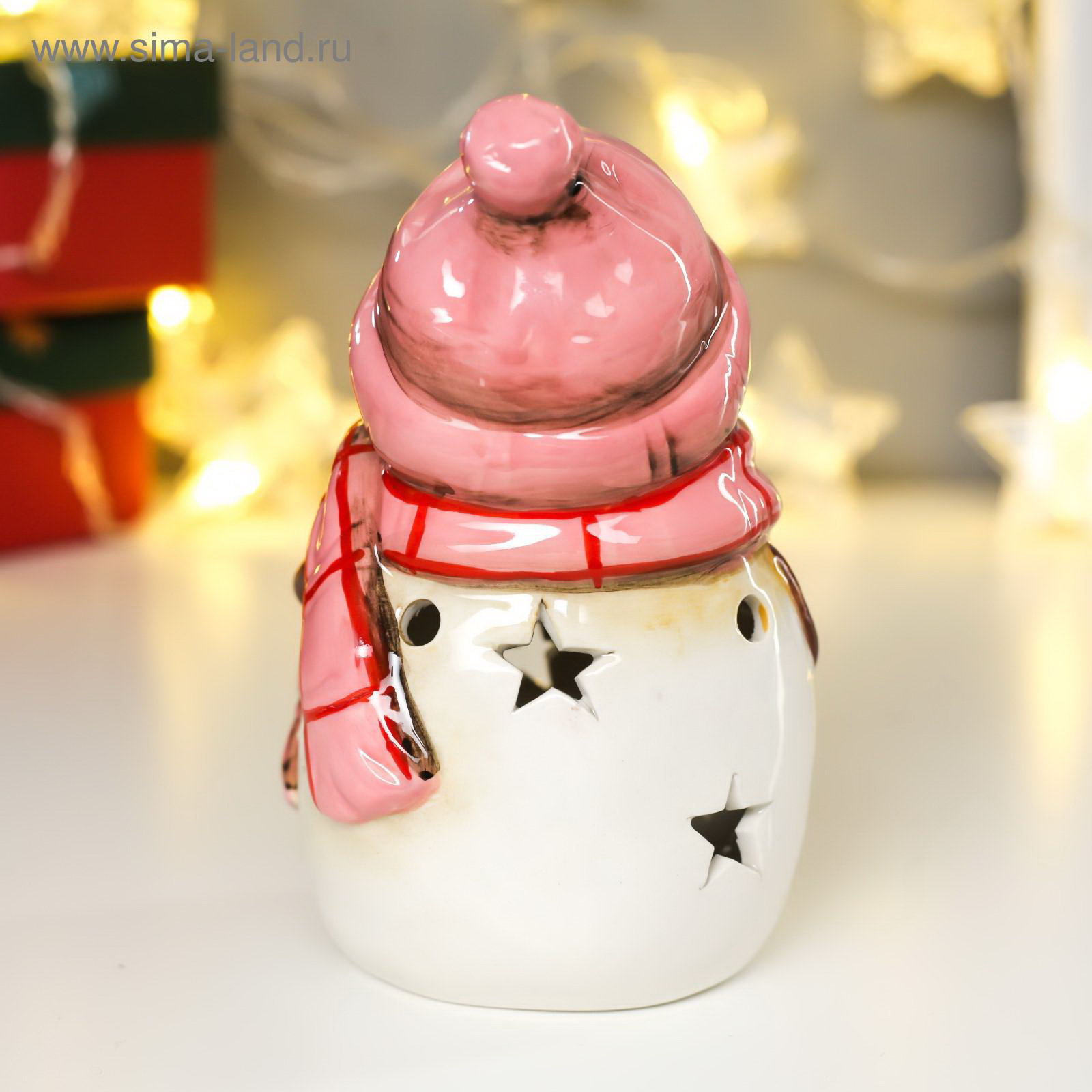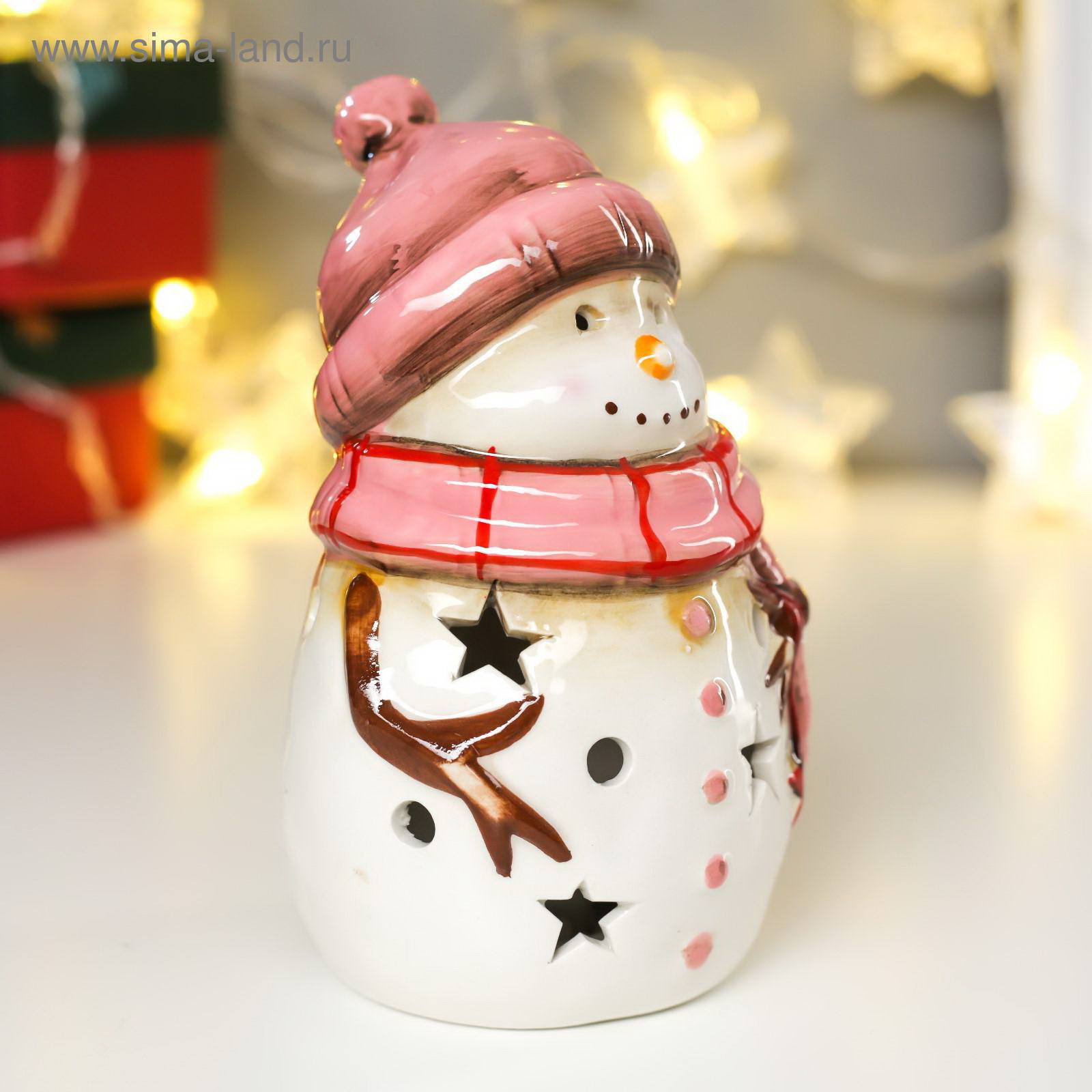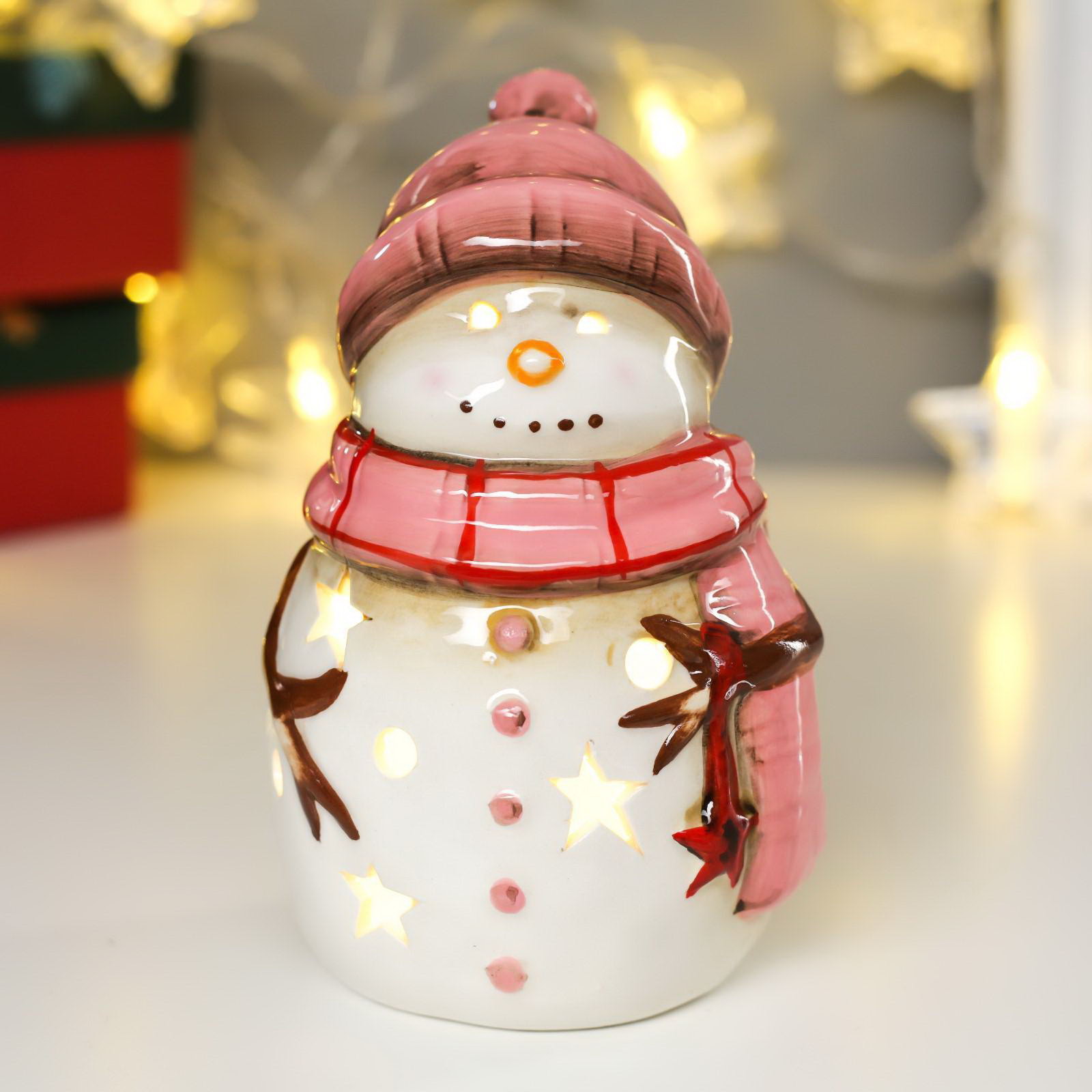 Сувенир керамика свет "Снеговик в розовой вязаной шапке и шарфе" 13.5х8х8.3 см, 8x8.3x13.5 см., Китай
