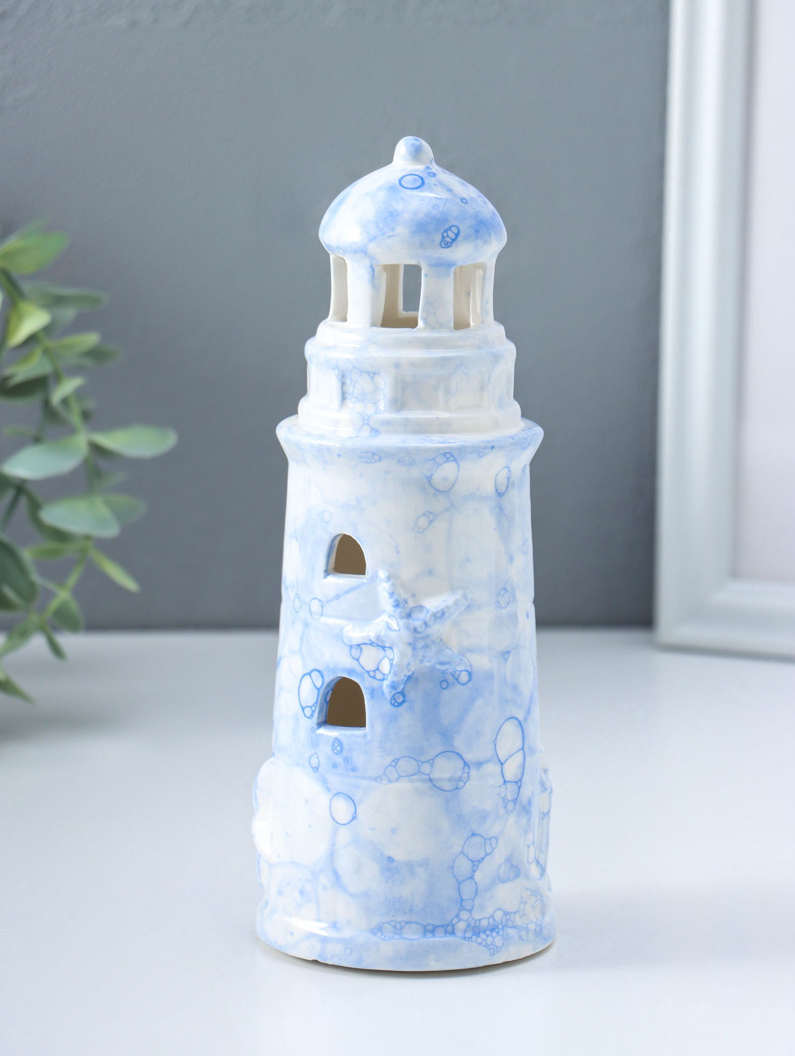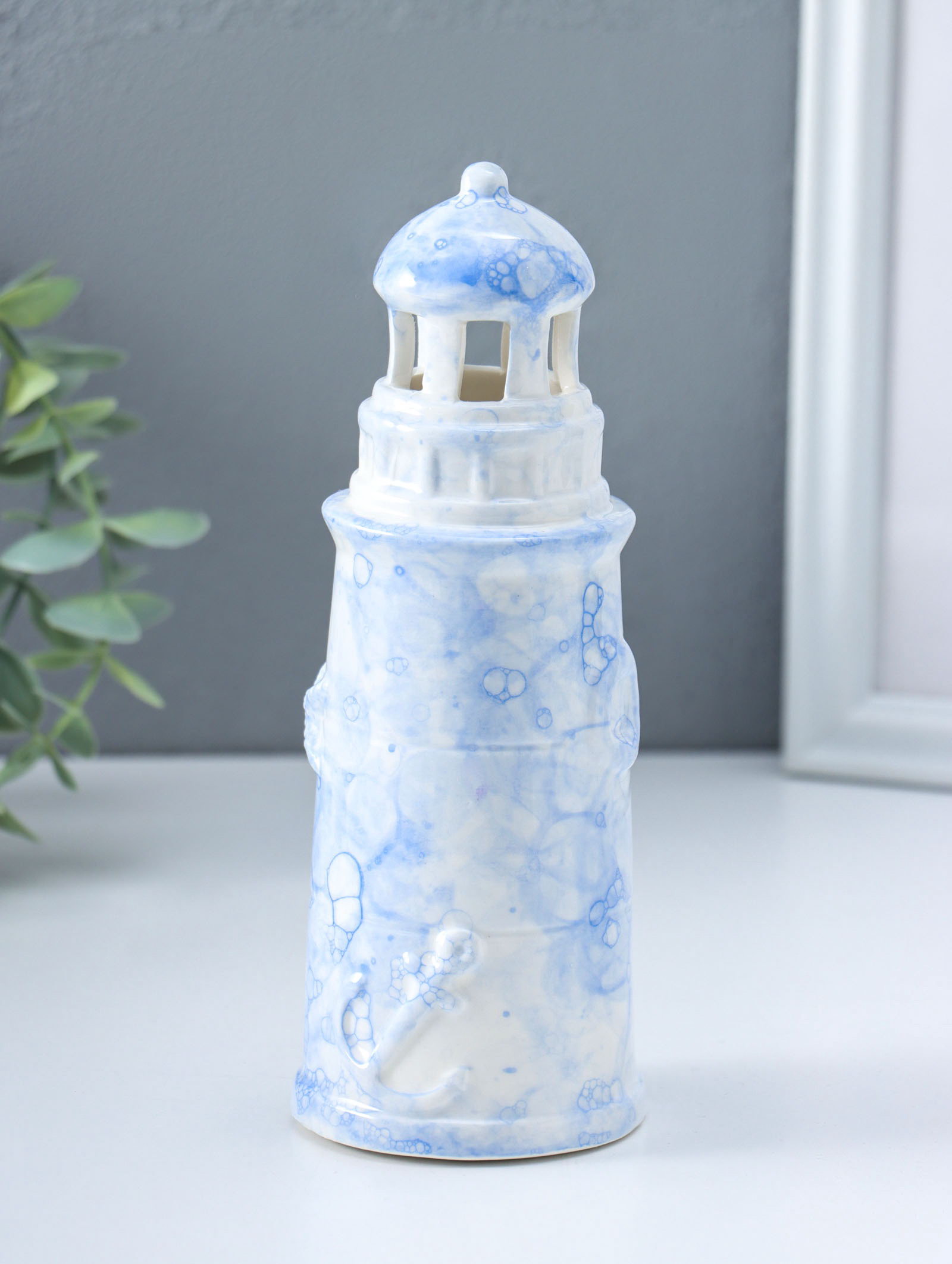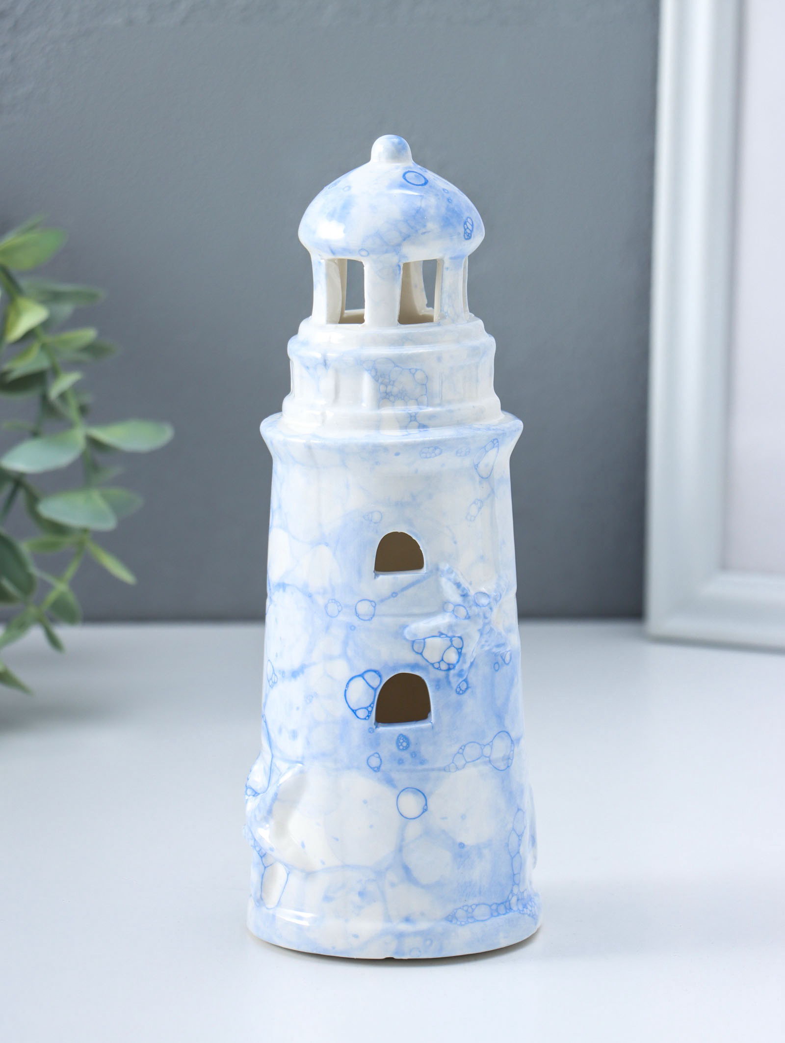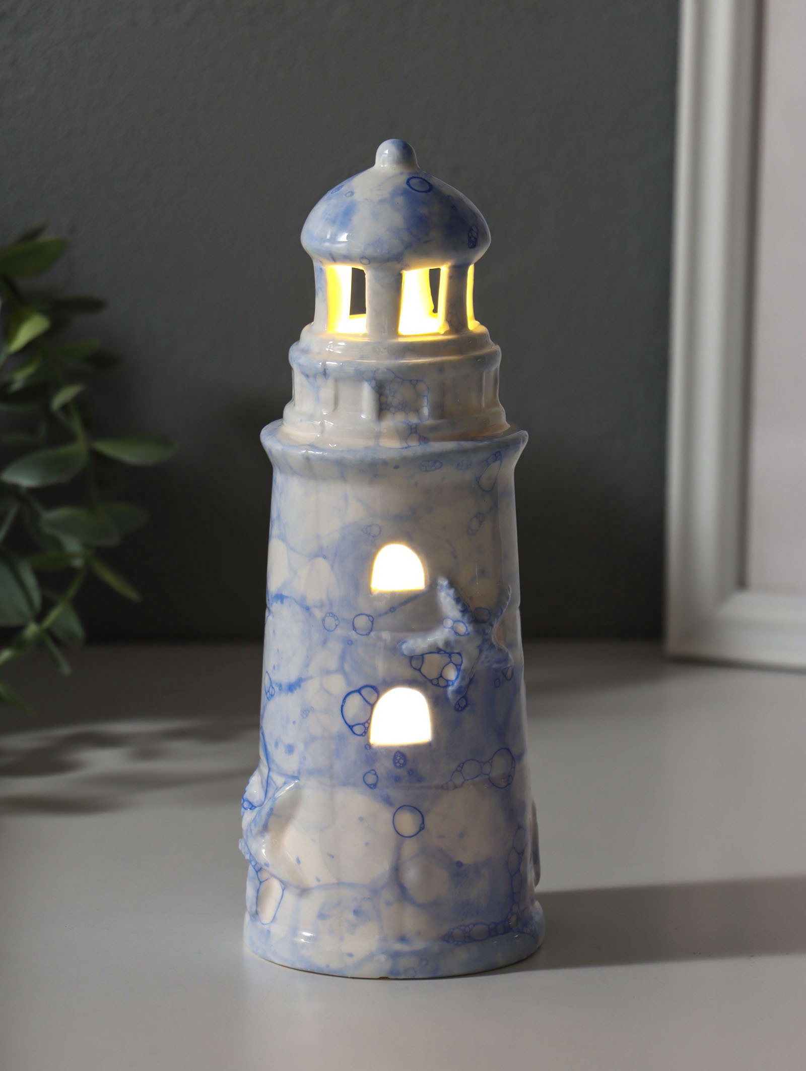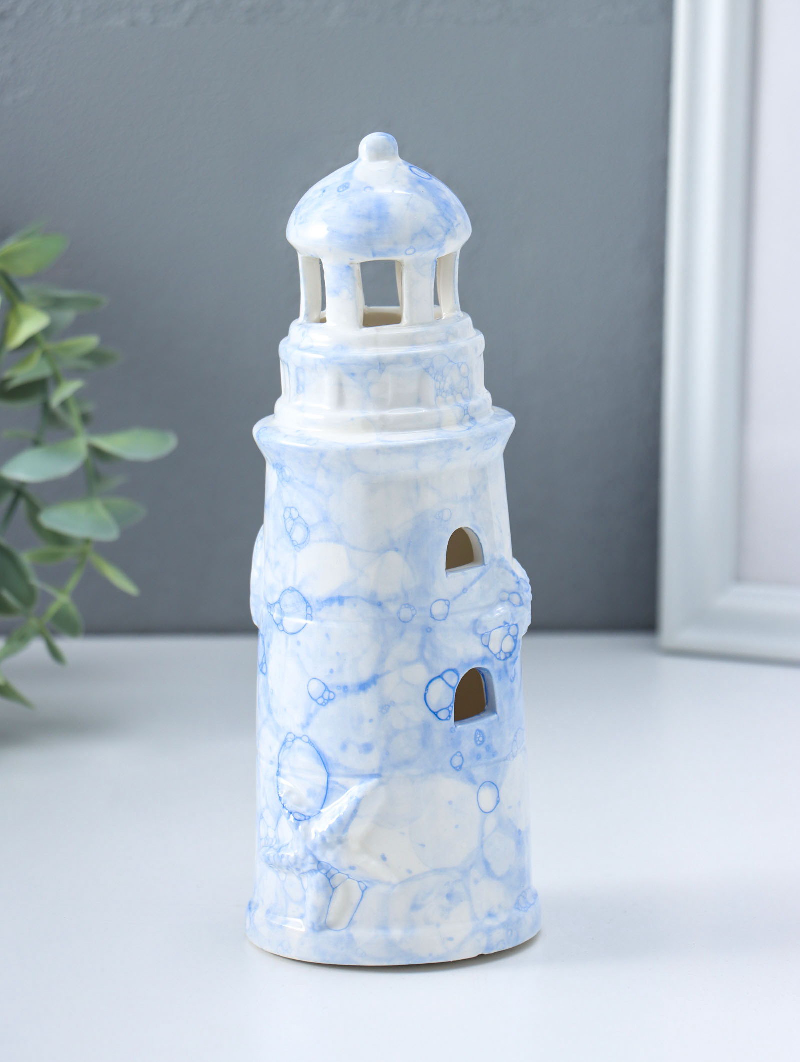 Сувенир керамика свет "Маяк" мраморный бело-синий 6.5х6.5х18 см, 6.5x6.5x18 см., Китай