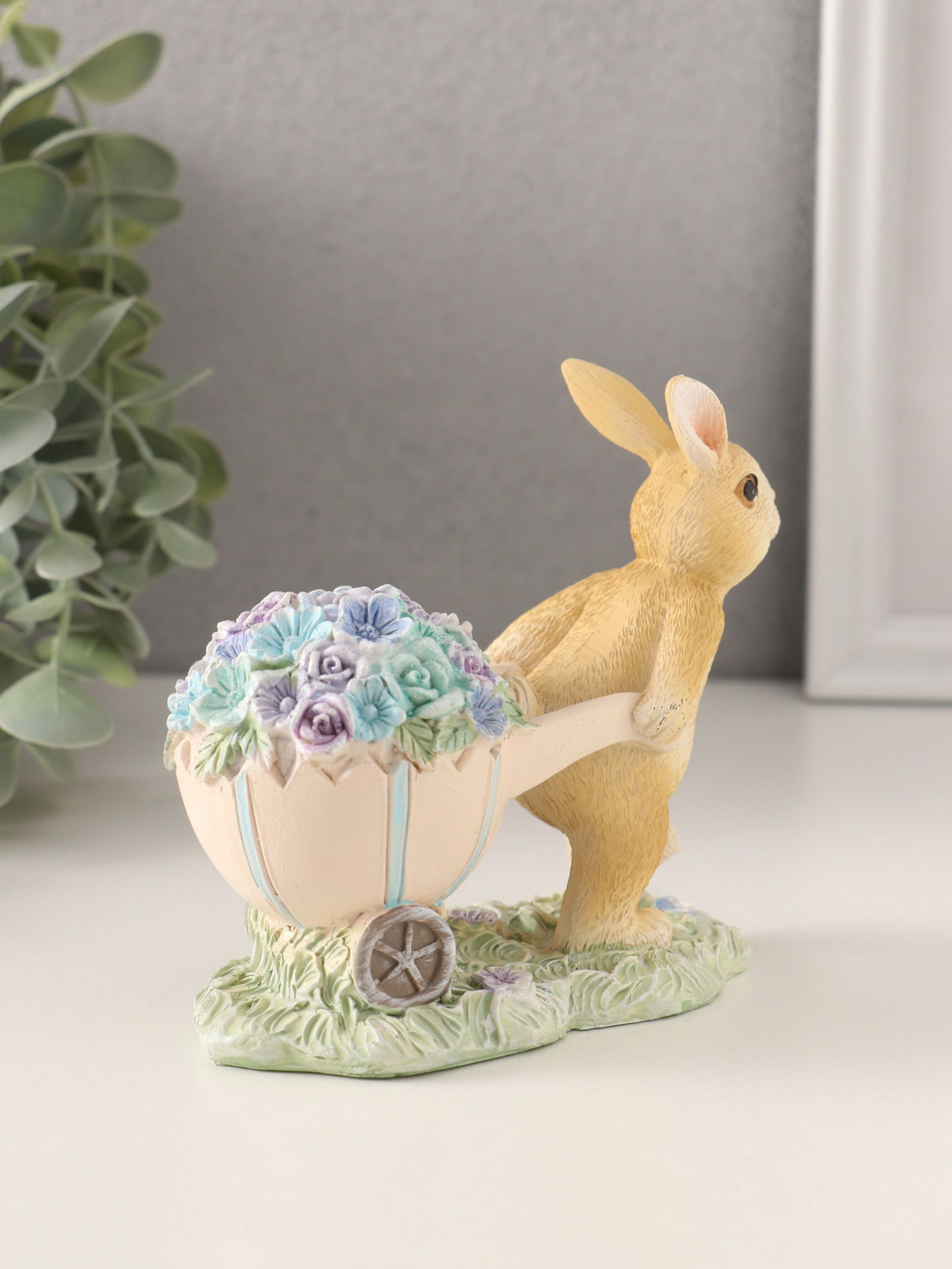 Фигурка полистоун "Зайчик с тележкой роз и незабудок", 11x6x10.5 см, 6x11x10.5 см., Китай