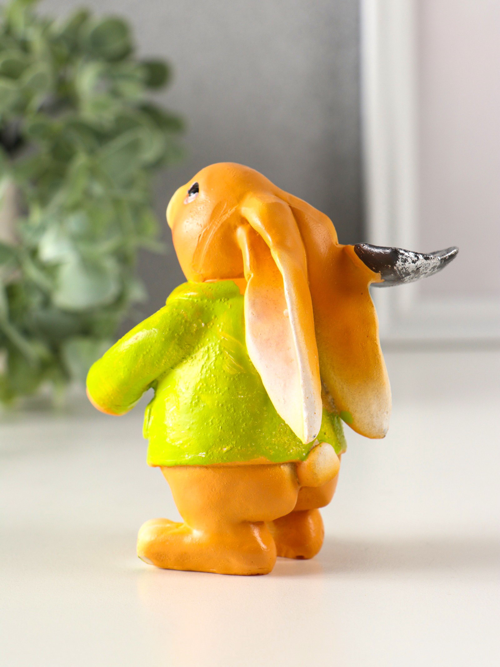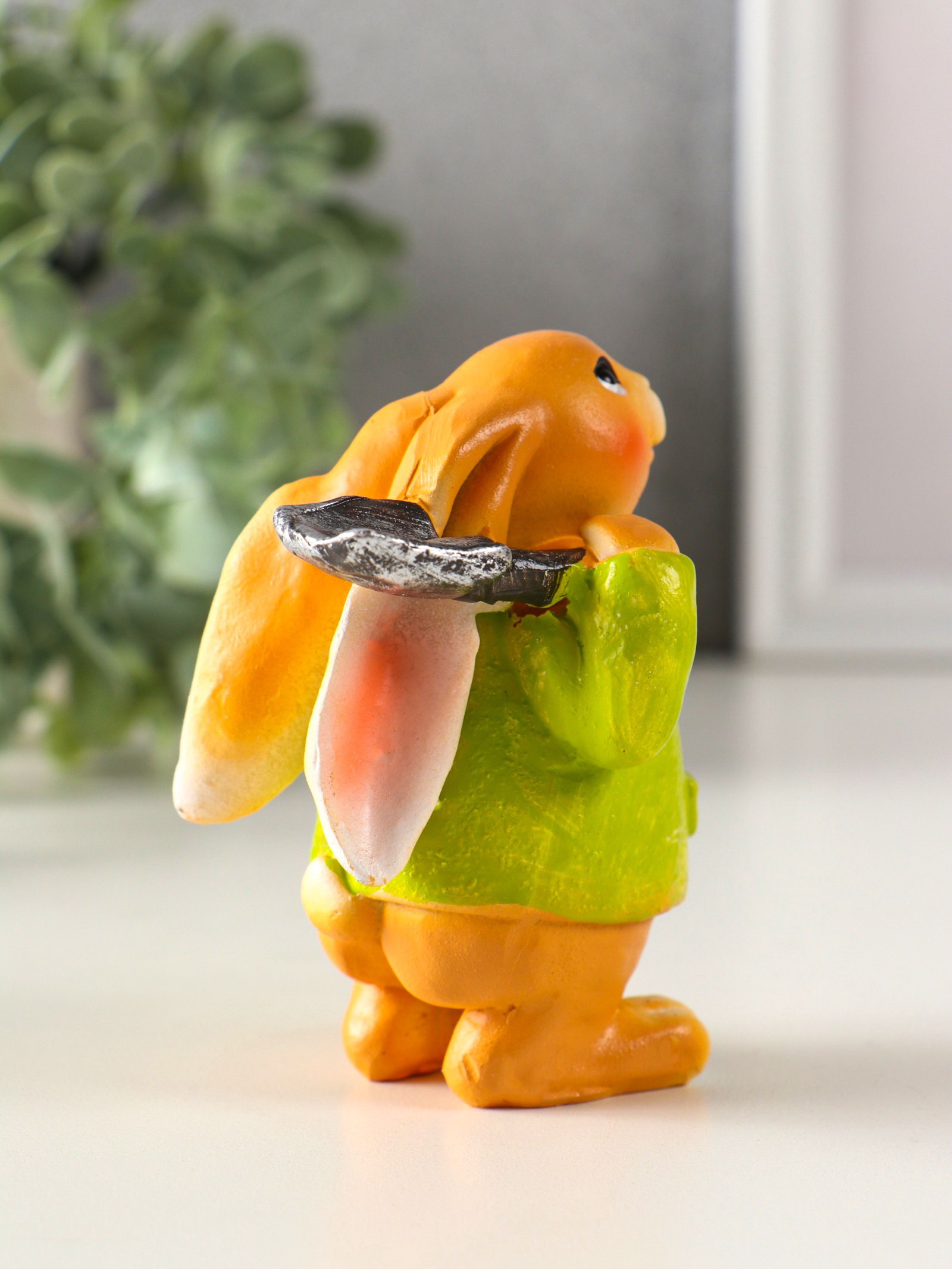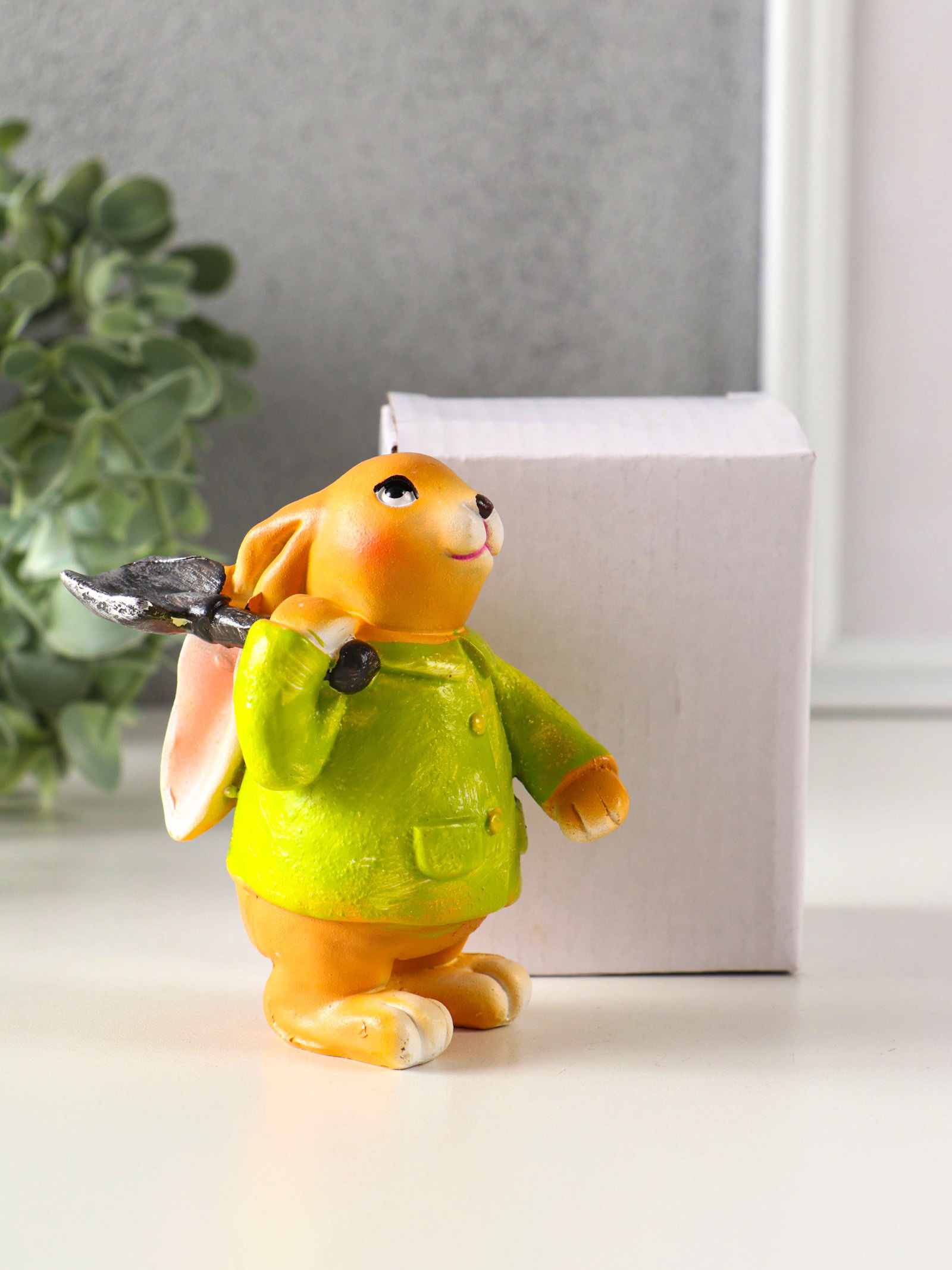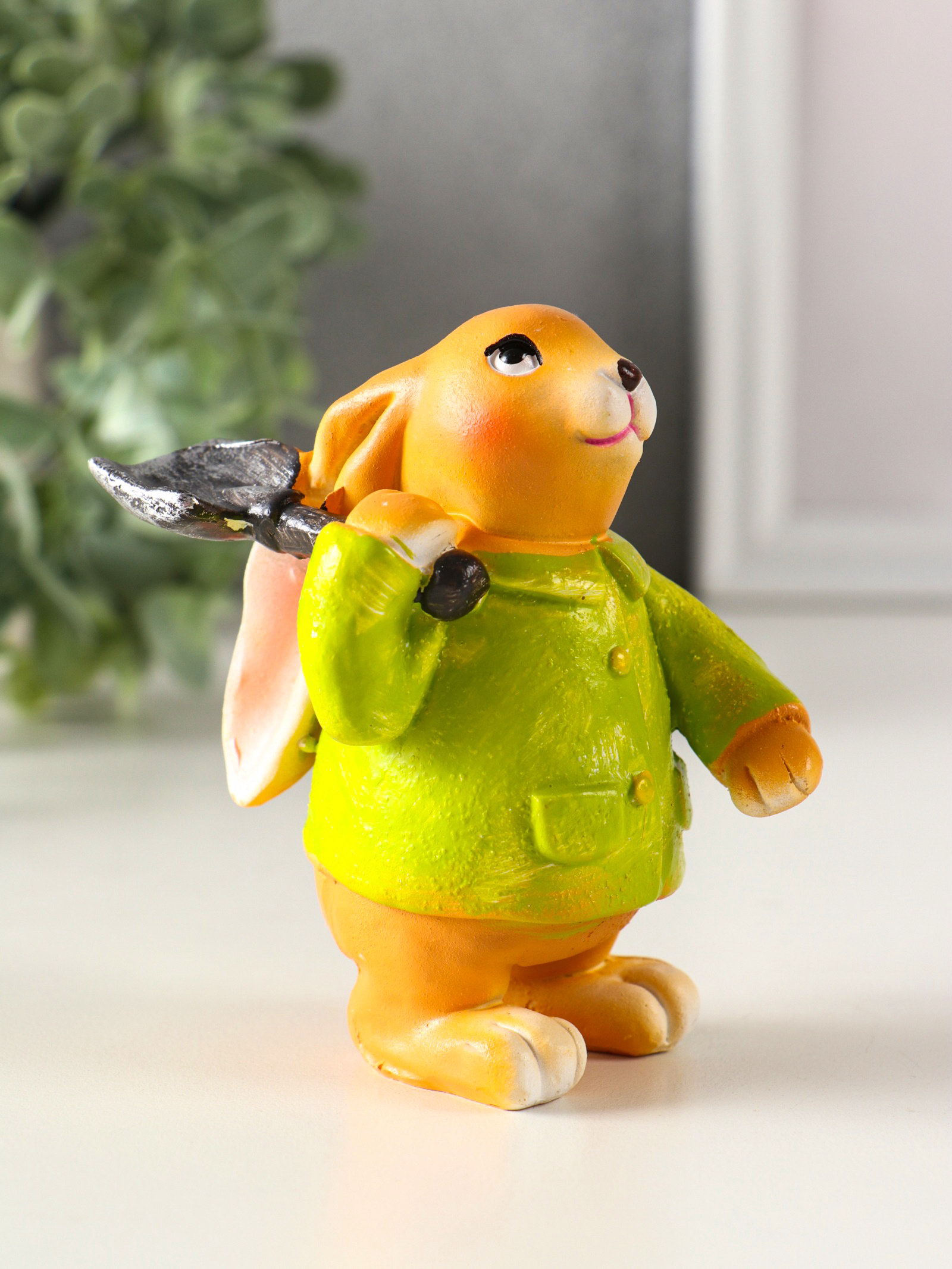 Фигурка полистоун "Зайчик с лопатой, в зелёном пальто", 6x7.5x9.5 см, 7.5x6x9.5 см., Китай