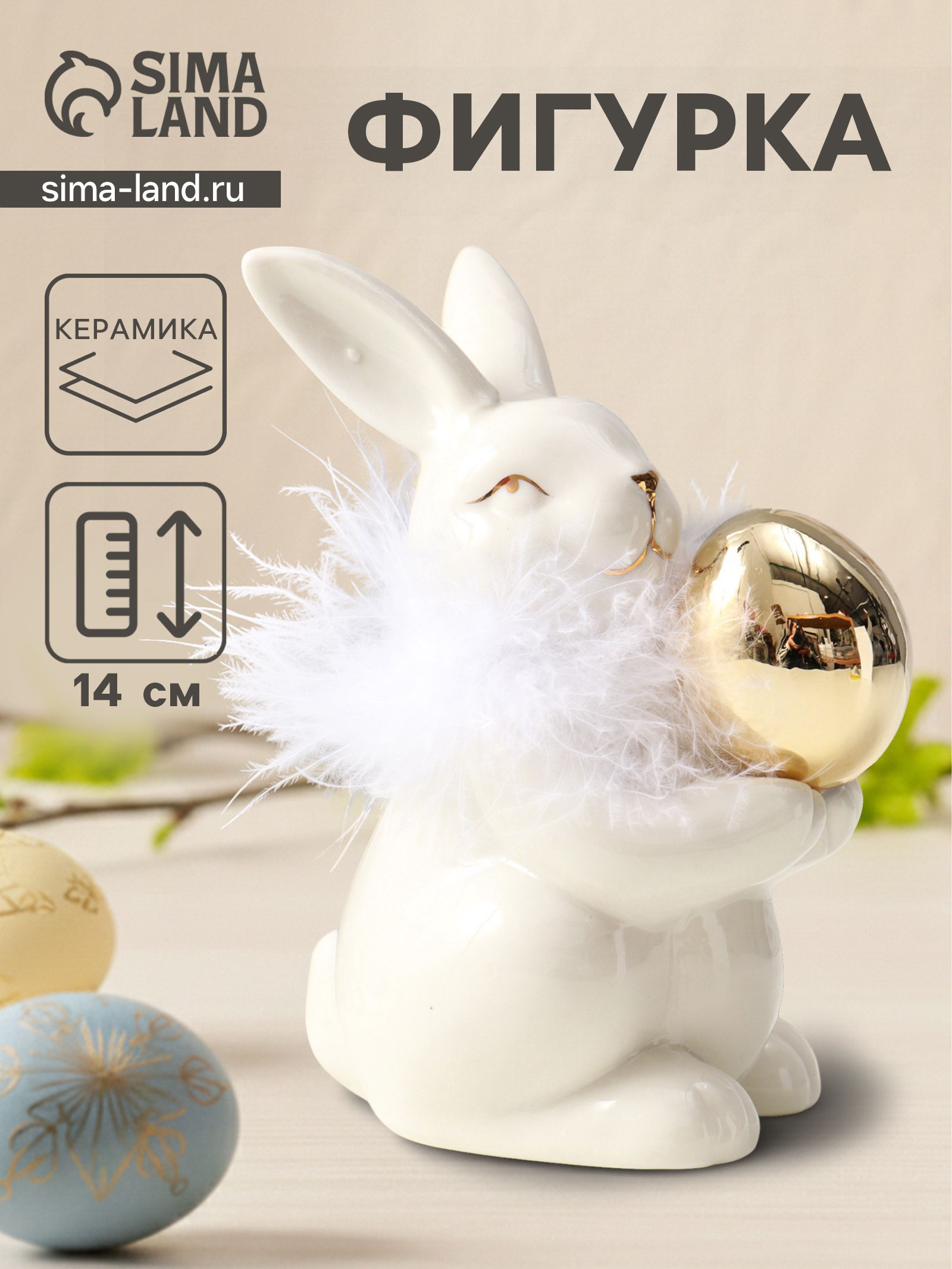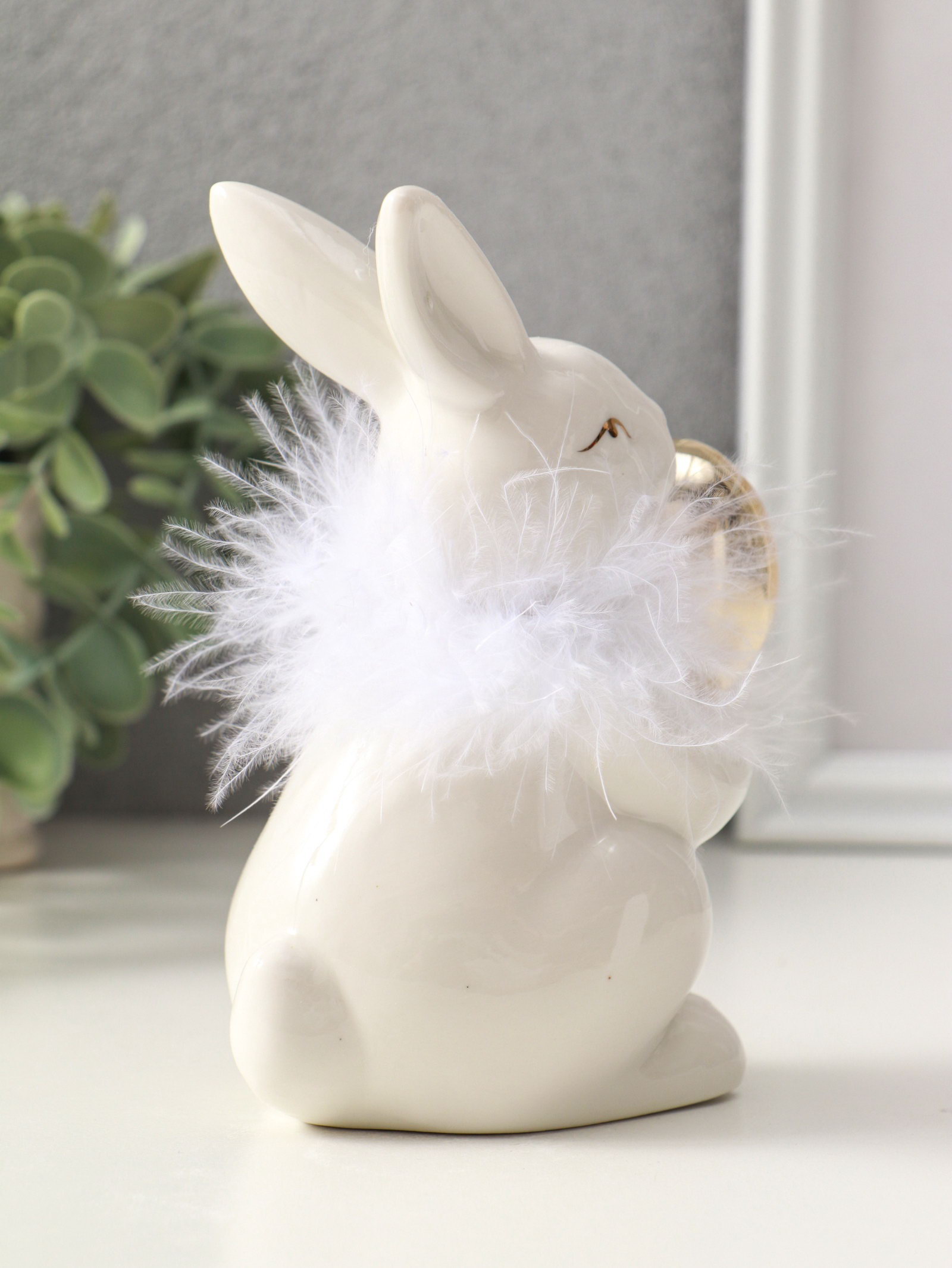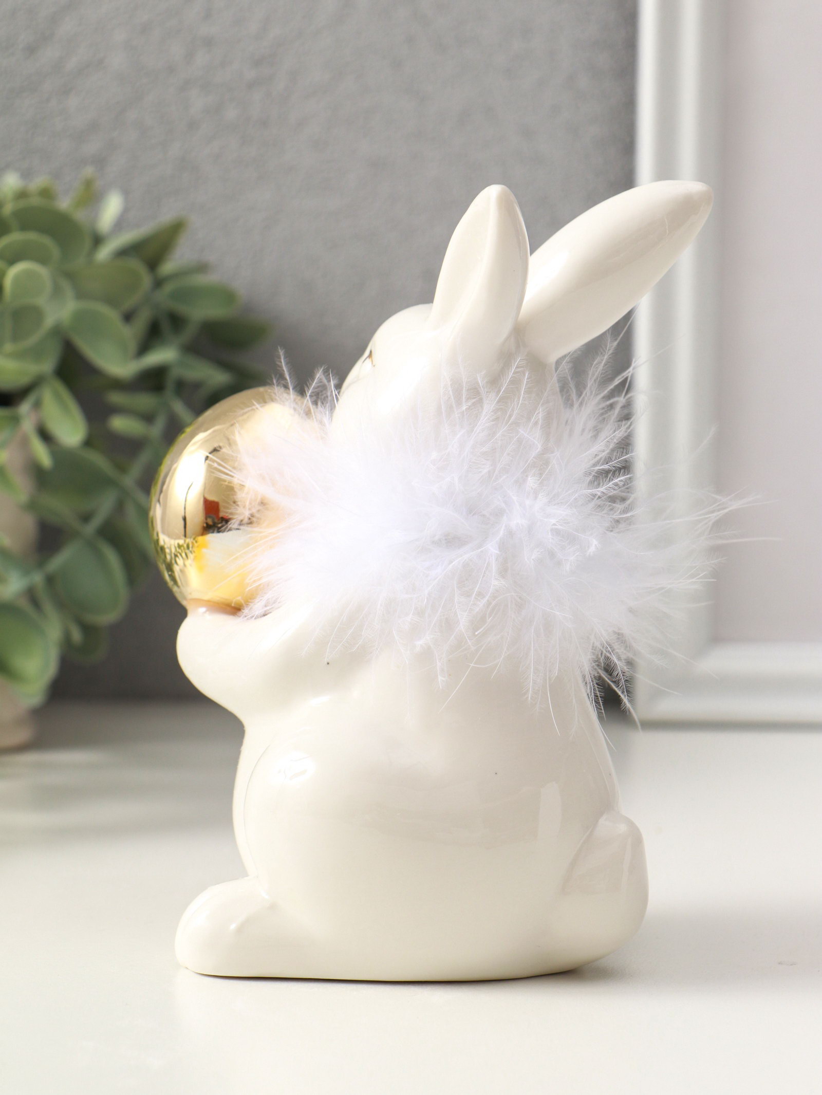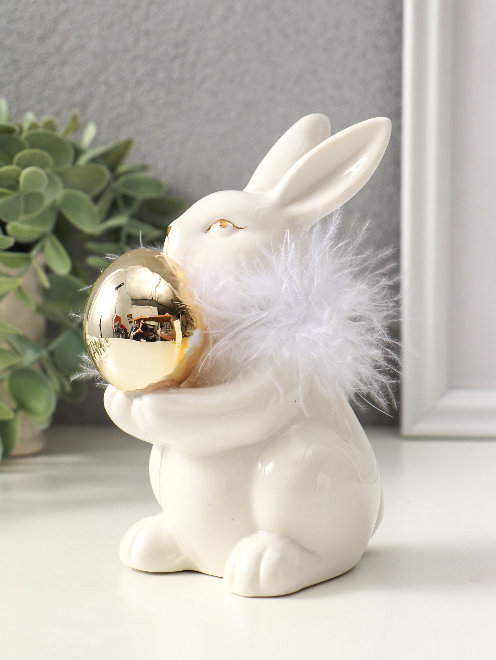 Фигурка "Зайка с золотым пасхальным яичком", керамика, пух, белый 8x10.5x14 см, 10.5x8x14 см., Китай