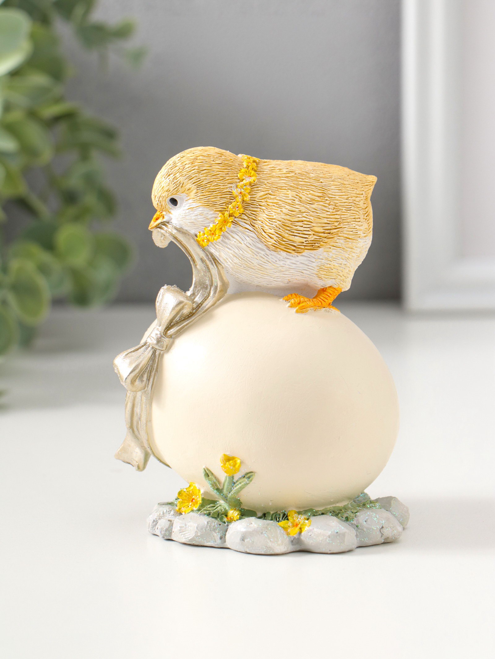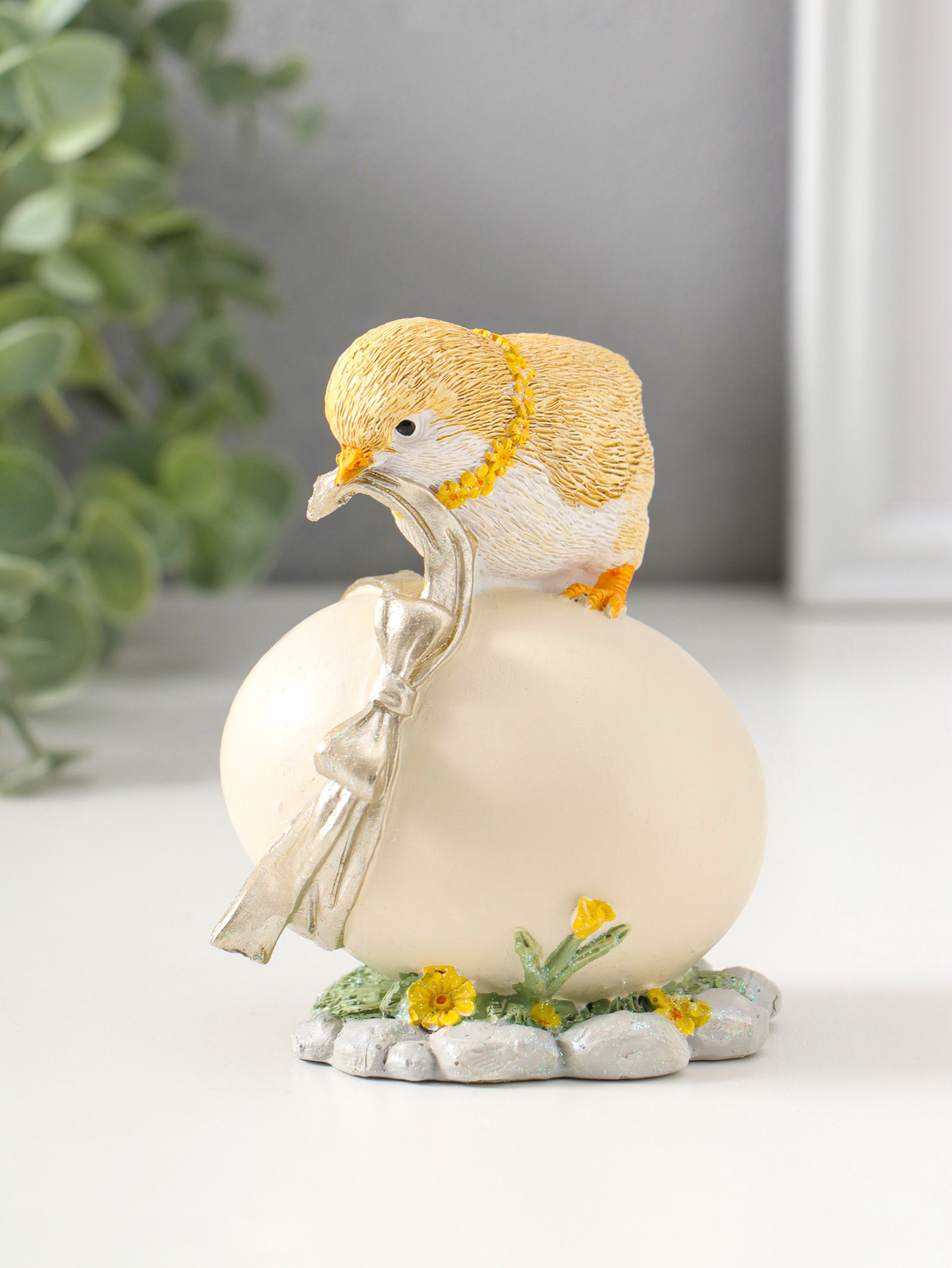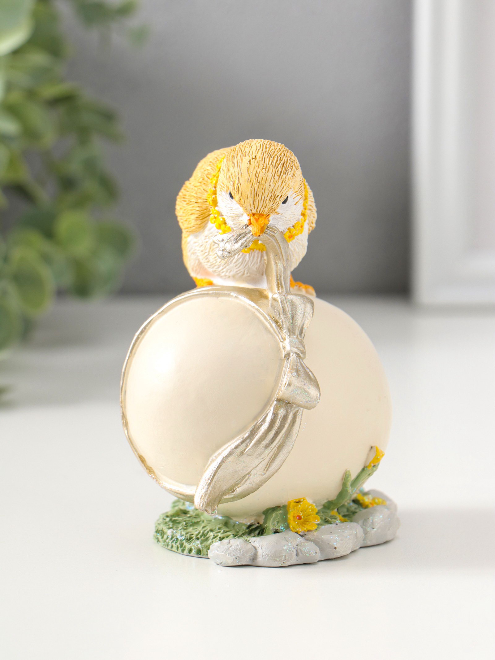 Фигурка полистоун "Цыплёнок завязывает подарочный бант на яйце", 11 см, 6.5x8.5x11 см., Китай