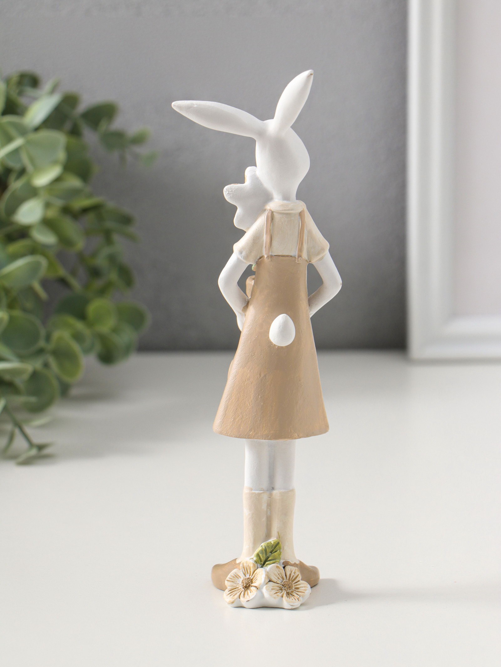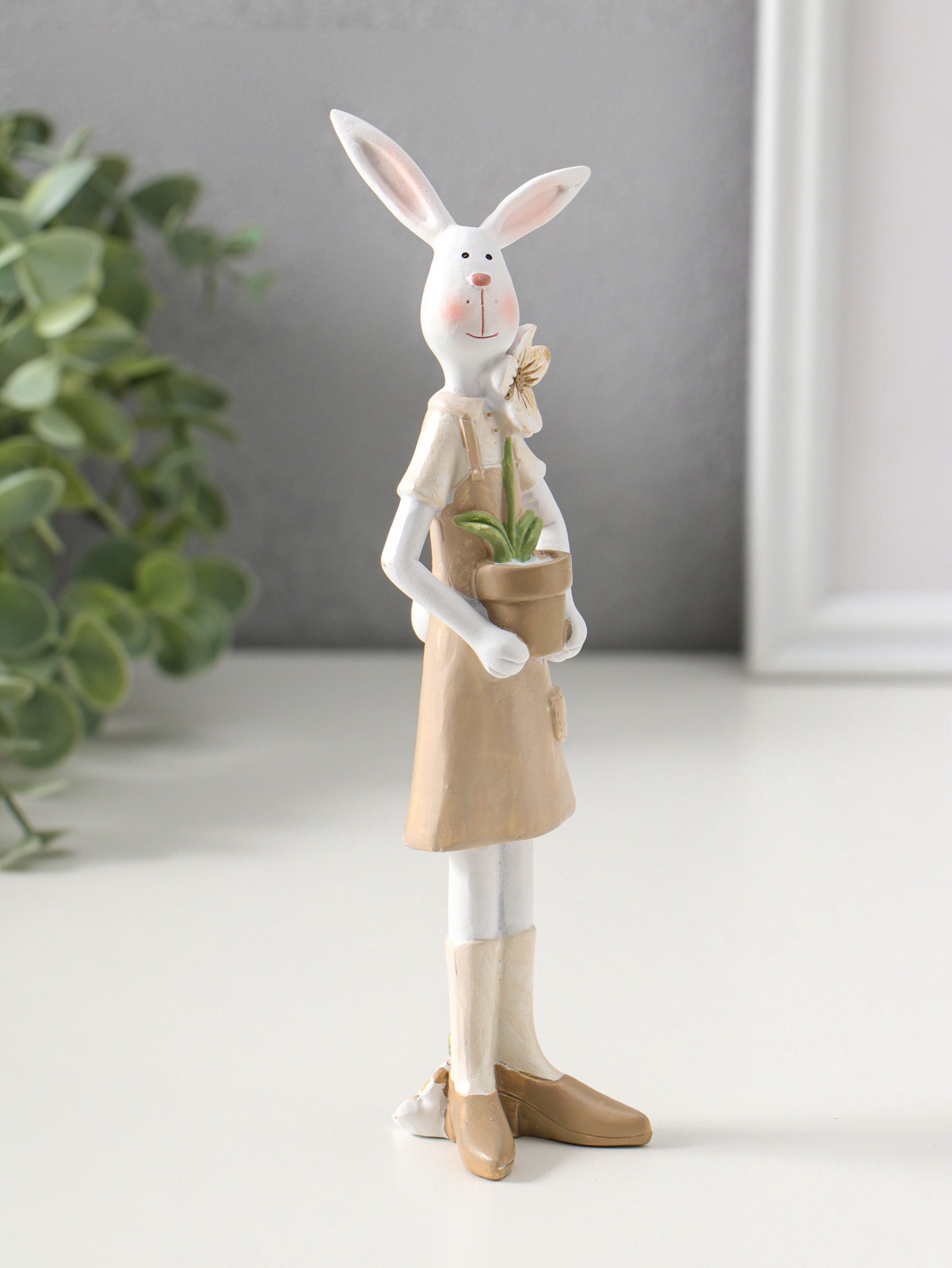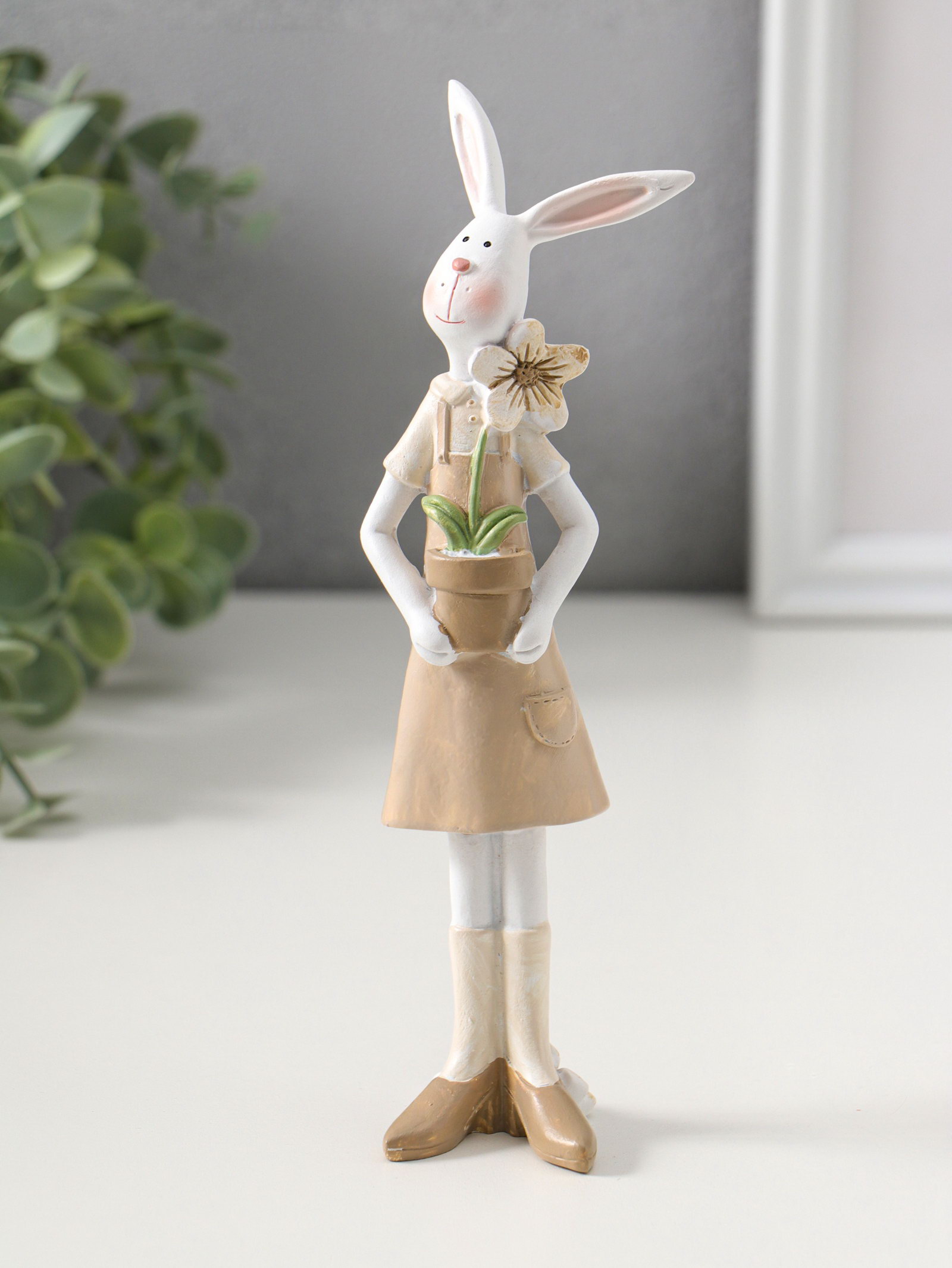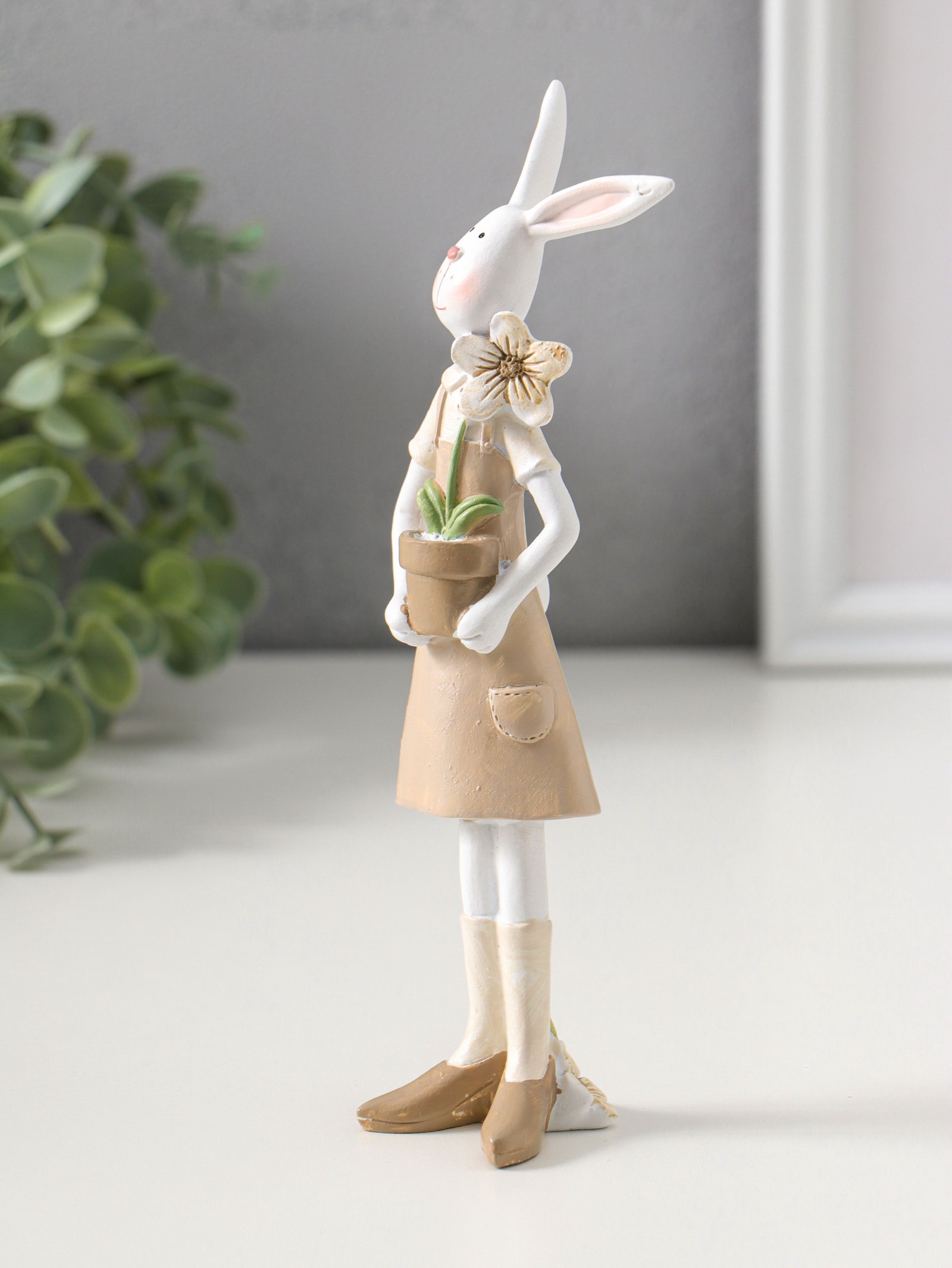 Фигурка полистоун "Зайка в бежевом сарафане с цветком в горшке", 19 см, 4.5x6x17 см., Китай