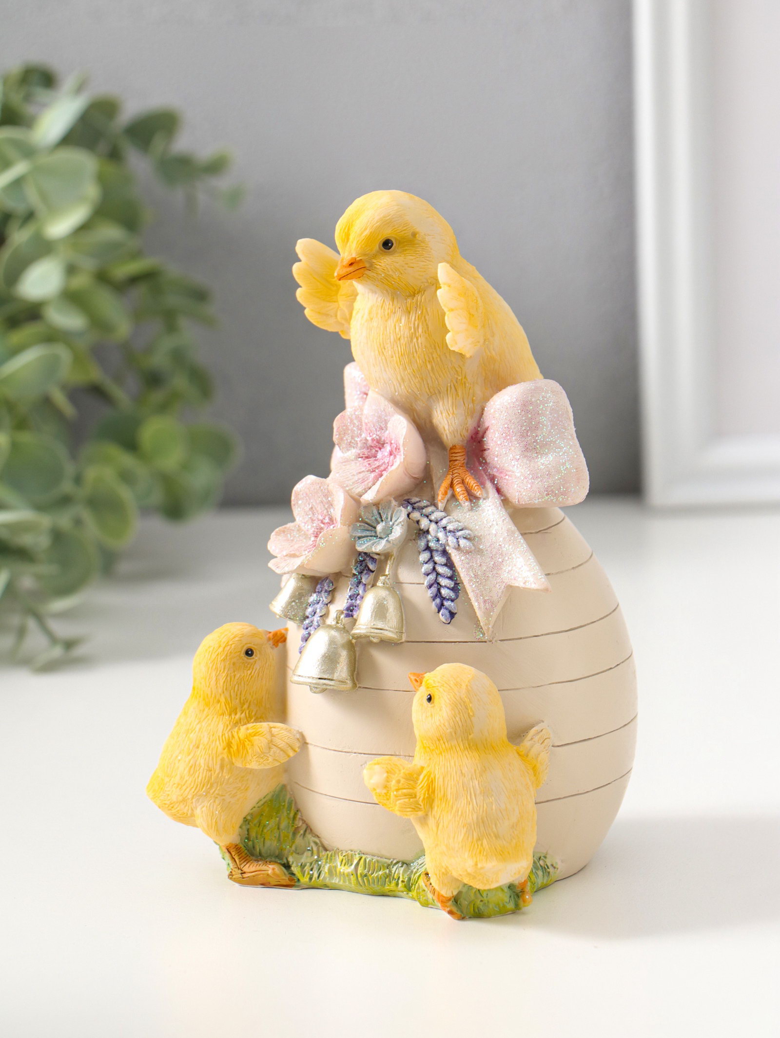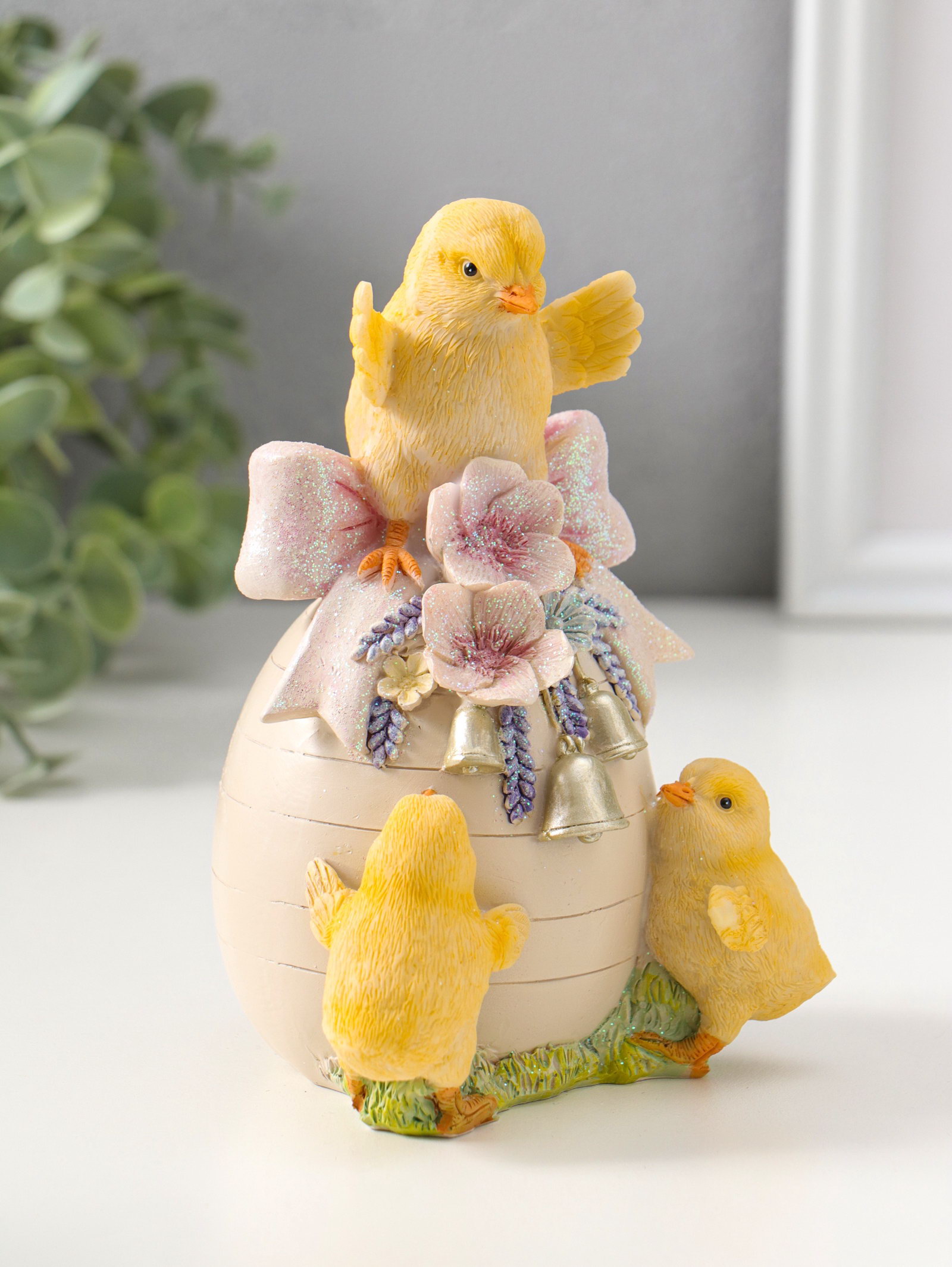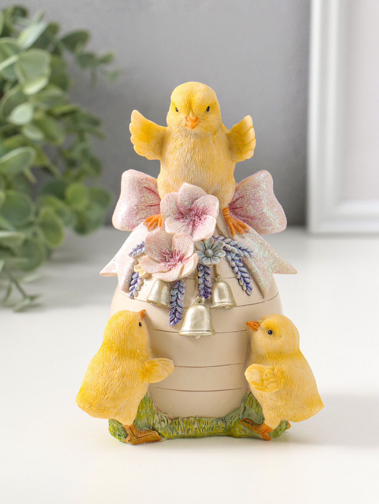 Фигурка полистоун "Цыплята с яичком с розовыми цветами и колокольчиками", 15 см, 9x10.5x15 см., Китай