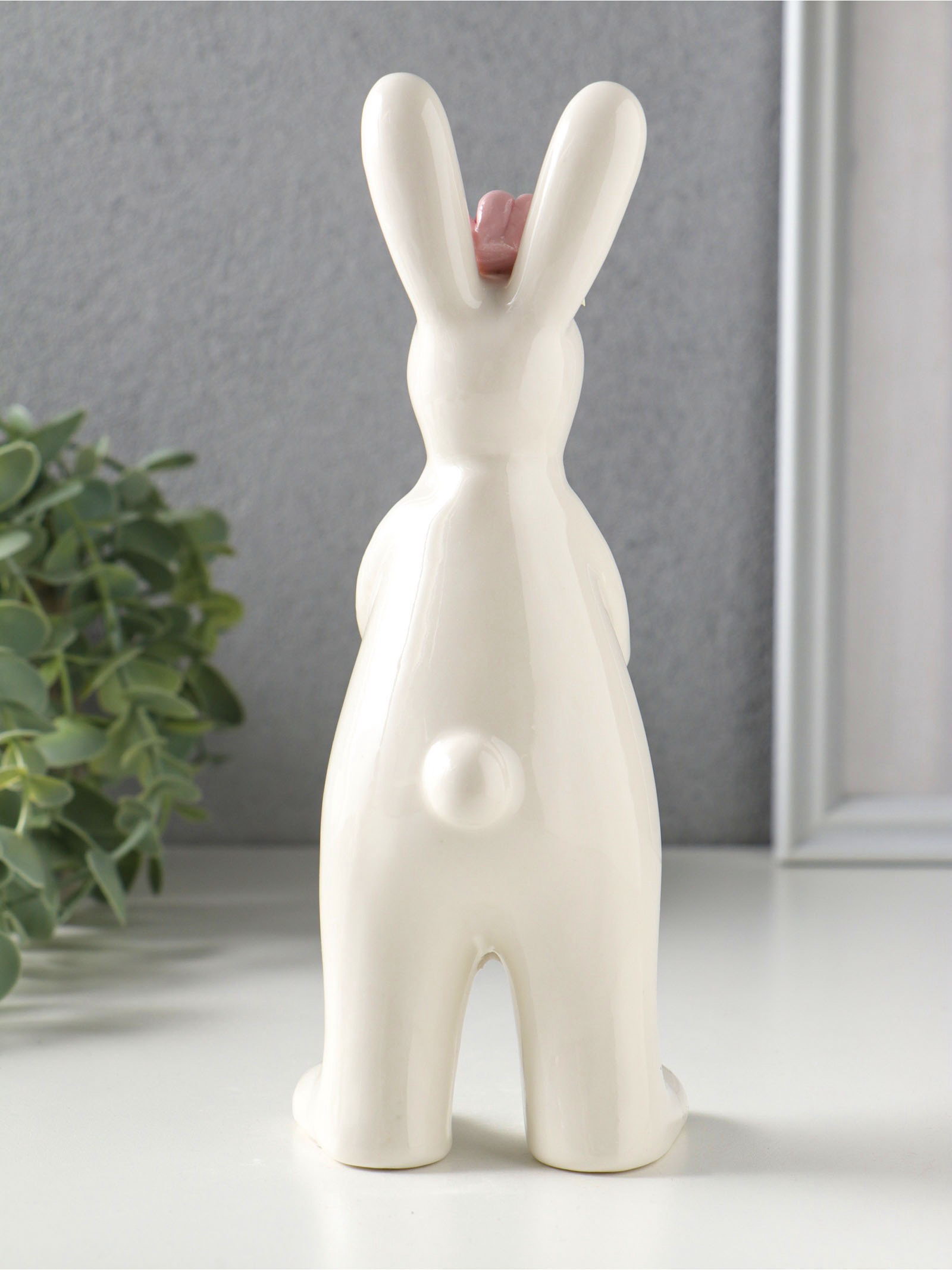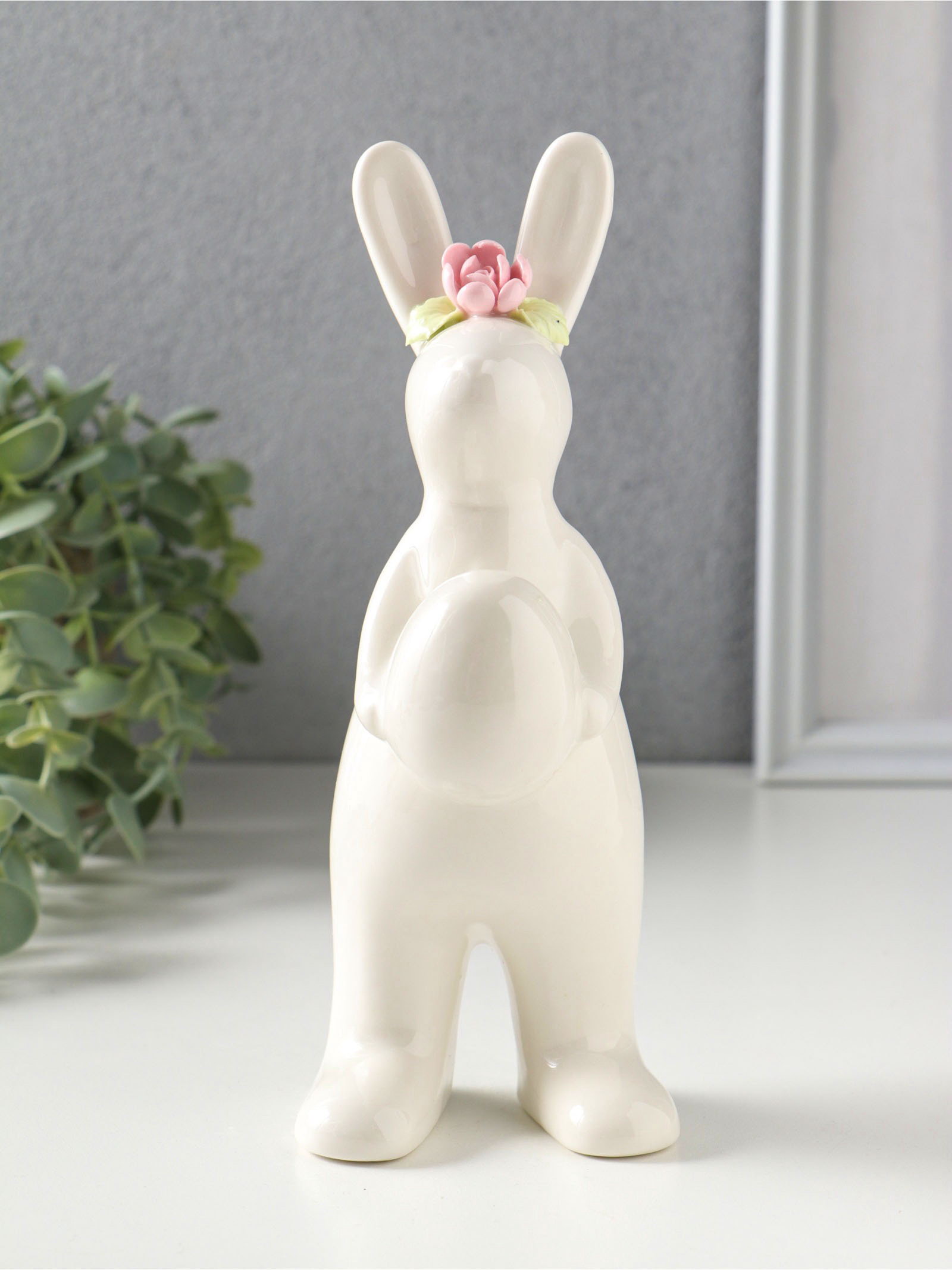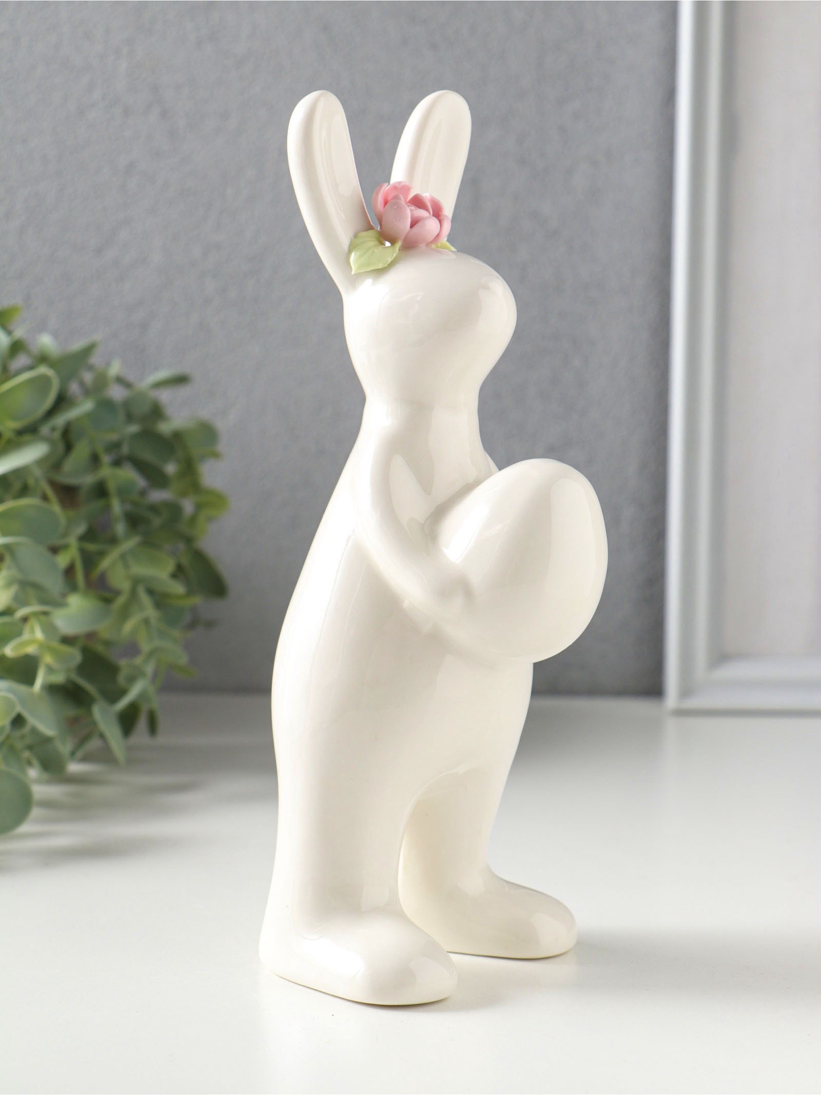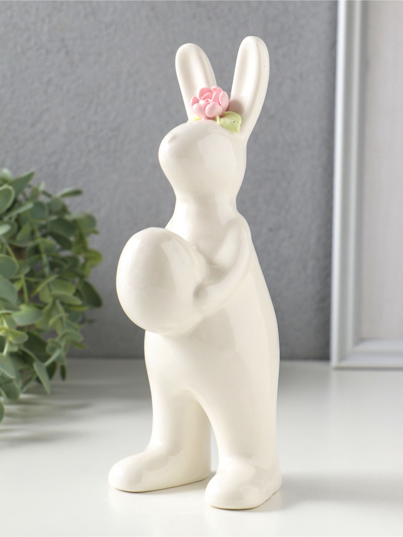 Фигура керамика "Белый зайчик с пасхальным яйцом, цветком на голове", 9x7.7x21 см, 9x7.7x21 см., Китай