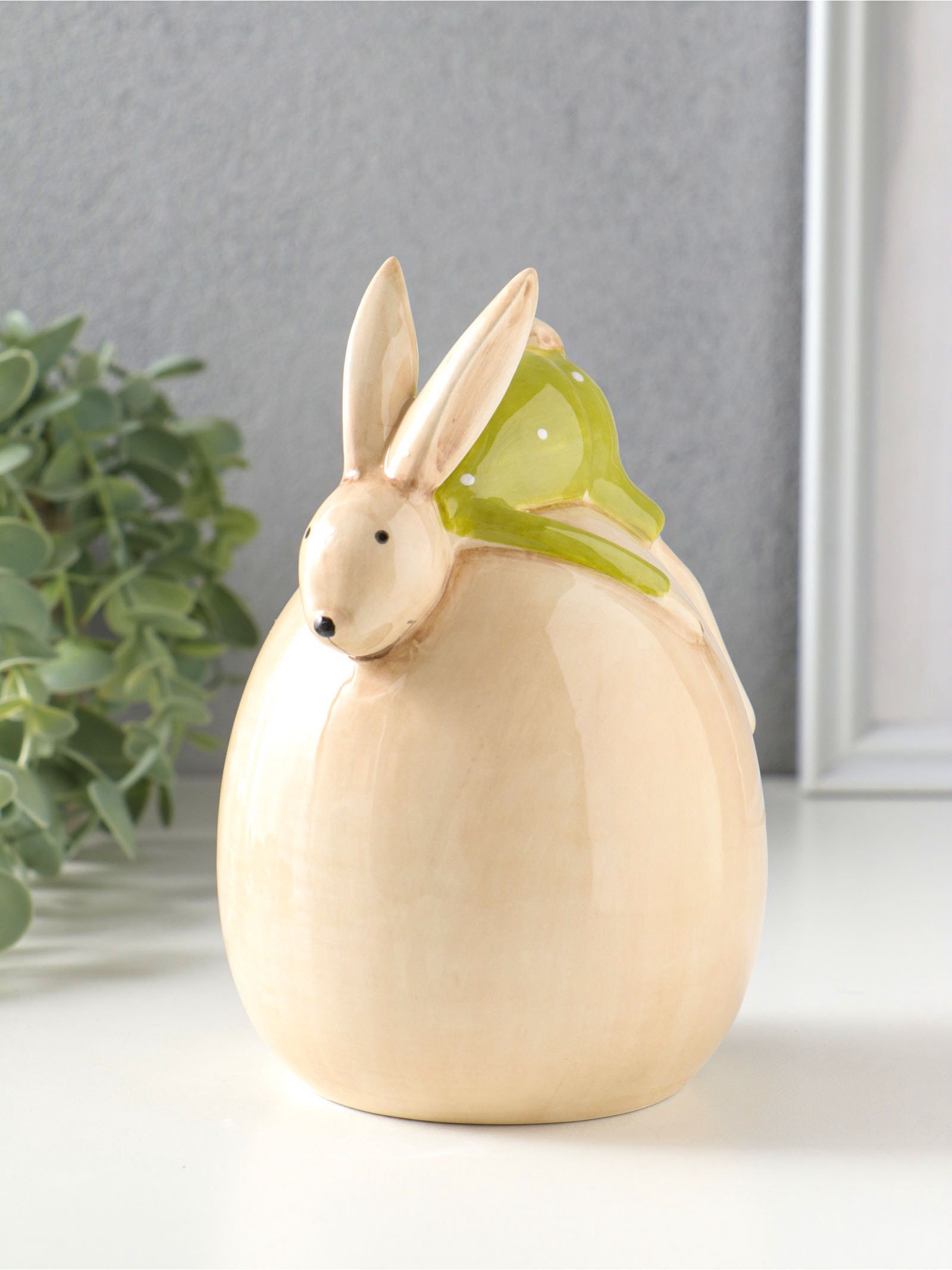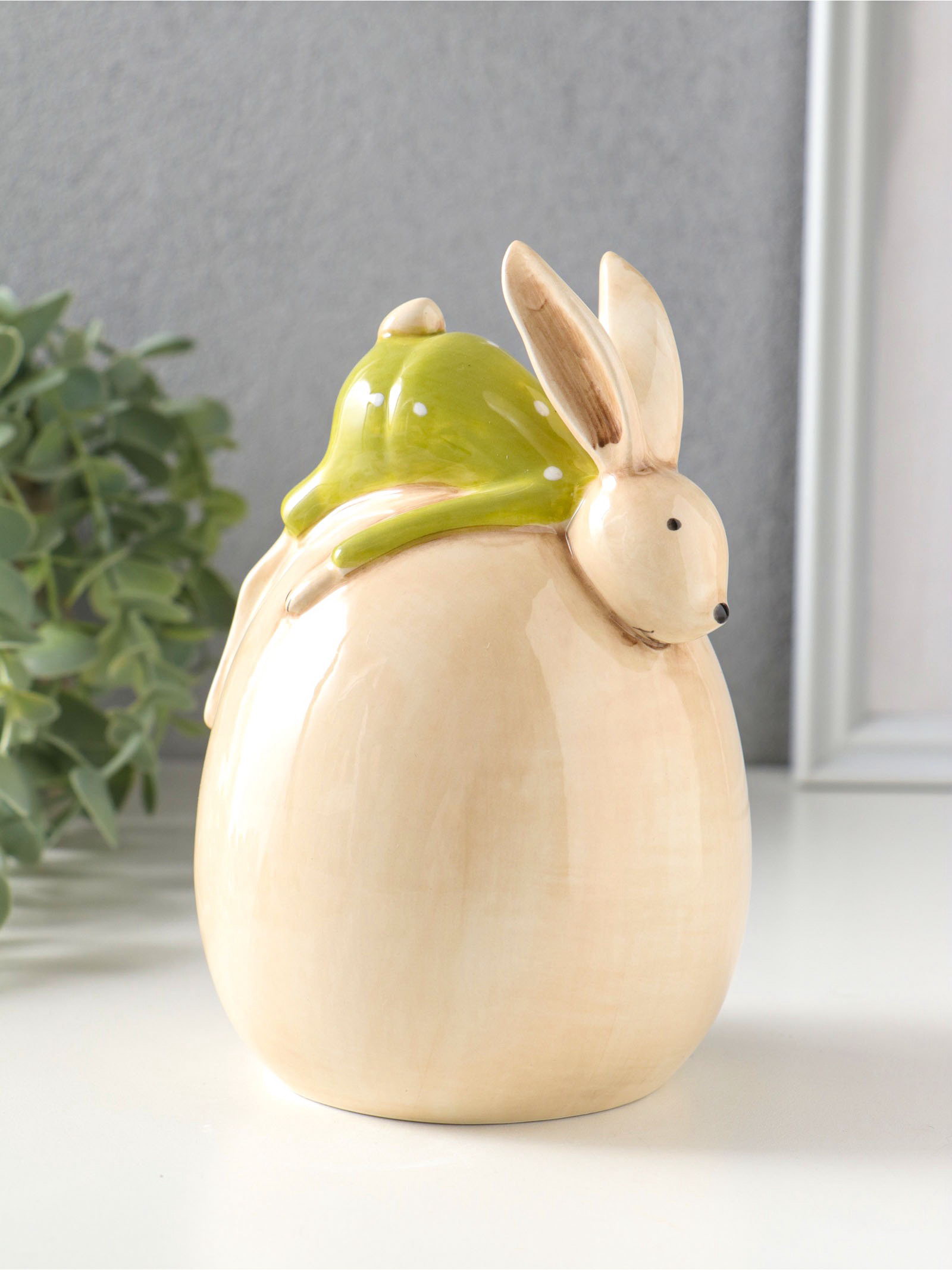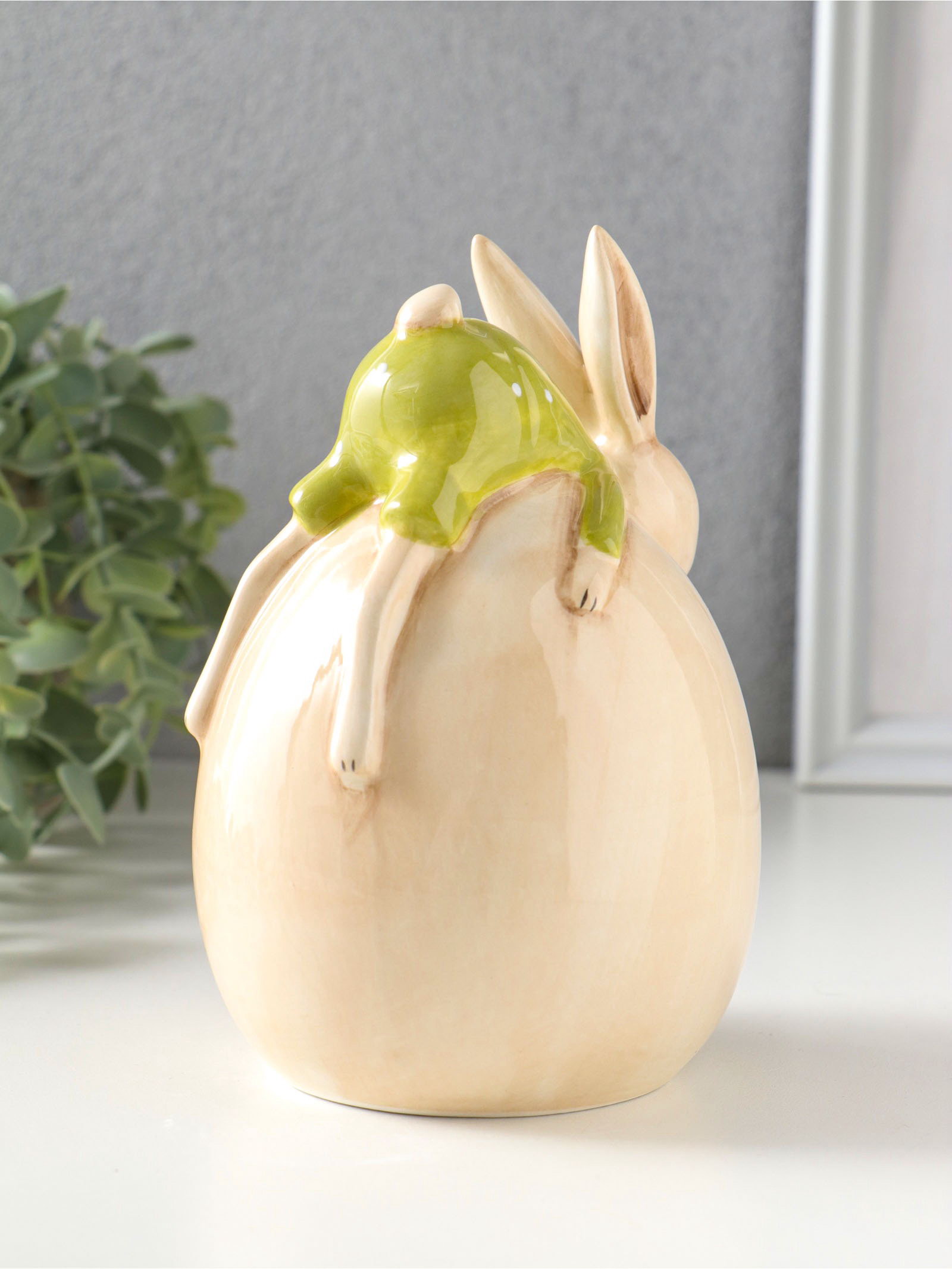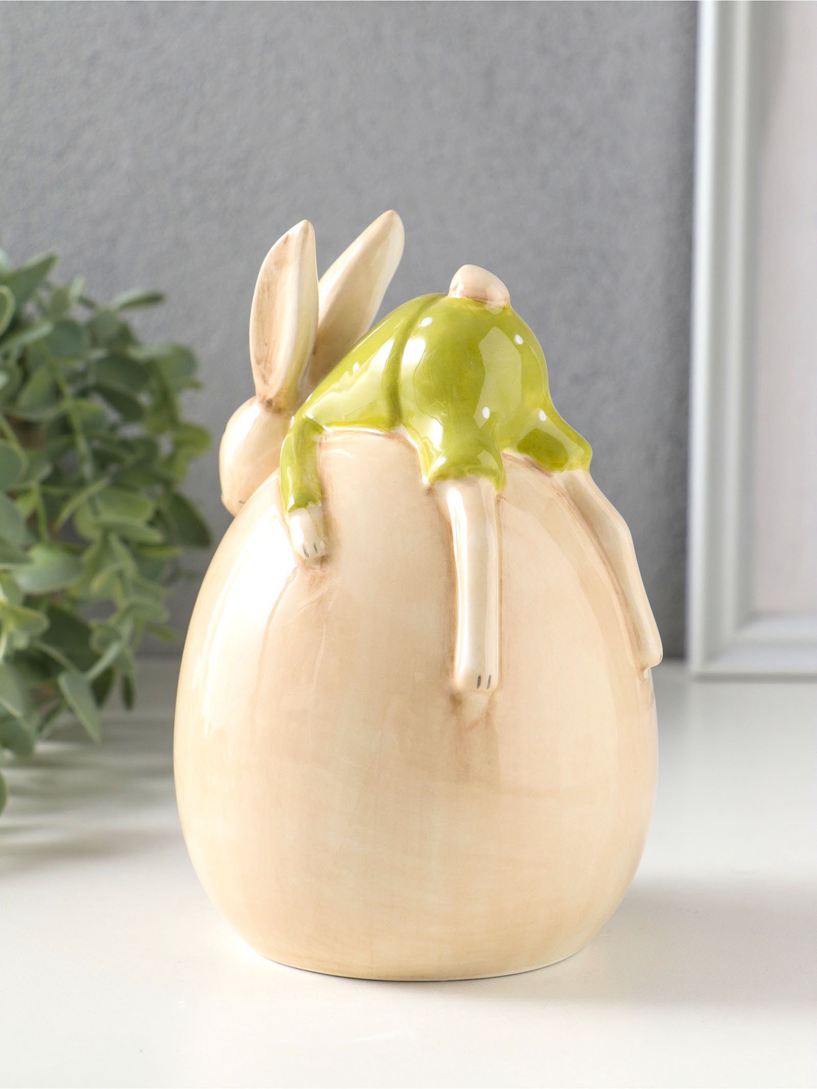Фигурка керамика "Зайчик в зелёном костюме, лежит на яйце", 10.4x10x14.9 см, 10.4x10x14.9 см., Китай