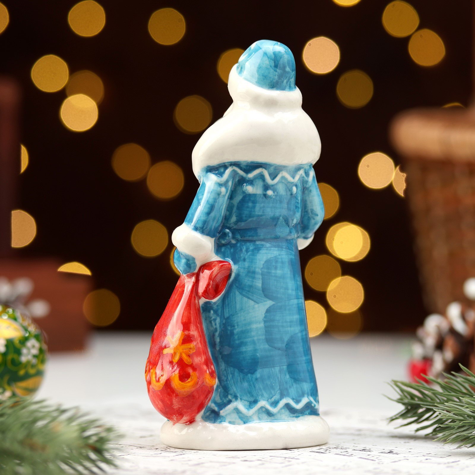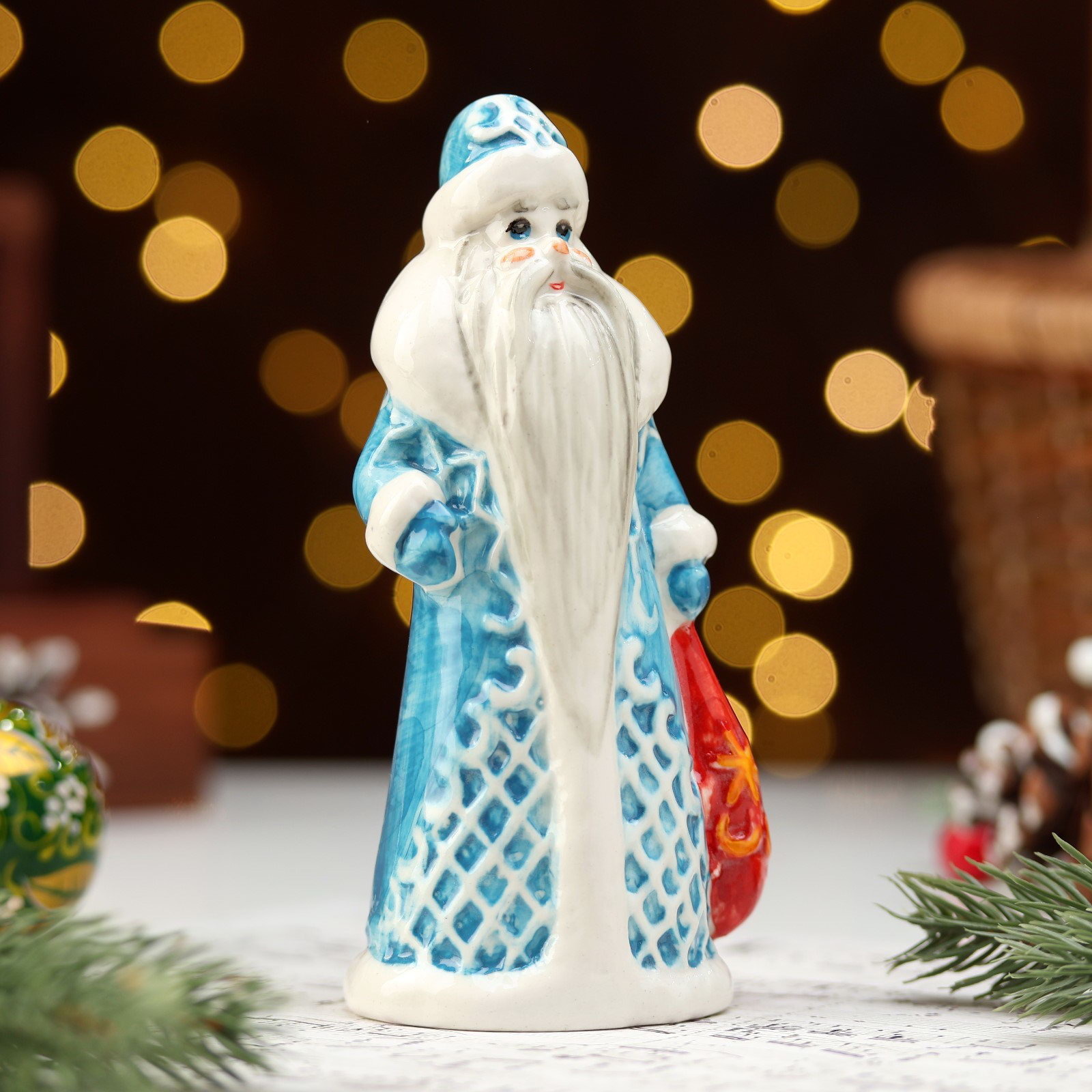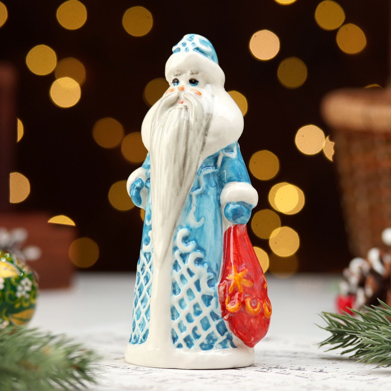 Фигурка фарфор "Дед Мороз с мешком голубая шуба", 14 см, Россия
